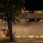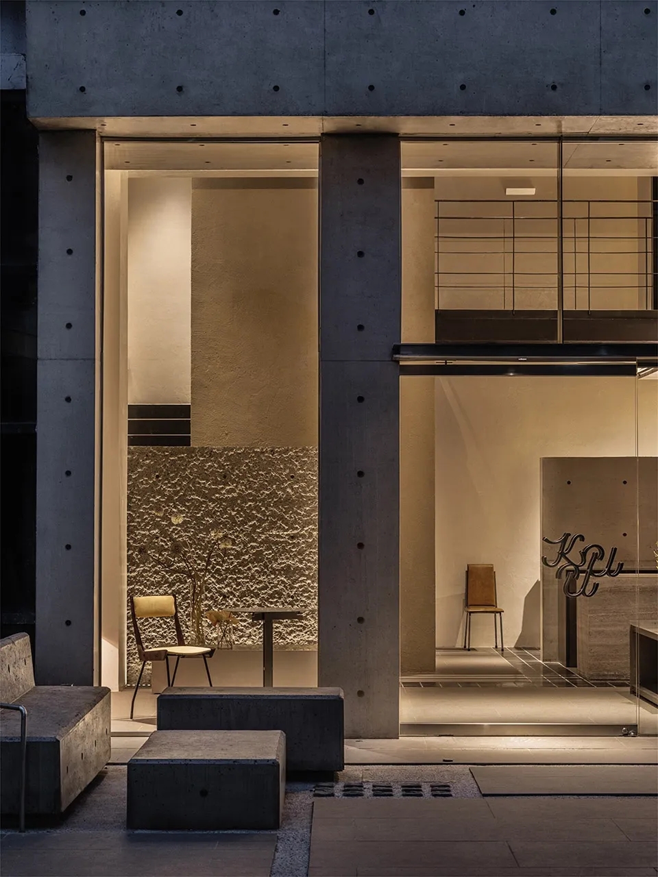 室内的花艺与室外的树影斑驳交错,彼此辉映。随风微微摇曳,光影之间,建筑不再是冰冷的载体,而是承载自然的一部分,让风、花、树叶,皆成为空间的诗行。黄昏落幕,灯光渐次点亮,空间的氛围也随之转换。日间的理性,隐匿在光影交错之下,夜晚的温柔,缓缓铺展。混凝土的肌理,在暖光映照下更加深邃,如同沉静的岩石,包裹着温暖的呼吸。