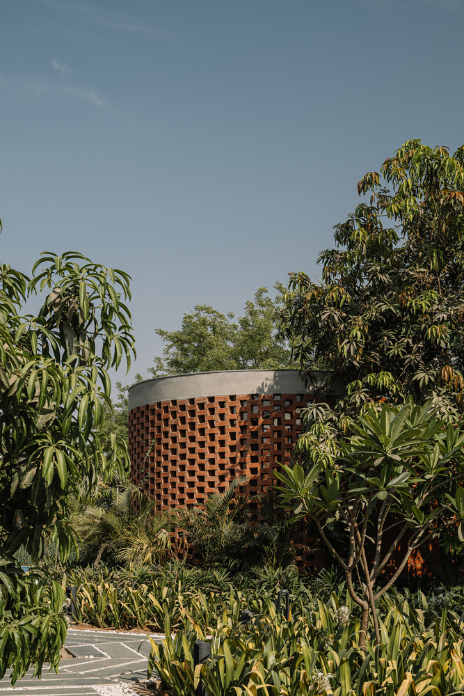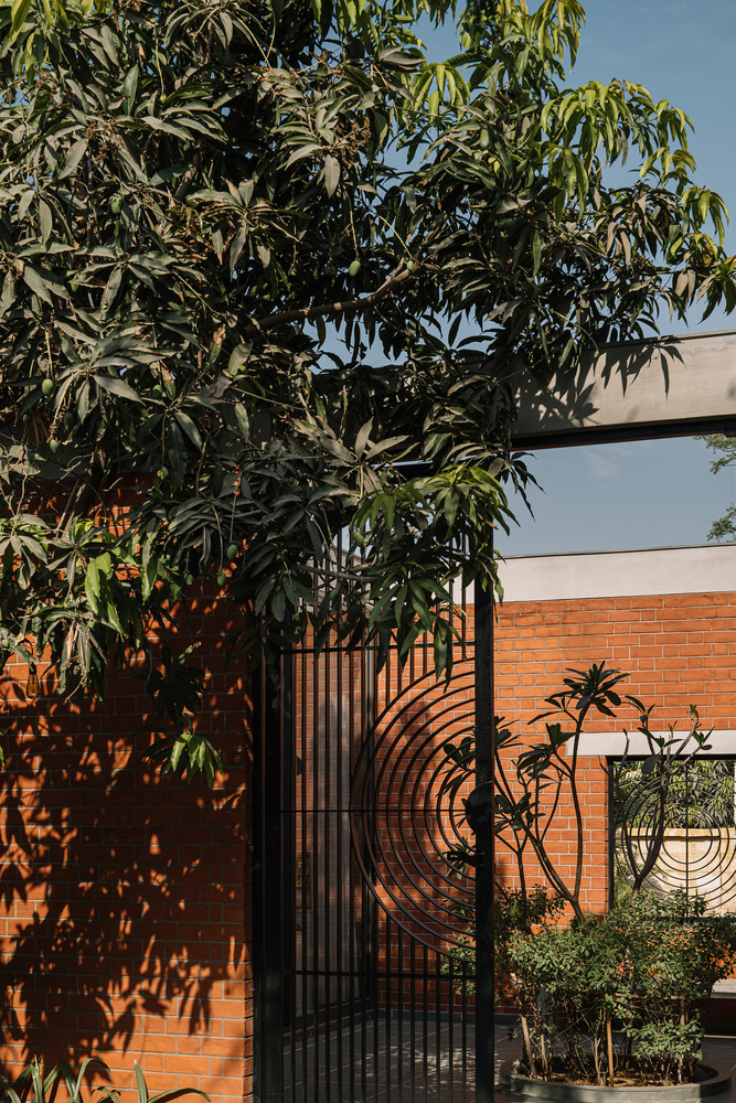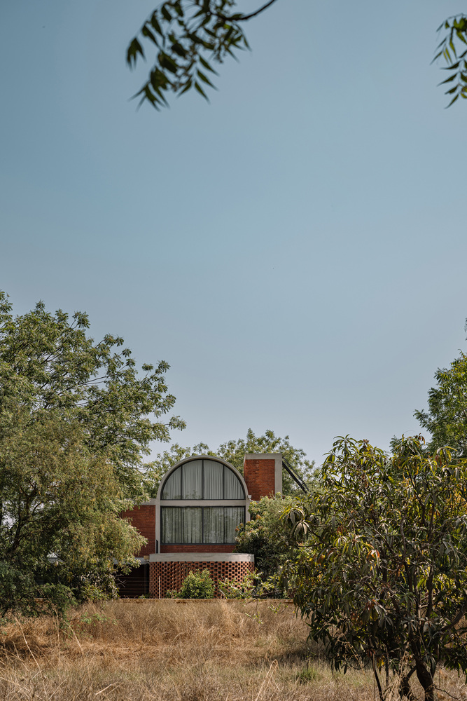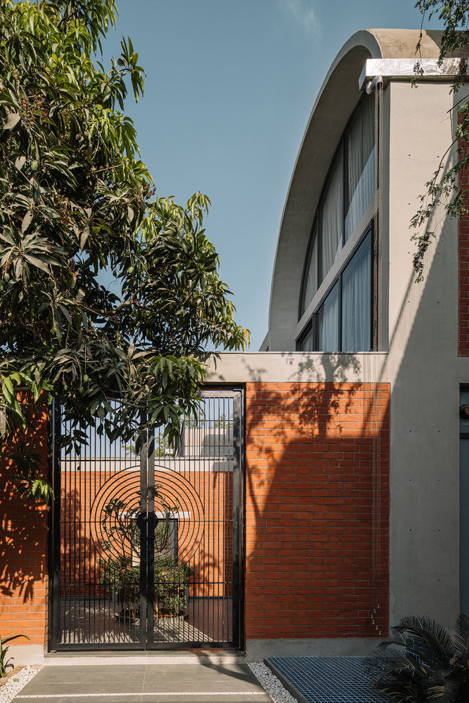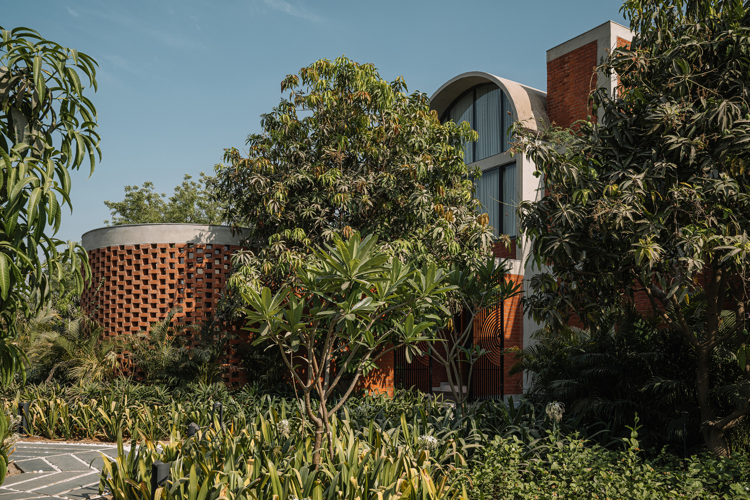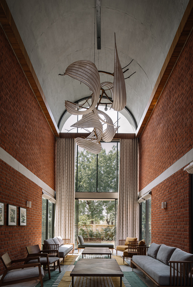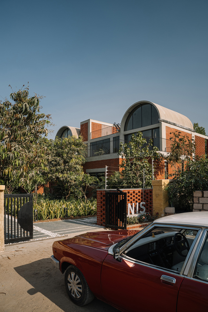 该乡村红砖别墅设计在艾哈迈达巴德(Ahmedabad)郊区一条芒果树成荫的街道尽头,一辆红色的老式 “康特萨”(Contessa)汽车静静矗立,宛如沉默的守护者 —— 这份怀旧情怀,为人们开启了对前方景致的期待。在一片绿意盎然的土地中央,坐落着 Teen Vaults 家庭住宅,建筑、工艺与舒适在此达成精致和谐的交融。