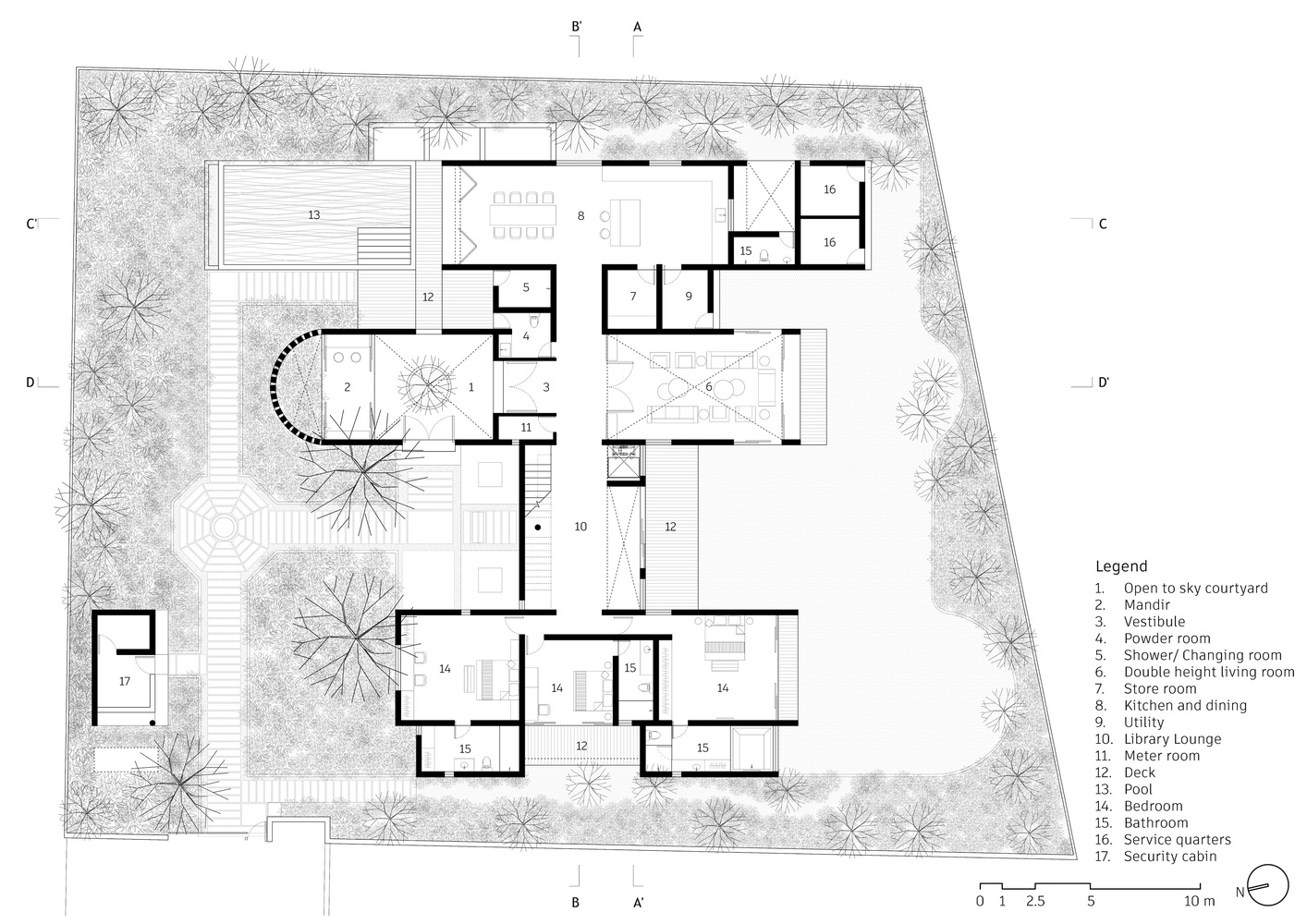 这座住宅的精髓,在于材料的本真表达。清水砖墙作为结构墙体,为线条纯粹的混凝土拱顶营造出富有触感的背景。 Bharat Floorings 品牌的米白色水磨石地板遍布全屋,表面点缀着低调的色彩斑点,与柚木实木定制家具及黄铜细节相得益彰。空调、电气与照明系统均采用外露式设计,被视为建筑本身的一部分,而非需隐藏的次要辅助设施。