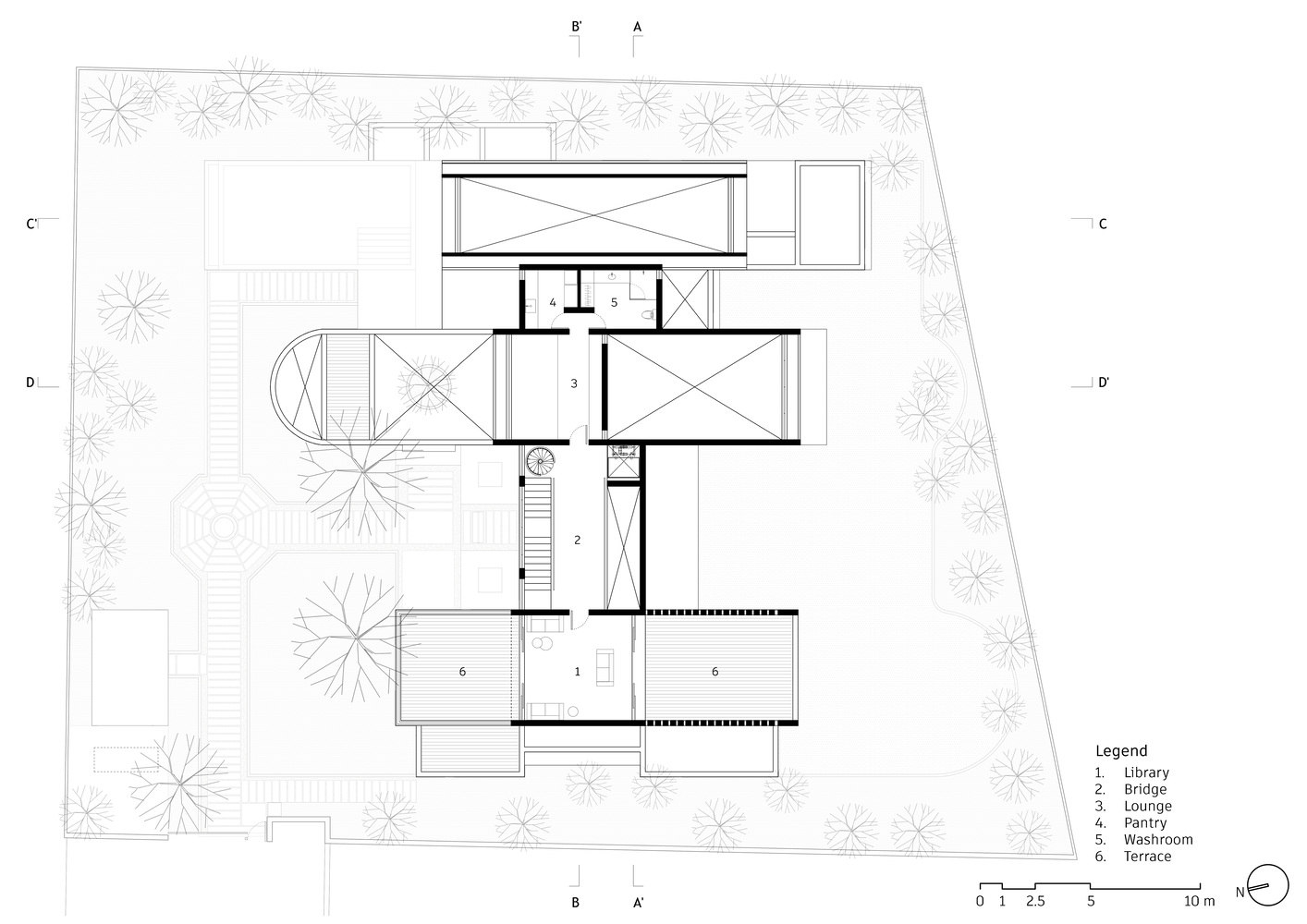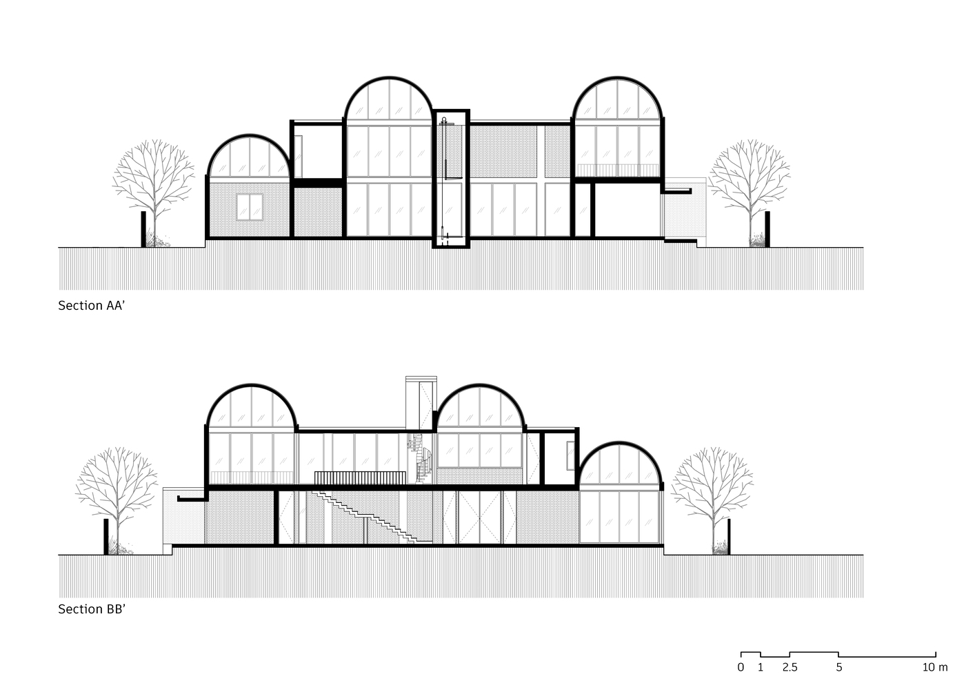 该项目最初定位为带泳池与凉亭的周末休憩之所,随后却逐渐承载起新的功能。业主是一对育有两个孩子的夫妇,他们被这片土地的宁静所吸引,决定将其改造成永久居所。最终,住宅以三组平行的清水混凝土拱顶为核心形态,构成富有冥想氛围的建筑整体,每组拱顶功能各异:第一组包含厨房与餐厅,第二组为宽敞的正式客厅,第三组则是专属的学习与阅读空间。