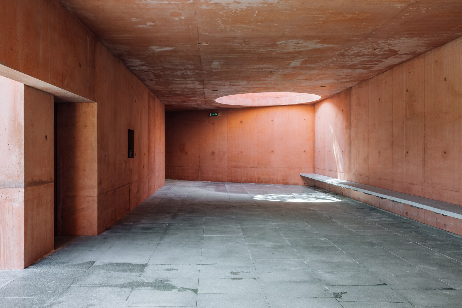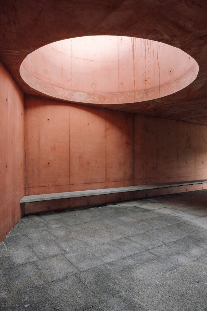 挡土墙采用钢筋混凝土建造,其组成成分中加入了氧化铁颜料,最终与裸露的岩石相接 —— 这些岩石也成为了整个建筑群的视觉焦点之一。这种设计模糊了建筑、结构、景观与场地本身之间的边界,让人难以分辨它们的起始与终结之处。
