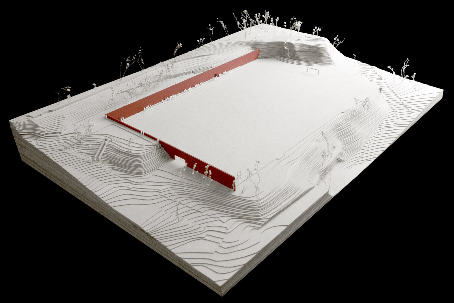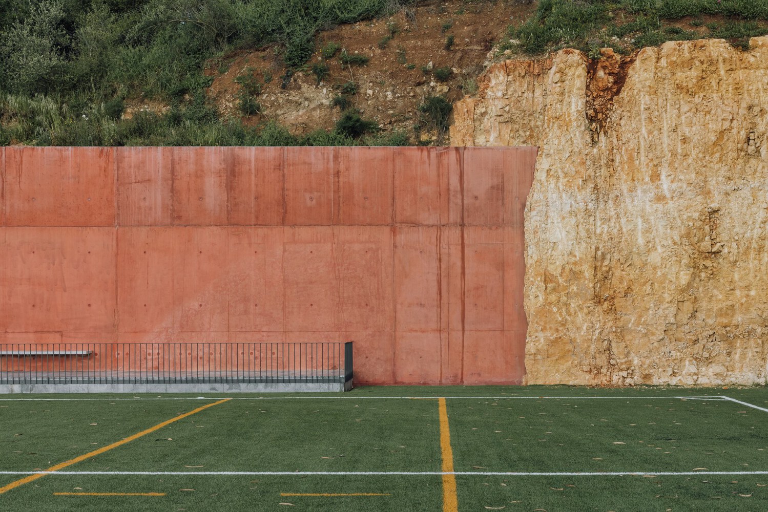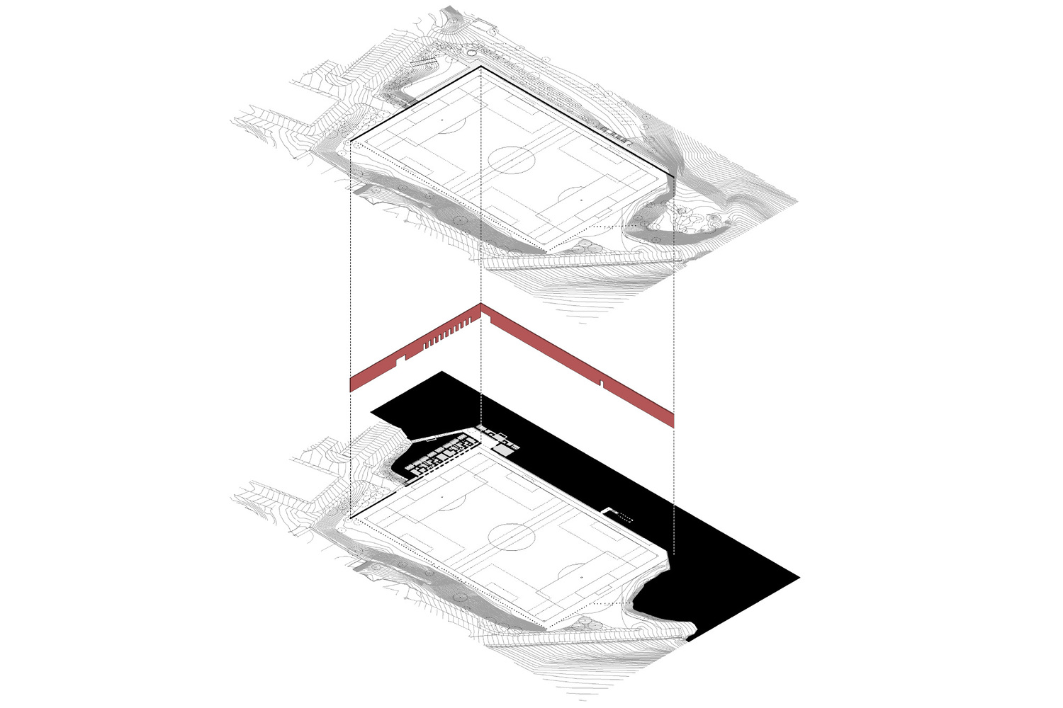 拉热足球场设计项目的核心是一道混凝土挡土墙。这是一道精准的 “L” 形挡土墙,它在倾斜的山坡上界定并打造出一片平坦的足球场区域,同时设计出一道拱廊,作为通往地下配套设施的入口。