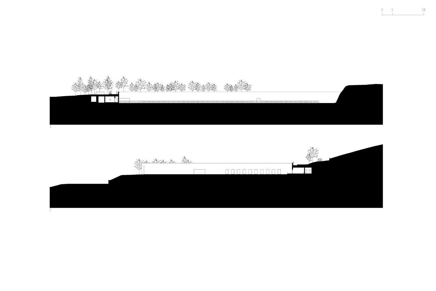 入口处设有一条坡道,延伸至山体内部并缓缓向下,最终抵达与草坪齐平的有顶中庭,从中可通往一排连续的看台座椅。这里没有第二层观众席。在上方的平台区域,新开辟的高地从公共空间处提供了一处非正式的观赛视角,可俯瞰整个球场,宛如一座观景台。