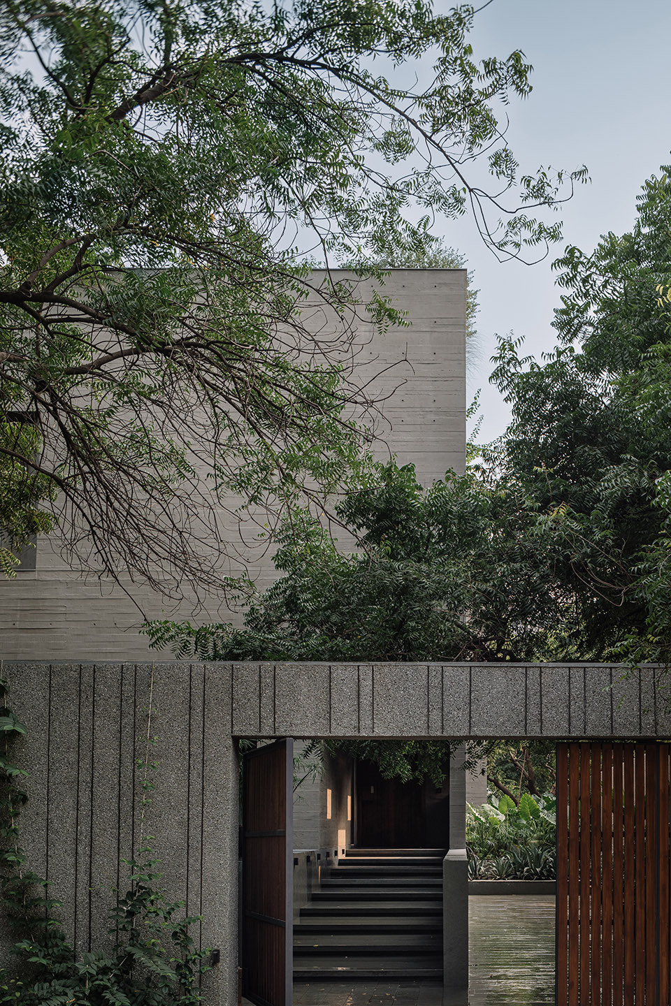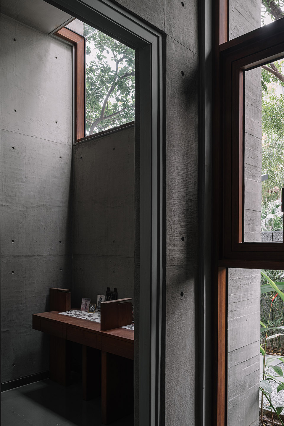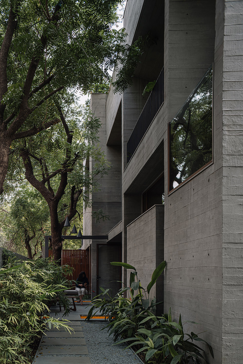 建筑外立面采用带木纹质感的混凝土饰面,其肌理与树干纹理形成隐性对话,消解了混凝土的冰冷感,赋予结构可触摸的亲和力。立面上的方形孔洞与深斜窗台,既强化了粗野主义的几何特征,又通过光影变化柔化了建筑的视觉印象,让混凝土在绿荫中自然 “隐退”。室内以混凝土、石灰抹灰墙面与灰色 Kota 石地面为基础,构建起室内外一致的设计语言。