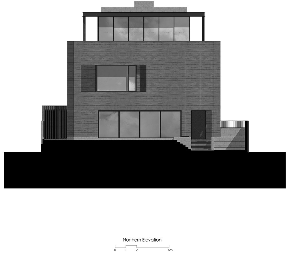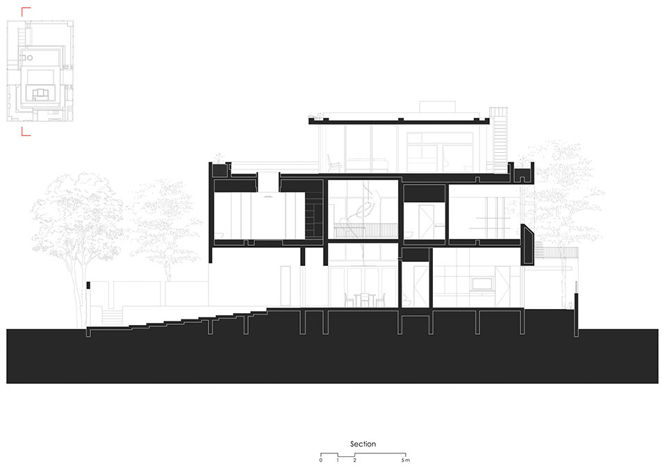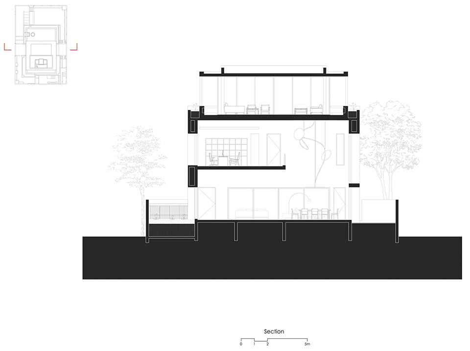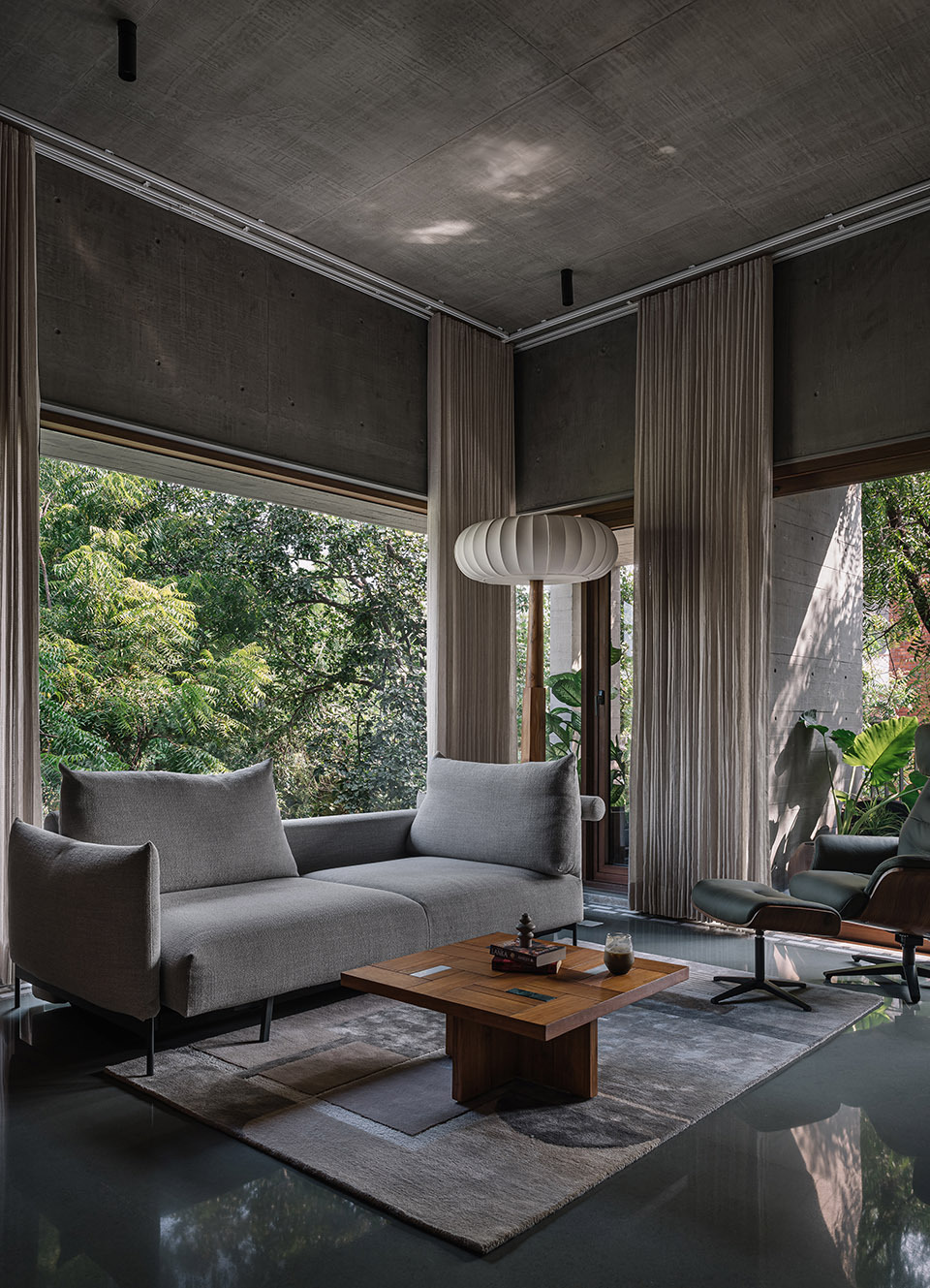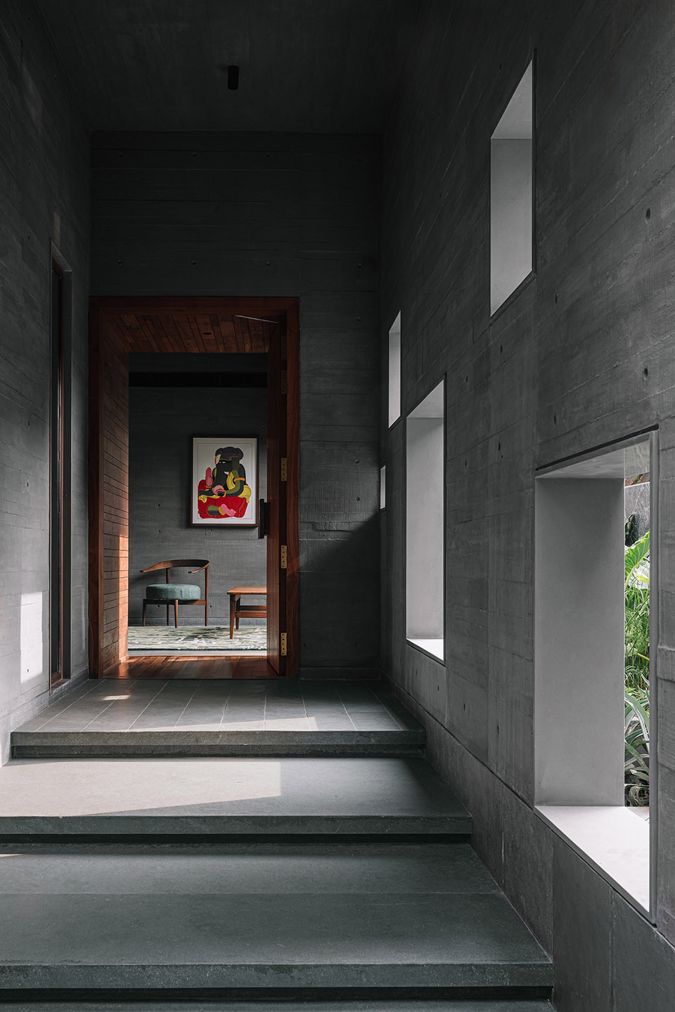建筑外立面采用带木纹质感的混凝土饰面,其肌理与树干纹理形成隐性对话,消解了混凝土的冰冷感,赋予结构可触摸的亲和力。立面上的方形孔洞与深斜窗台,既强化了粗野主义的几何特征,又通过光影变化柔化了建筑的视觉印象,让混凝土在绿荫中自然 “隐退”。室内以混凝土、石灰抹灰墙面与灰色 Kota 石地面为基础,构建起室内外一致的设计语言。