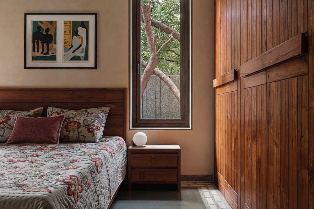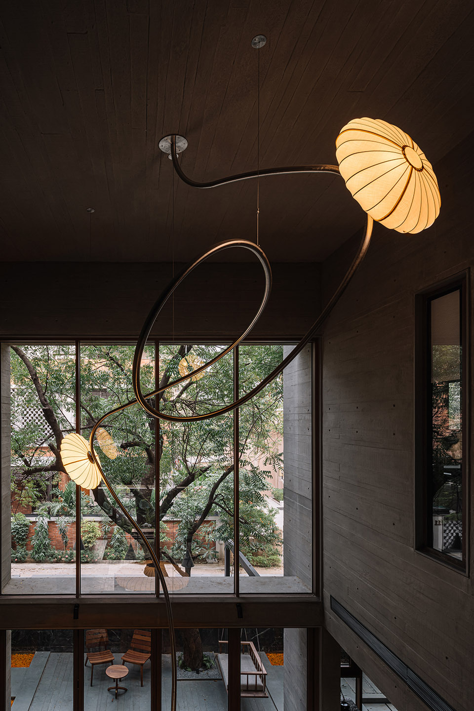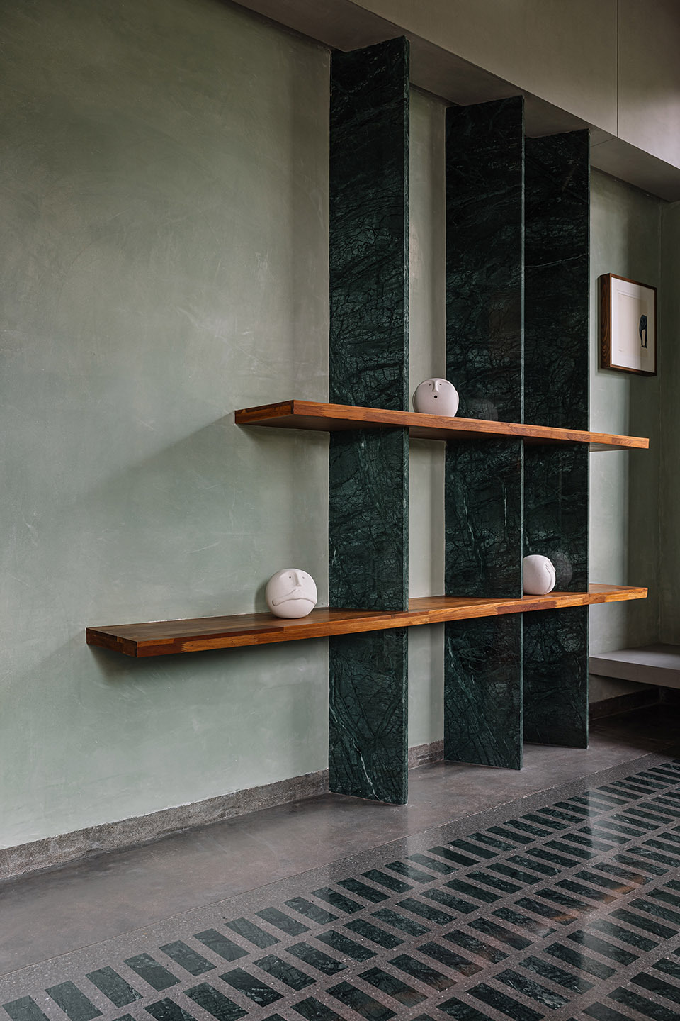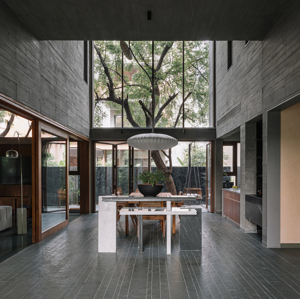 皮质磨面的 Kota 石延续混凝土肌理,让中央挑空区宛如 “户外空间”;局部无缝抛光的 Kota 石则为餐区提供简洁背景,与紫檀细节的定制餐桌、柚木藤编椅子形成材质对比,在冷硬中注入温暖。可持续柚木饰面、胶合板模板混凝土表面、Jaipur Rugs 抽象地毯等材质的运用,进一步中和了粗野主义的锐利感。尤其是木质天花与家具的自然纹理,与印度楝树的树干形成视觉呼应,让空间在材质碰撞中达成 “冷与暖” 的平衡。