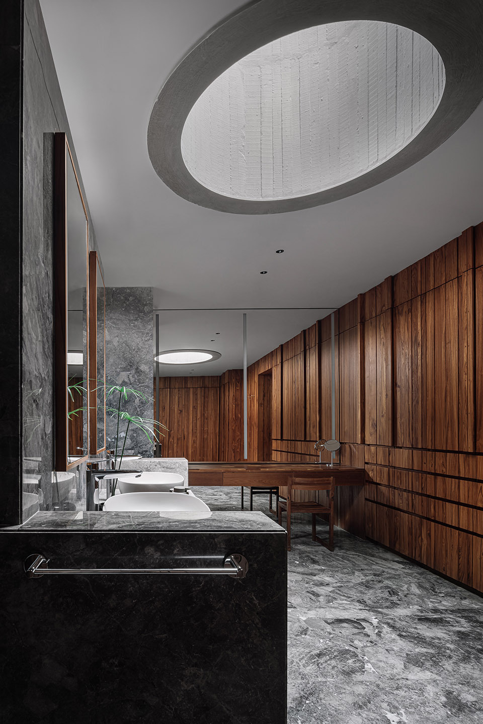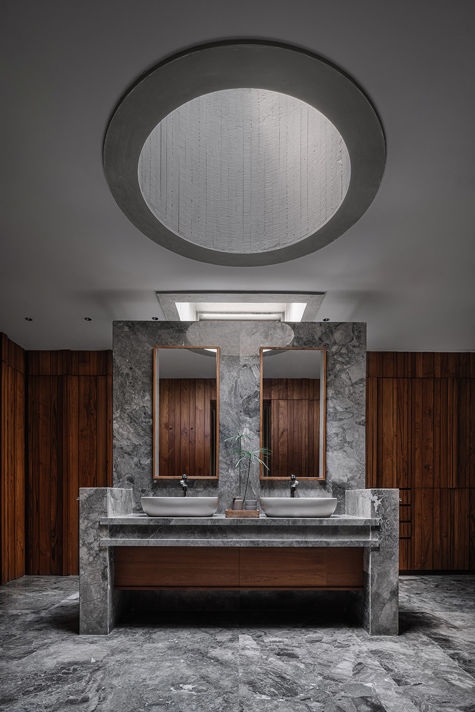 建筑立面的方形孔洞、深斜窗台与室内的狭长窗框,共同构成精准的采光系统,让自然光线均匀分布于各个空间。浴室设计尤为精巧 —— 主卫通过圆形与方形双天窗引入自然光,露台盥洗室则以整面玻璃取景缅栀树,营造出私人庭院的静谧氛围。定制混凝土洗手台延伸至地面,搭配木百叶保障私密性;剩余木材被再利用制成定制家具,废弃大理石改造为客厅玄关桌,既减少施工浪费,又让空间细节充满 “在地性” 与故事感。起居区划分的两个功能聚落,分别搭配定制沙发、Eames 椅与布艺灯具、抽象地毯,在统一风格中营造丰富层次的居家氛围。