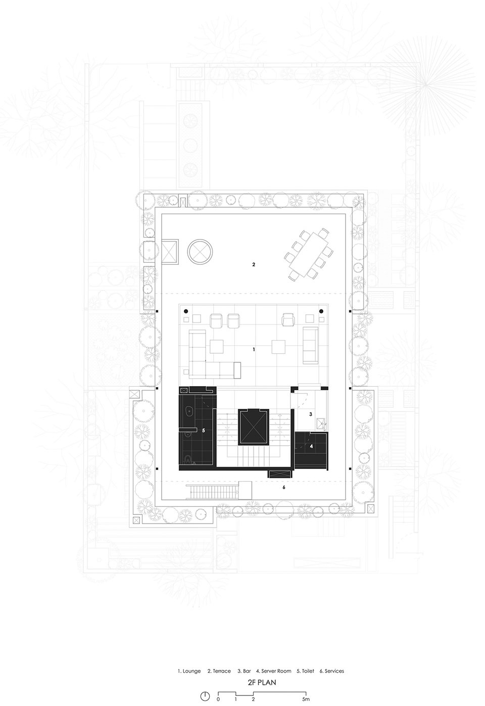 除保留核心印度楝树外,设计师精选热带及本地植物,丰富绿意层次。屋顶露台上沿女儿墙种植的爬藤植物,将随时间蔓延覆盖混凝土立面,让建筑逐渐被自然 “占领”,实现 “建筑生长于自然” 的动态效果。入口旁的静水景不仅营造出温柔的自然声响,更能映照天空与树影,让空间在 “声、光、影” 的交织中更显灵动。水景与绿植的组合,进一步模糊了建筑与自然的物理边界,让整体场地呈现出 “建筑嵌入自然” 的和谐状态。