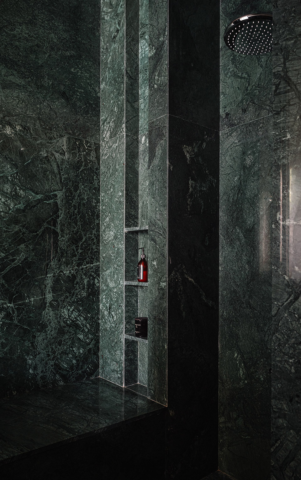 主卧以胶合板模板混凝土与 Kota 石为基调,点缀水磨石细节,四柱床的石基与木柱形成材质对比;两位女儿的卧室分别采用石墨色调与鼠尾草绿墙面,客卧则以自然中性色为主,既体现居者个性,又通过材质延续与自然的联结。建筑采用东西向布局,最大化利用自然采光与通风;夹层墙、深窗洞与双层夹胶玻璃的组合,有效降低热量吸收,减少空调能耗。亭子屋顶配备的太阳能系统,可满足住宅 70–80% 的能源需求,大幅降低对传统能源的依赖。石灰抹灰墙面避免使用塑料基油漆,减少环境负担;施工过程中产生的剩余木材、废弃大理石均被回收再利用,实现资源的循环价值。