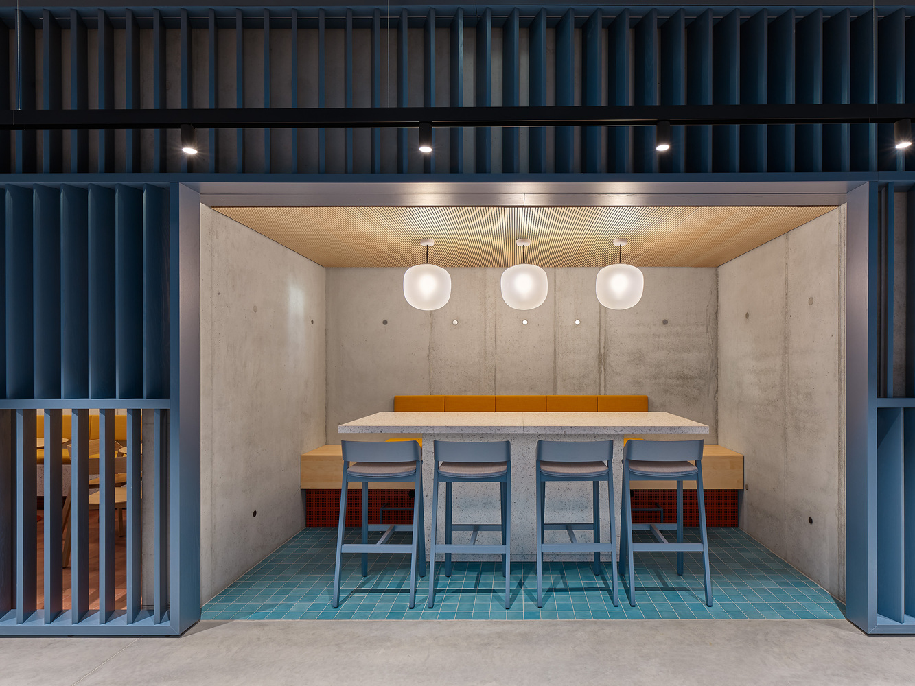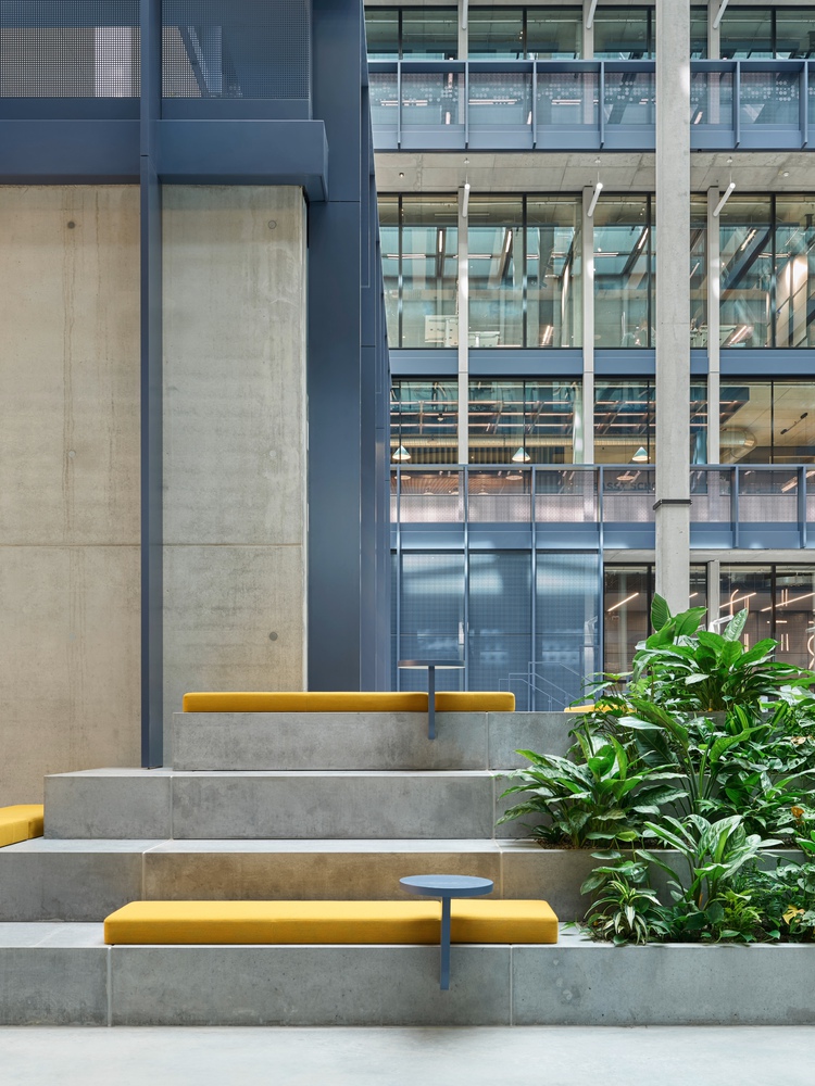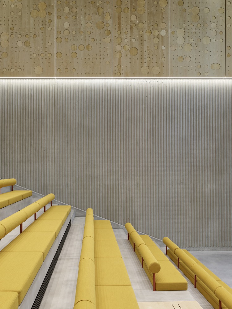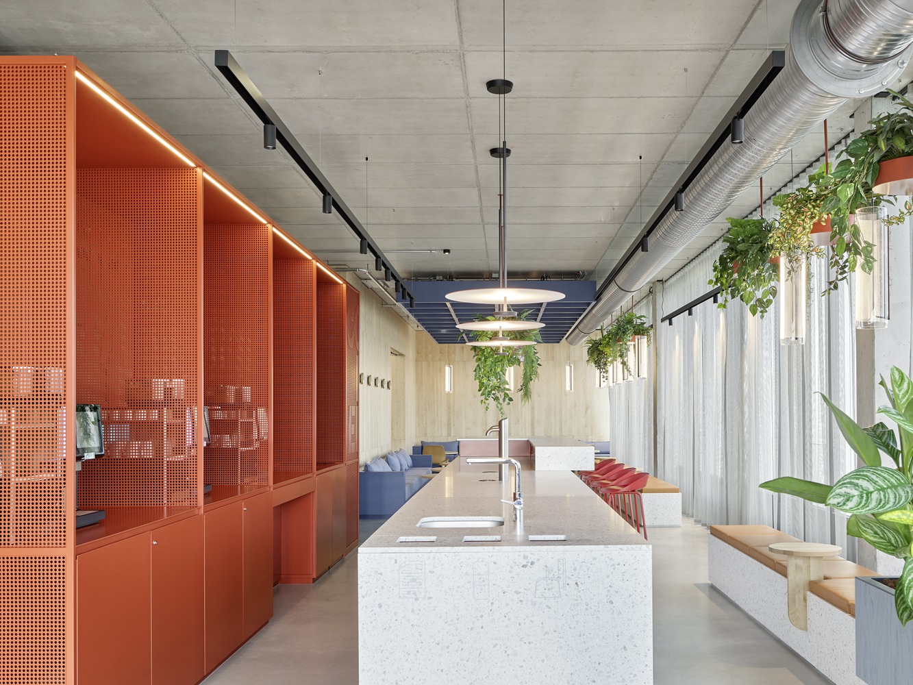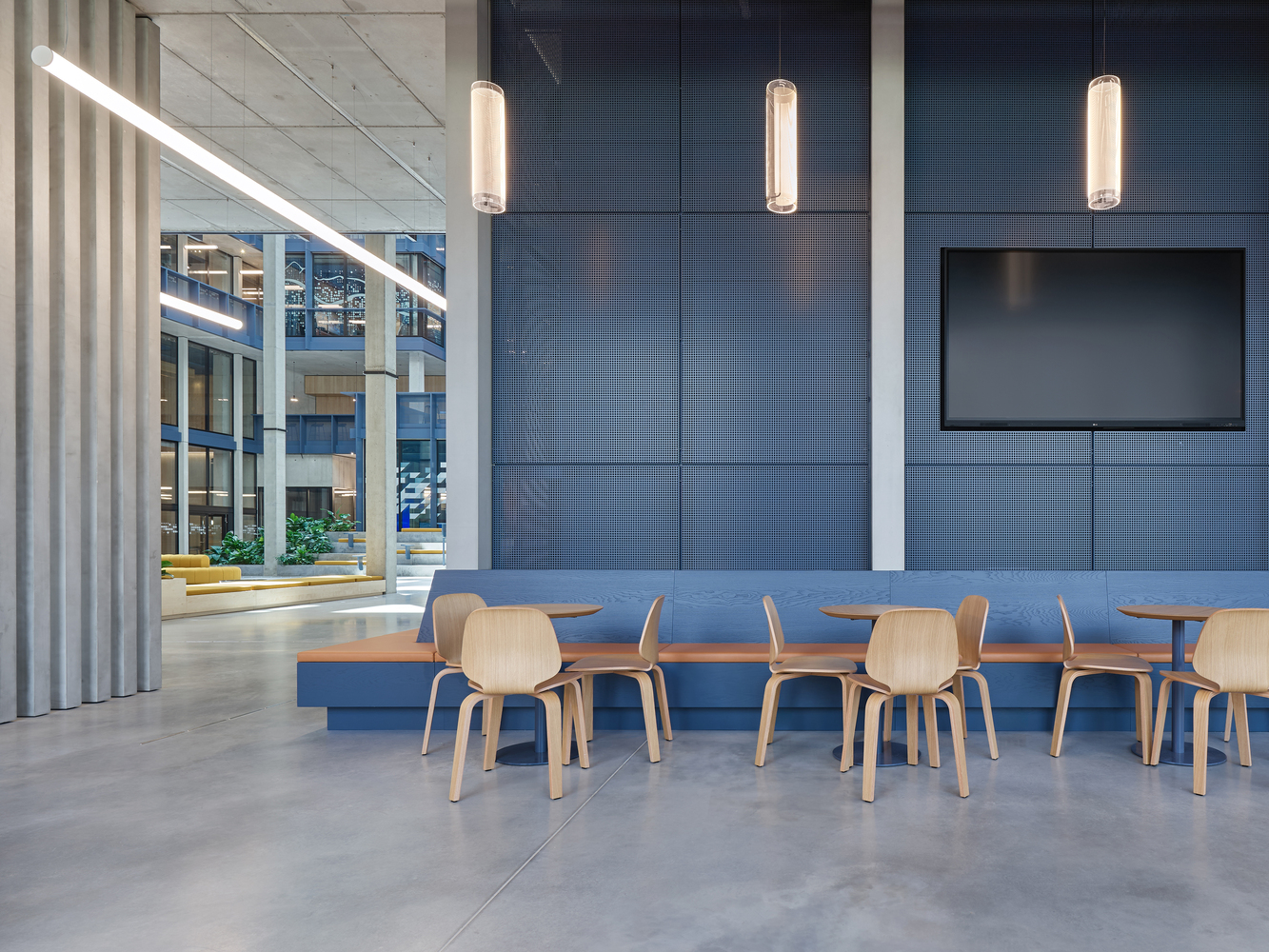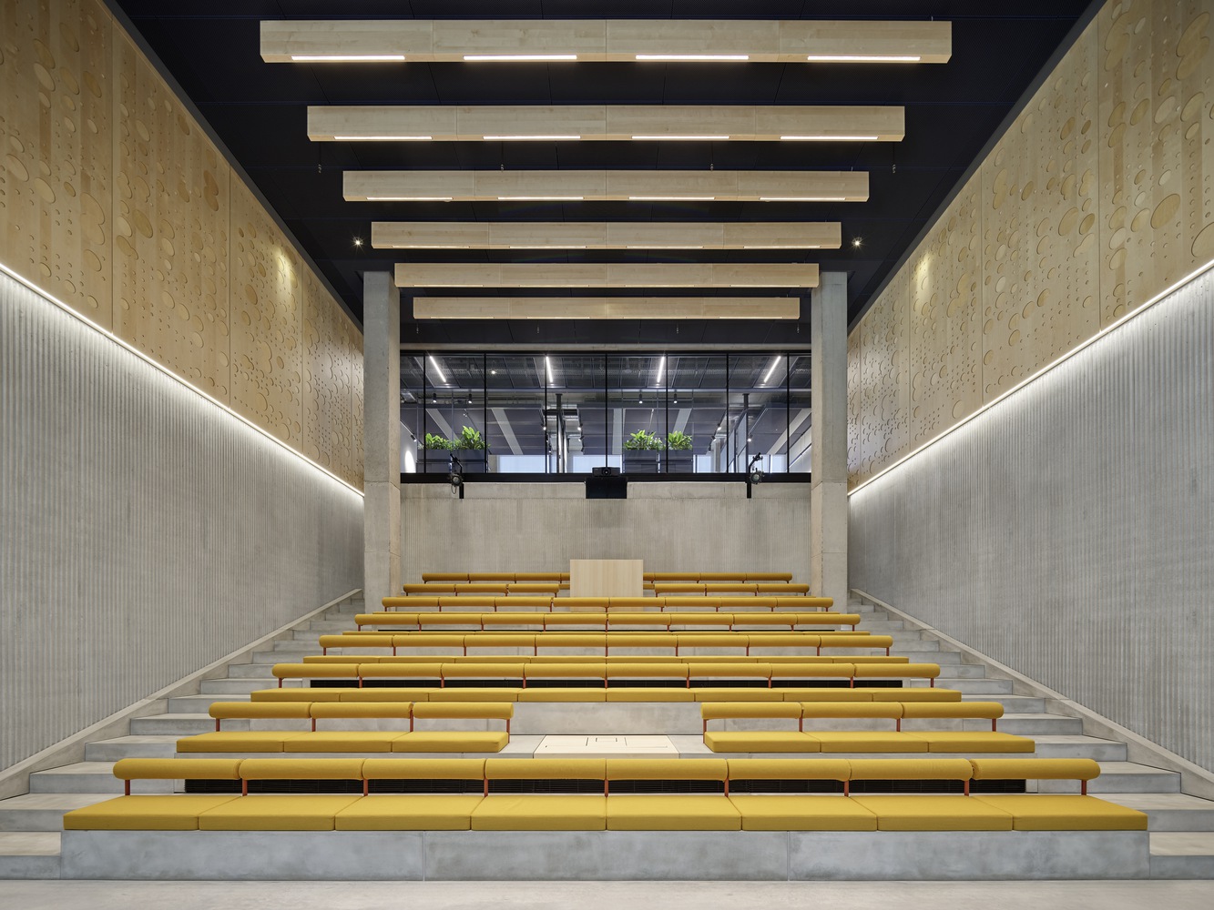 空间布局通过开放式工作区、灵活团队空间及混合会议区,为跨学科交流提供支持。餐饮区作为社交枢纽发挥关键作用:位于中心位置的员工餐厅连通屋顶露台,成为非正式会议、即兴交流及跨团队轻松协作的场所。灵活空间与私密隔间则为独立工作和静思提供了可能。建筑语言以银色阳极氧化壁柱和清晰的结构韵律为特色,赋予立面平衡统一的表现力。室内采用裸露混凝土、水磨石和银色阳极氧化铝等质朴材料,奠定了空间的性格基调。