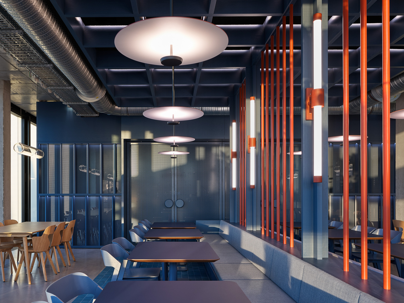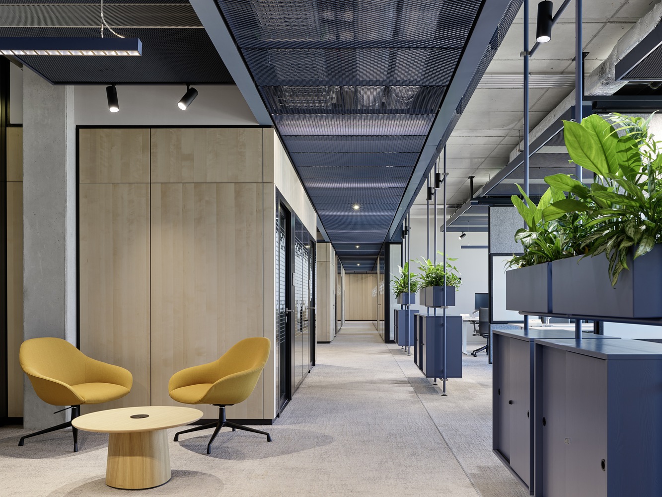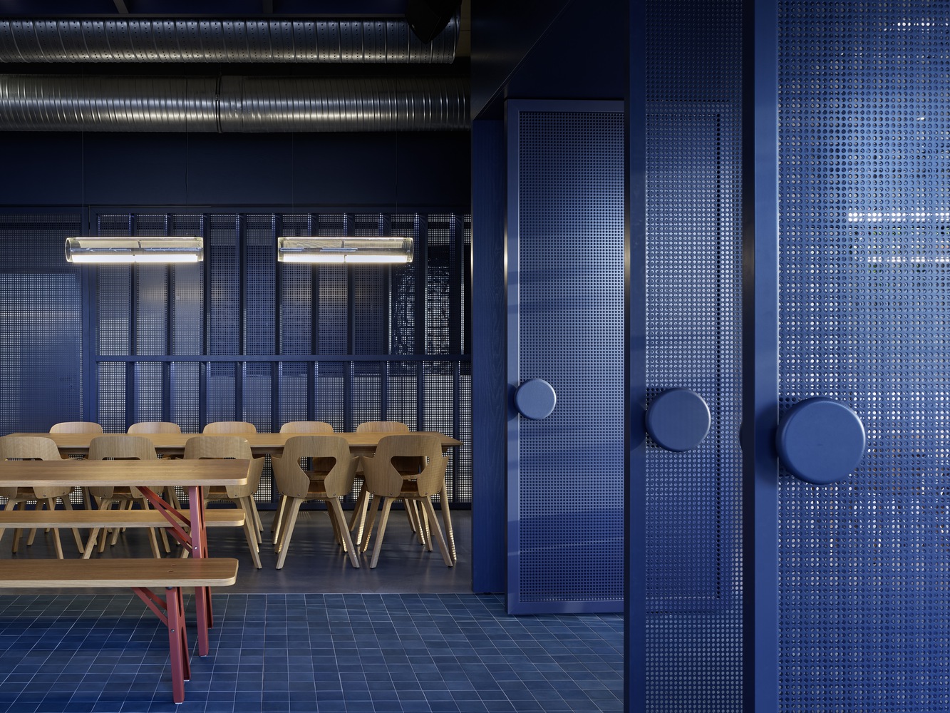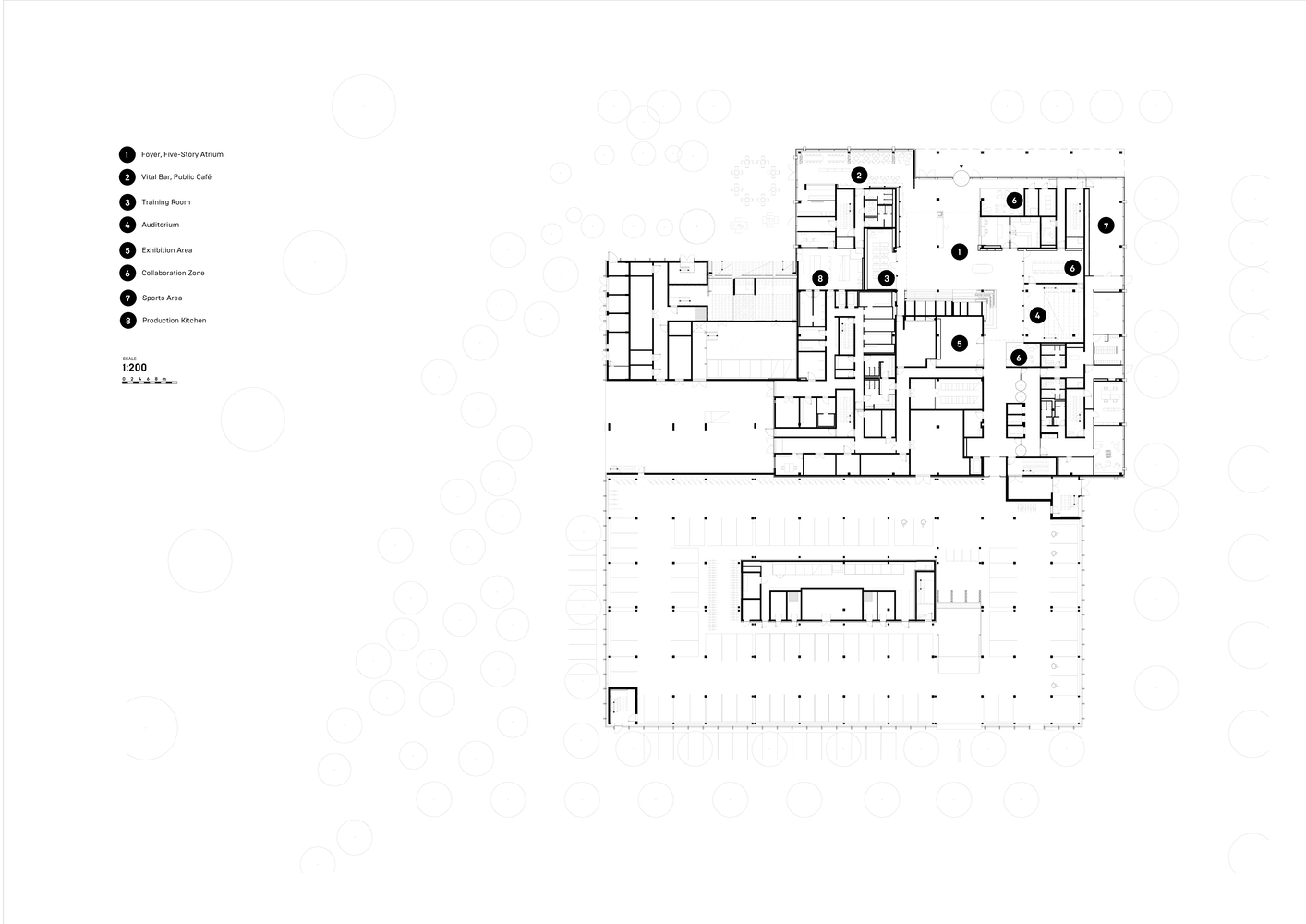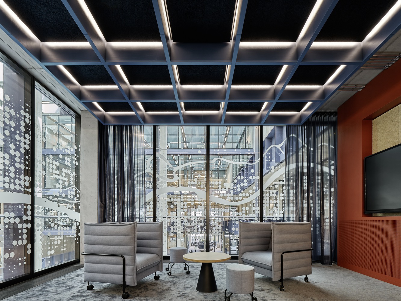 空间布局通过开放式工作区、灵活团队空间及混合会议区,为跨学科交流提供支持。餐饮区作为社交枢纽发挥关键作用:位于中心位置的员工餐厅连通屋顶露台,成为非正式会议、即兴交流及跨团队轻松协作的场所。灵活空间与私密隔间则为独立工作和静思提供了可能。建筑语言以银色阳极氧化壁柱和清晰的结构韵律为特色,赋予立面平衡统一的表现力。室内采用裸露混凝土、水磨石和银色阳极氧化铝等质朴材料,奠定了空间的性格基调。