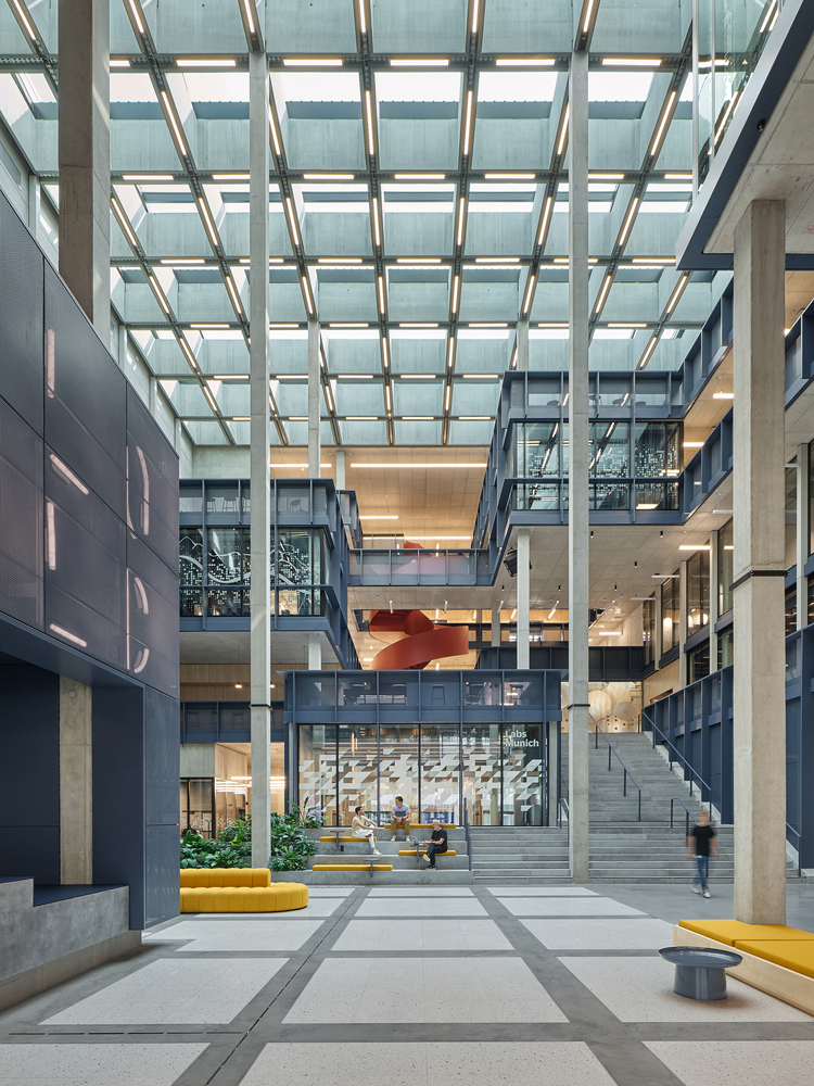 可持续性贯穿整个设计:遵循循环原则,建筑采用可回收、低维护材料,避免不必要的装饰,并具备长期适应性。停车场屋顶被设计为可进入的露台与户外空间,促进使用者的健康与社交互动。作为创新、研究与社区的活力交汇点,SAP 慕尼黑实验室园区超越了传统办公场所的定义,为跨领域对话、学术交流及协作型未来工作文化提供了空间框架。