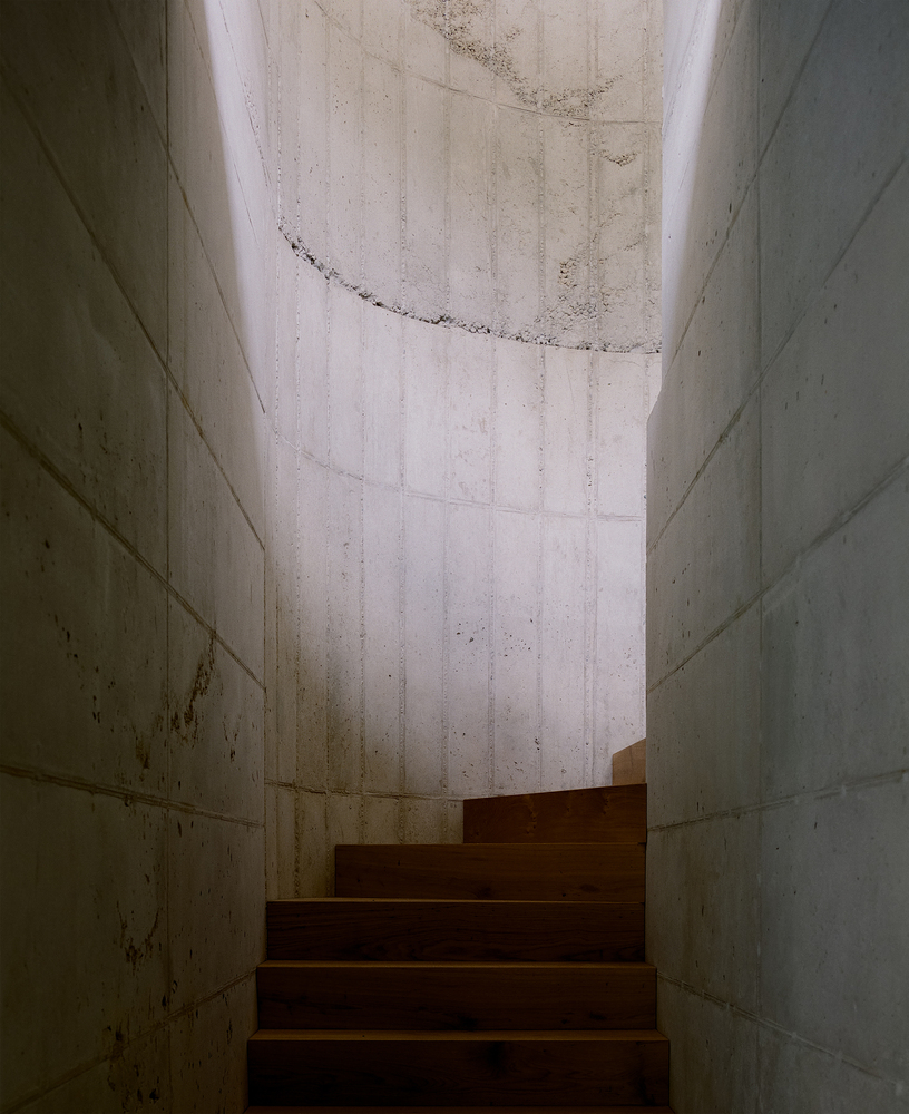 Raw House 重新思考了在高密度城市环境中,建筑如何提供静谧、专注且与自然相连的体验,同时避免孤立感或视觉杂乱。它挑战了 “更多房间、更高密度或装饰性饰面定义价值” 的观念,转而将居住品质和感官清晰度放在首位。一项巧妙的创新在于对每平方米空间的有意利用:半圆形的楼梯平台减少了角落闲置空间,成为面向街道的视觉标志,同时在北侧开设洞口,框取建筑自身的几何形态,在不影响隐私的前提下柔和引入光线。建筑的南向布局主导了整体空间规划:起居区域充分享受阳光照射和山林景观,而私密房间则位于北侧,隔绝噪音与强光。
