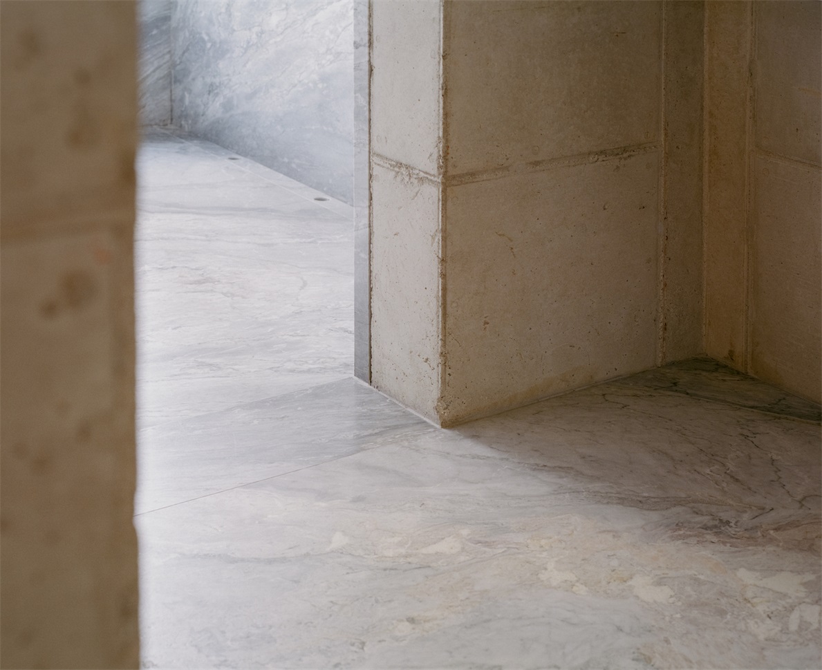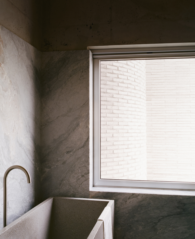 设计不仅关注材料本身,还注重其布局。每一面墙和天花板都经过精确设计与规划:从裸露混凝土中的欧式模板线条,到胶合板与石材的分区,再到楼板布局和木地板朝向。天花板与地面采用统一网格,连接各空间,使墙壁和家具如同置于更大场域中的独立体。在可能的情况下,尽量减少接缝,让石材和木材表面呈现为整体块状而非拼接板,为空间带来统一与连续的质感。Raw House 的理念并非做更多,而是以更审慎的态度做更少,创造一个坚实、真切且极具人性温度的空间。