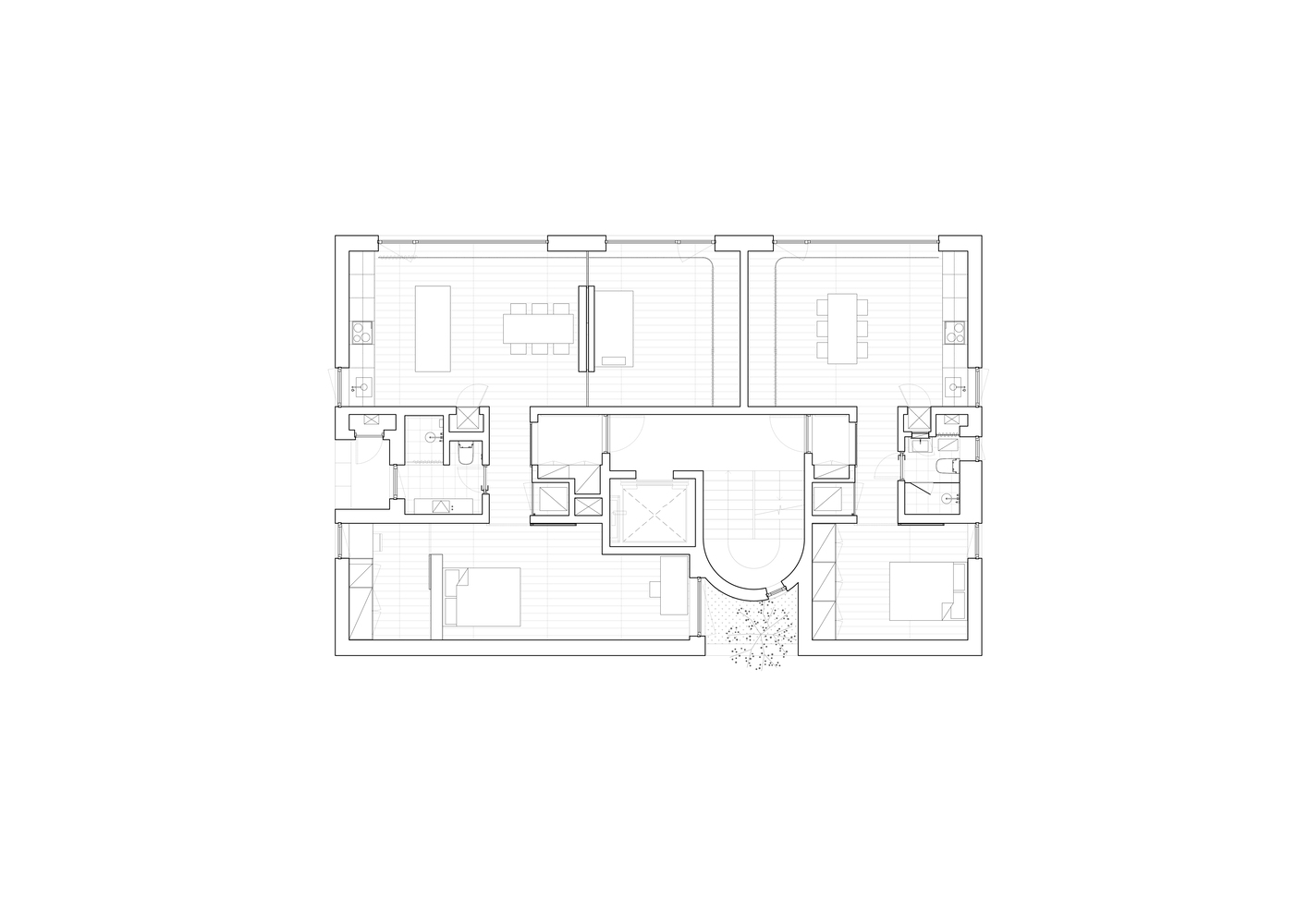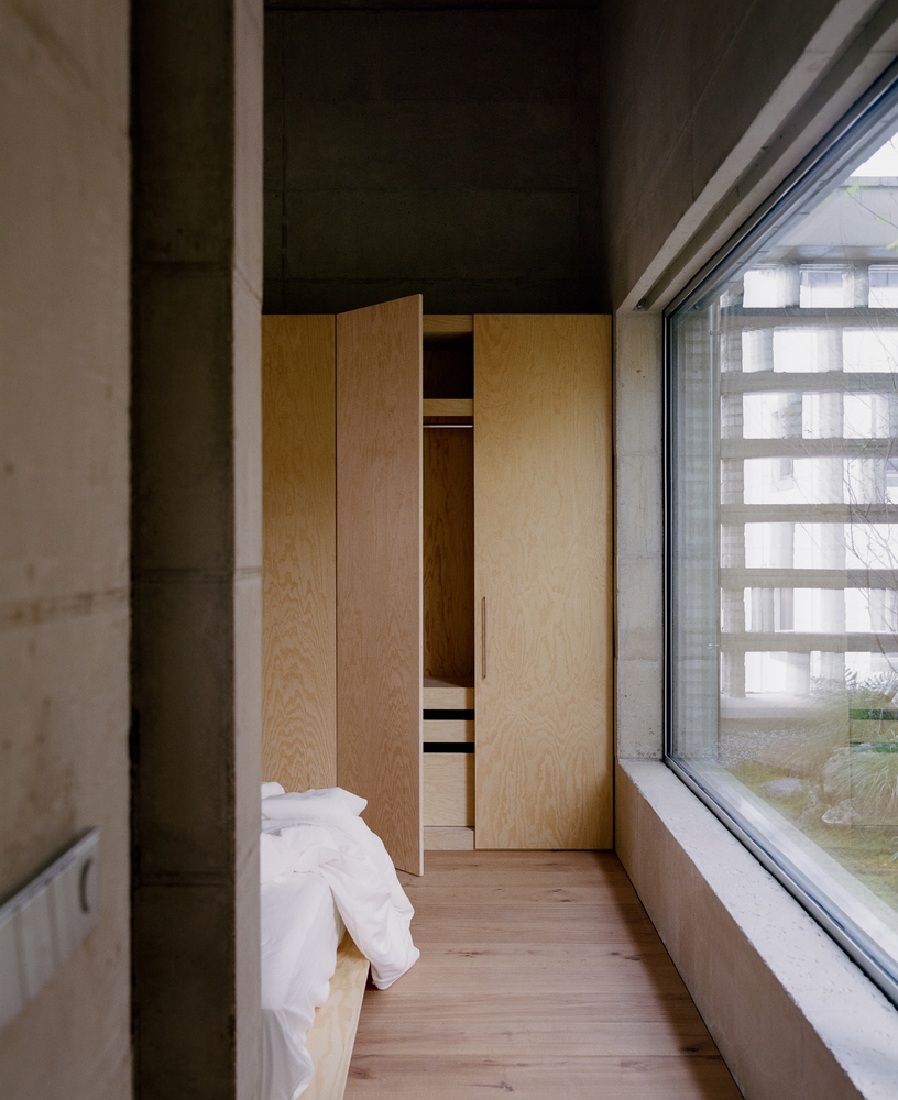 照明设计精心考量,以支持休息和认知舒适。不同于天花板灯具,隐蔽的间接照明从天花板边缘柔和洒落,柔化空间氛围,促进放松,尤其在夜晚营造出视觉宁静且有利于生理健康的环境。尽管使用了胶合板,但仅选择性应用,并与钢筋混凝土和石材等更耐用材料结合。表面处理简洁,减少更换、涂覆或维护需求。内置元素保持最少,以减少材料浪费,并允许随时间推移进行个性化改造。