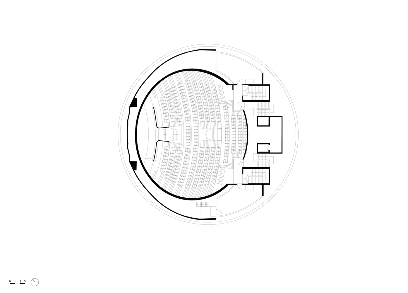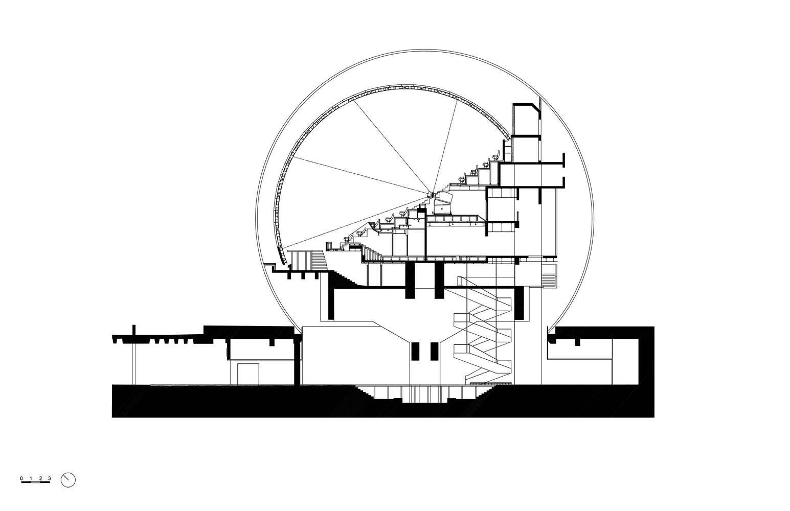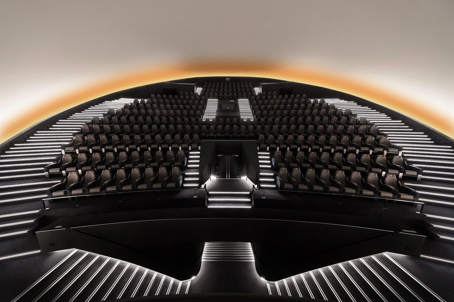 拉吉奥德的内部是 1985 年由阿德里安・范西尔伯打造的建筑和技术奇迹,其特点是倒置的蘑菇形混凝土结构,仅由一个 4 平方米的中央支柱支撑。为了放置 IMAX 投影仪而增设的平台和填充大厅坑洞的另一个平台,都必须在不破坏这种看似反重力的微妙结构平衡的前提下完成。loci anima 通过去除所有传统电影院元素,进一步提升了这座野兽派杰作(从精神层面来说,它就像一座混凝土大教堂)的魅力。实际上,观影体验从踏入影院的那一刻就已经开始。