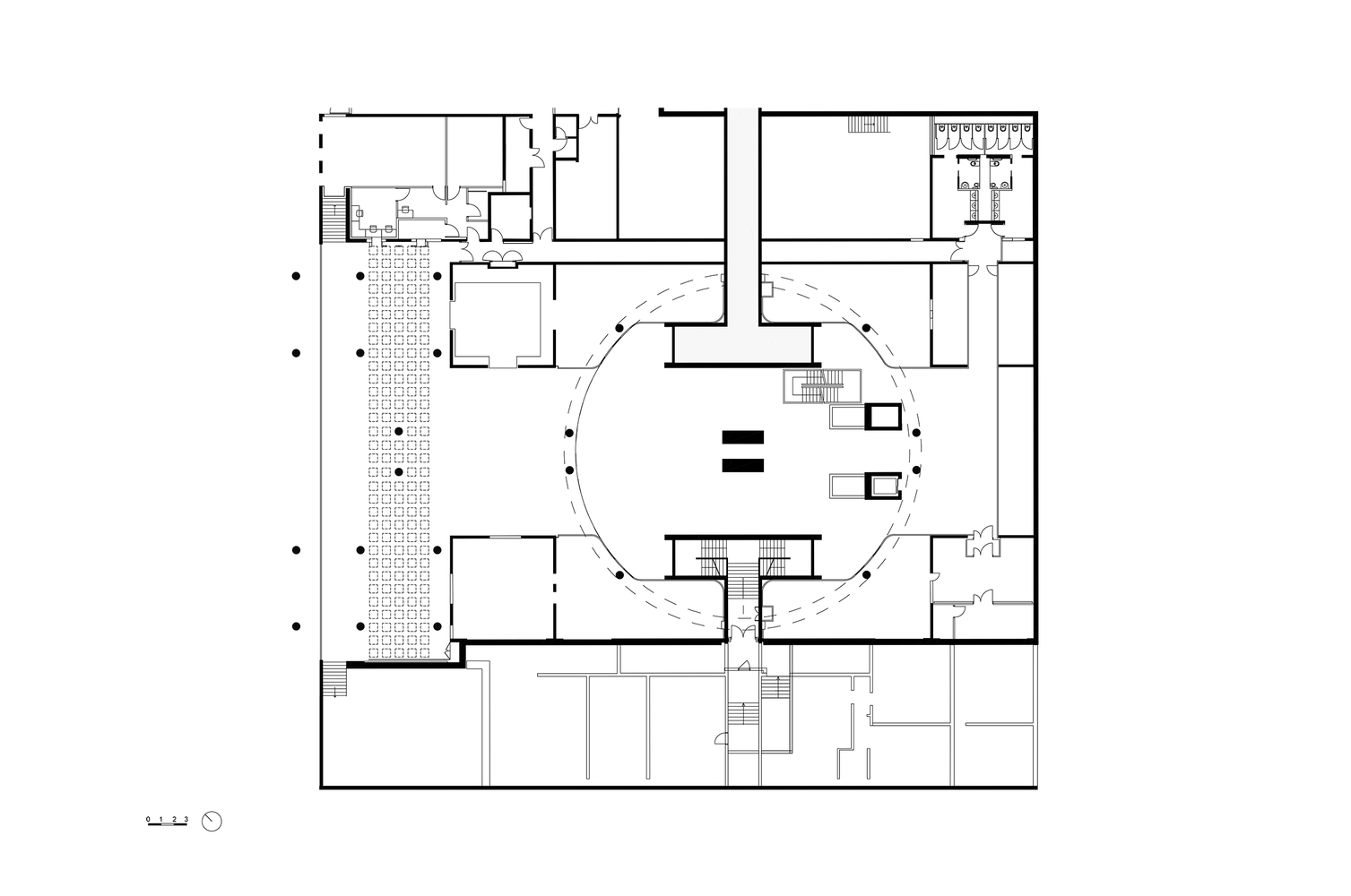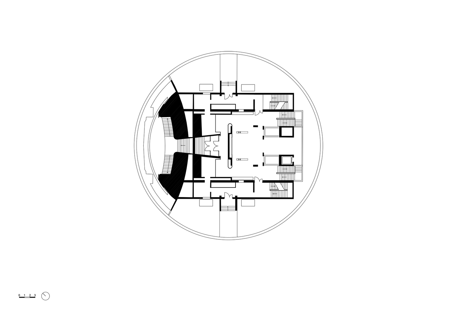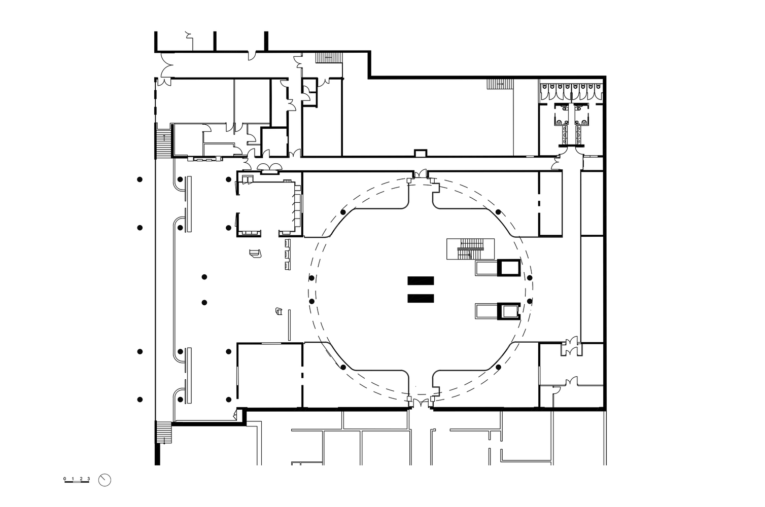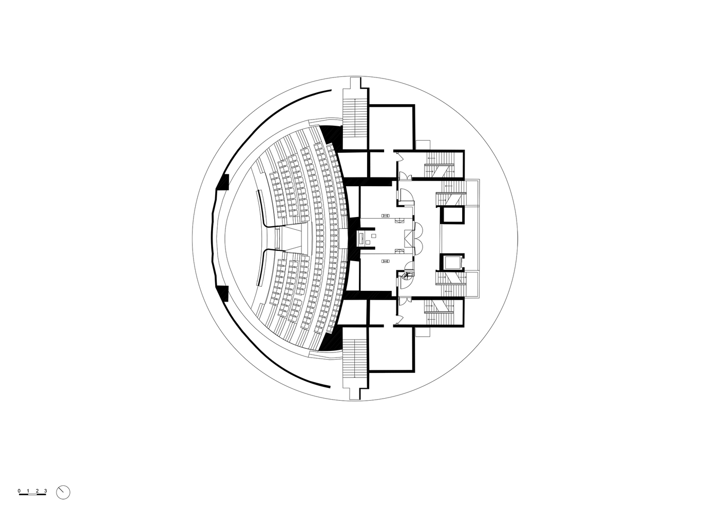 拉吉奥德的内部是 1985 年由阿德里安・范西尔伯打造的建筑和技术奇迹,其特点是倒置的蘑菇形混凝土结构,仅由一个 4 平方米的中央支柱支撑。为了放置 IMAX 投影仪而增设的平台和填充大厅坑洞的另一个平台,都必须在不破坏这种看似反重力的微妙结构平衡的前提下完成。loci anima 通过去除所有传统电影院元素,进一步提升了这座野兽派杰作(从精神层面来说,它就像一座混凝土大教堂)的魅力。实际上,观影体验从踏入影院的那一刻就已经开始。