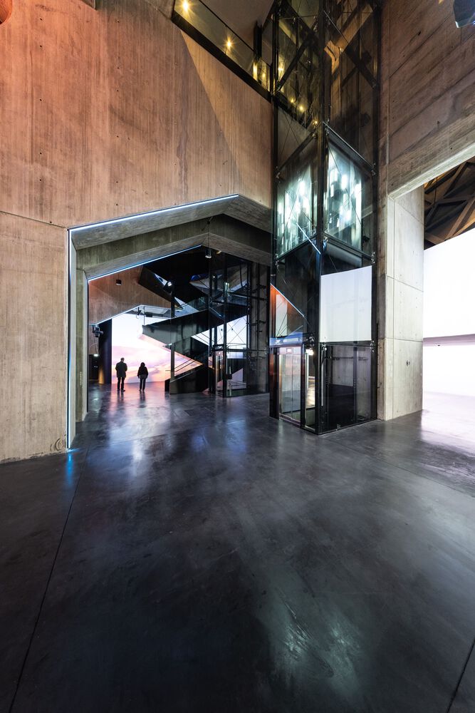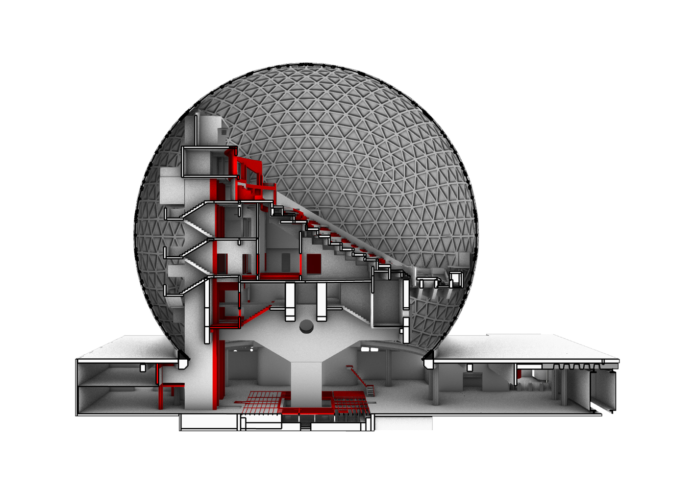 墙壁上 360° 的投影鼓励游客探索这个空间,建筑遗产在灯光的映照下再次焕发光彩。两部全景电梯和一座 11 米长的悬浮楼梯贯穿整个建筑,将大厅与礼堂入口相连。门厅让游客能够近距离观察球形结构,这可不是胆小者能轻易尝试的。礼堂现在配备了一块新的 1000 平方米的半球形屏幕,专为新型 4K 激光投影仪设计,并搭配 IMAX 6.0 音响系统。
