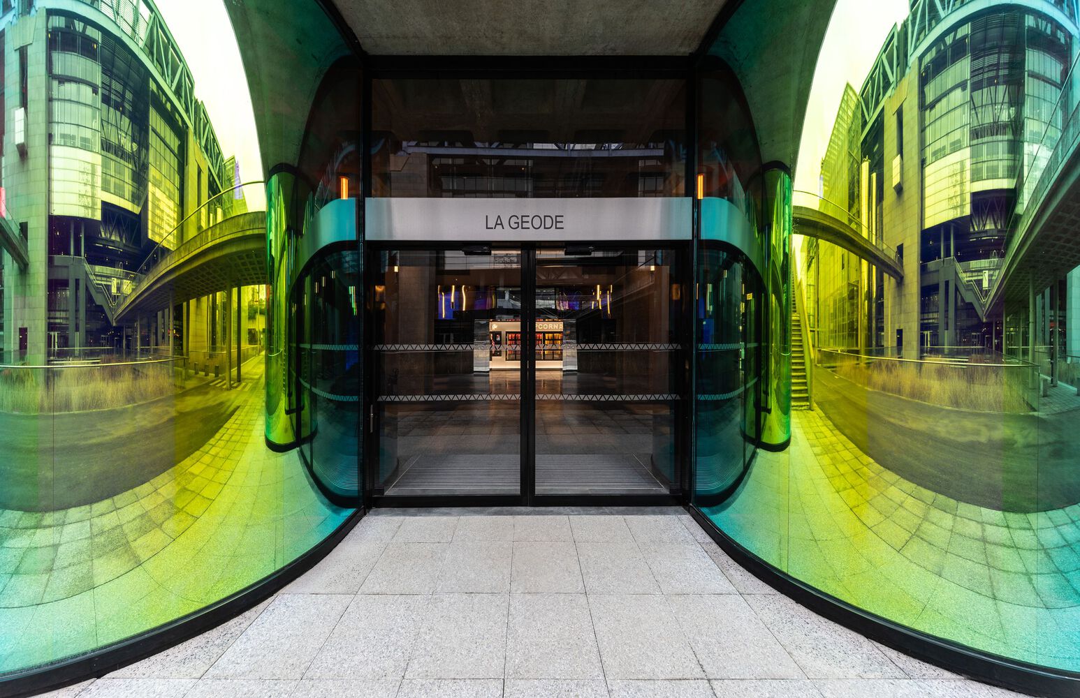 该电影院设计是在巴黎第 19 区的拉维莱特公园内,由弗朗索瓦丝・雷诺领导的建筑事务所 loci anima 于 2024 年 12 月完成了对拉吉奥德(La Géode)及其半球形电影院的翻新工程,该建筑最初由阿德里安・范西尔伯设计,业主为法国国立科学研究中心(Universcience),运营商为百代电影院(Pathé Cinémas)。此前,IMAX 屏幕的观影体验已经很沉浸,而现在整个电影院都被改造成了全方位沉浸式体验空间。甚至在进入影院之前,二向色性的外立面就将游客引入一个梦幻般的境界,自然光仿佛透过格子天花板洒下。