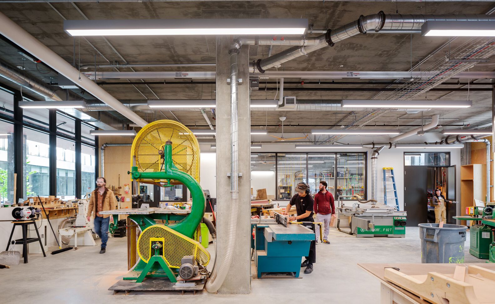 设计还通过环保和体验性的策略支持了 CCA 对可持续发展的承诺。混合大体量木结构和最少的饰面将建筑的碳足迹减少了近一半。采用重型设备的体力密集型实践活动被战略性地安排在地面上,以集中结构负荷和机械基础设施,并随着新需求、新媒介和新技术的发展提供适应性。其他被动式设计策略,如自遮阳外墙和夜间冲水通风,可使建筑自然冷却,从而减少机械系统的体积和能源需求。此外,该建筑还配备了基础设施,可在未来实现闭环、净正值建筑。