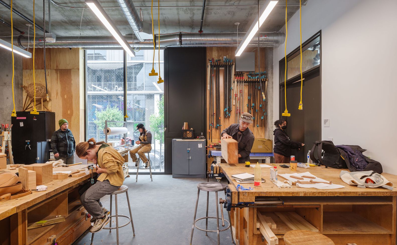 学校成立于 20 世纪初的工艺美术运动时期,现已发展成为涵盖 34 个艺术和设计学科,从珠宝、陶瓷、纺织品到金属艺术、建筑和动画。这座占地 82,305 平方英尺的建筑被设计成一个创意生态系统,不同的学科可以在这里进行富有成效的互动和重叠,它提供了新的艺术创作设施、学习空间和绿地,为多样化的社区提供支持。混凝土地面层是一个室内外工作室中心,用于进行更多的体力密集型创作实践和大型制造。这一层围绕共用材料和设备进行组织,其开放、灵活的规划使不同的项目清晰可见,并可相互访问,促进了跨学科互动。从混凝土下层凿出的两个大型制作场提供了额外的工作空间,并使新鲜空气和自然光能够渗透到室内深处。