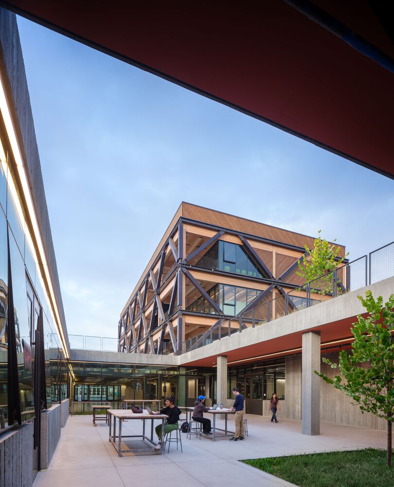 从建筑底层延伸出来的两座大型木结构展馆内设有教室、艺术工作室以及 CCA 瓦蒂斯当代艺术学院的新址。两座亭子都通向绿色梯田景观,将建筑的上下两层连为一体。它们的深阳台使室外交通以及非正式的学习、工作和社交空间成为可能,CCA 社区可以在这里享受旧金山温和的气候。这些建筑是加利福尼亚州首批外露的大规模木结构建筑之一,采用了独一无二的偏心支撑框架系统,使建筑的自然材质、横向荷载和重力荷载一览无余。新建筑通过一个温馨的新街景和旨在提高艺术在更广泛社区中的影响力的项目,加强了 CCA 与旧金山设计和创新区以及更广泛的湾区及其环境、创业和创意文化的联系。