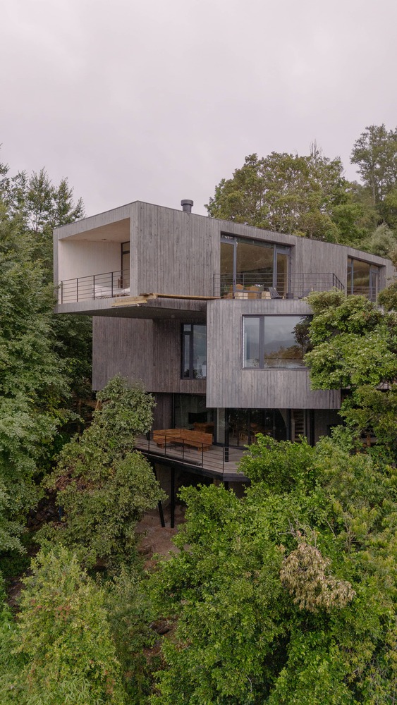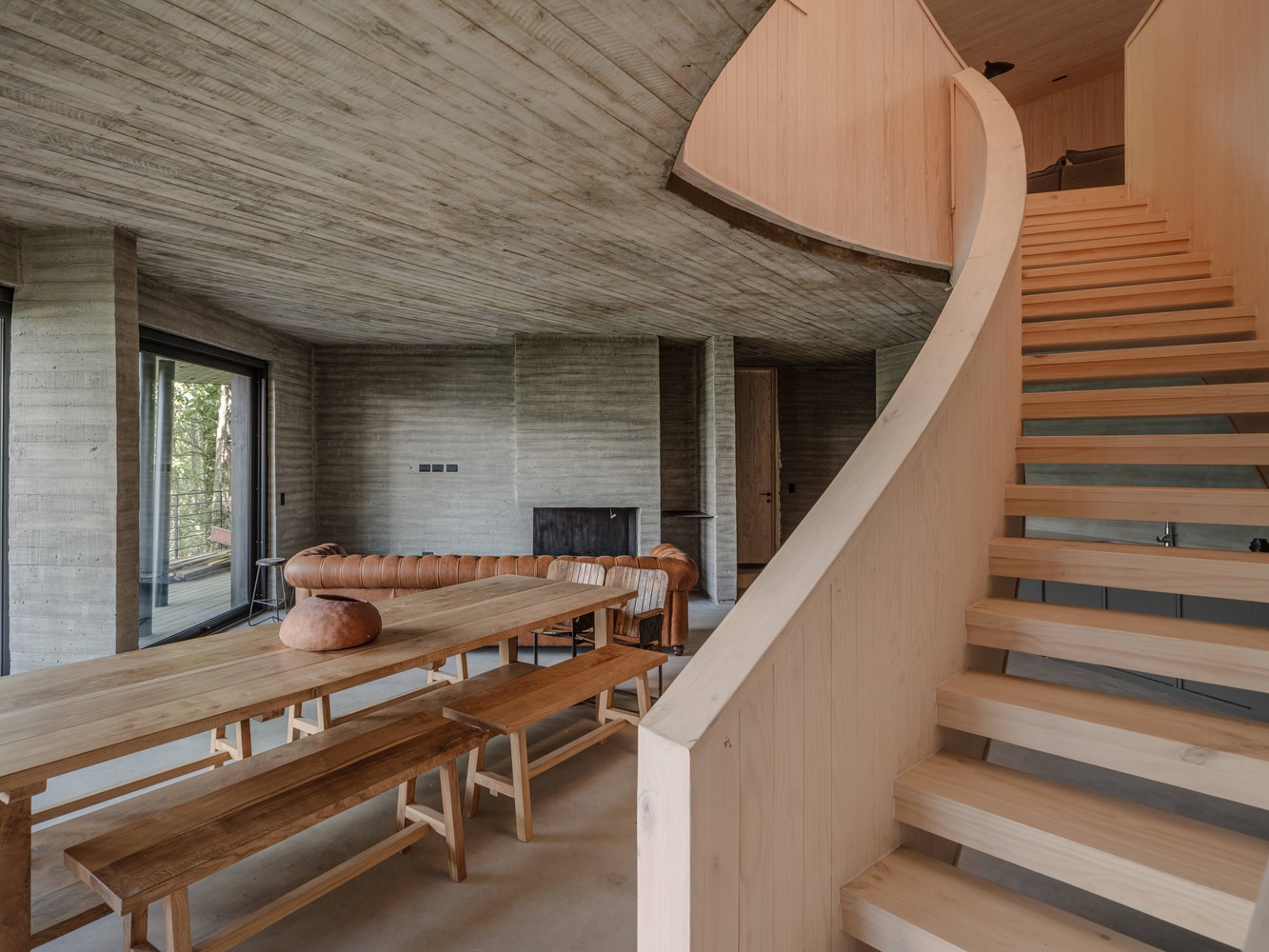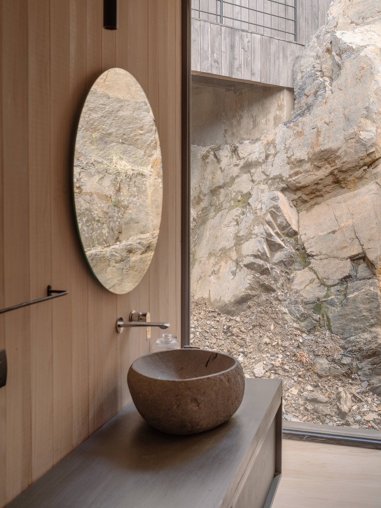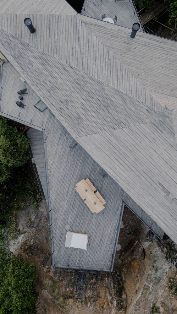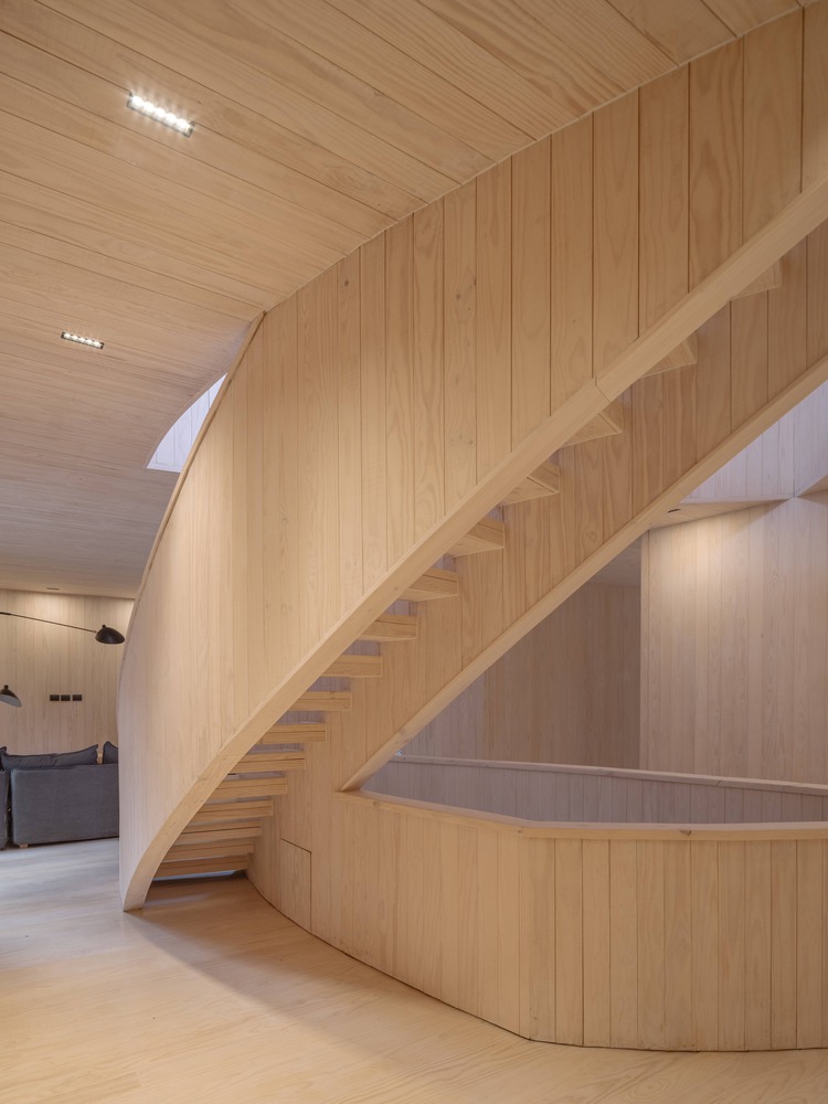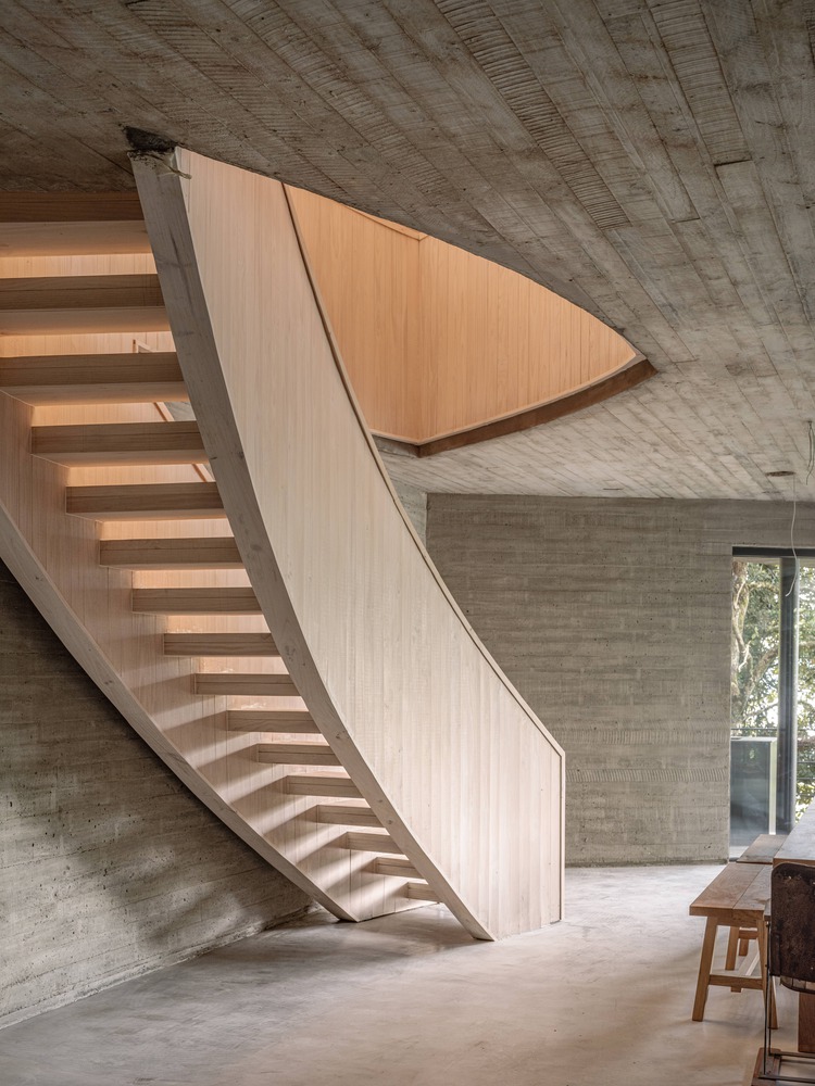 这座住宅围绕着一个中央楼梯来构思设计,这个楼梯连接着地块的顶部和湖面的高度。这个内部楼梯是按照黄铁矿的立方几何结构建造的。这种对项目所有挑战的建筑回应,造就了一个与岩石(场地的主要材料)对话的复杂三层体量,这种情况为建筑结构增添了美感和特色。