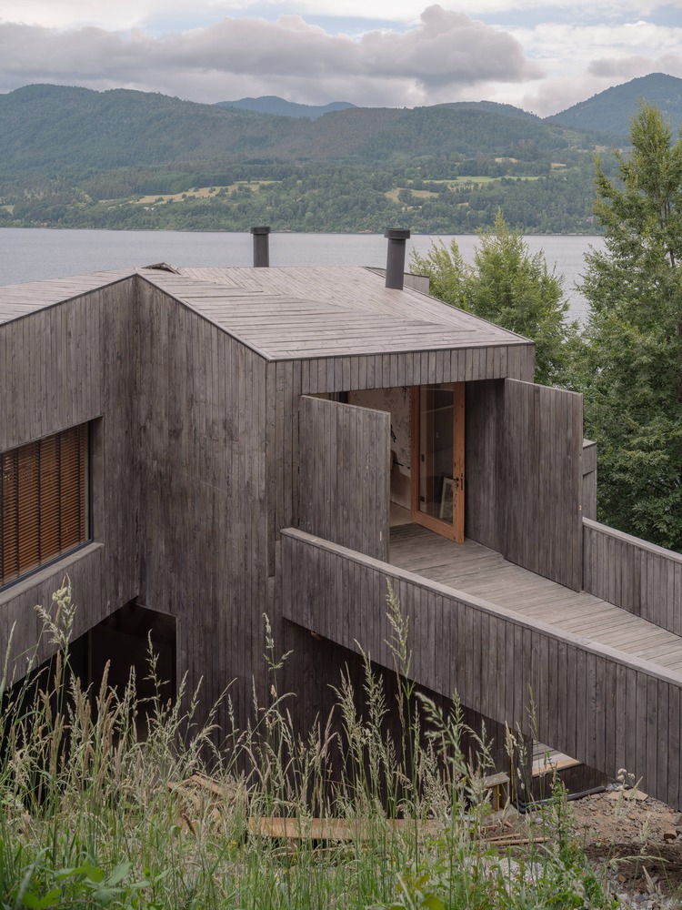 事实证明,该湖边度假屋设计的选址颇具挑战性,阳光从湖泊主要景观的后方照射过来,这种朝向决定了建筑的设计理念,而且项目地点靠近一处 40 英尺(12 米)高的悬崖。