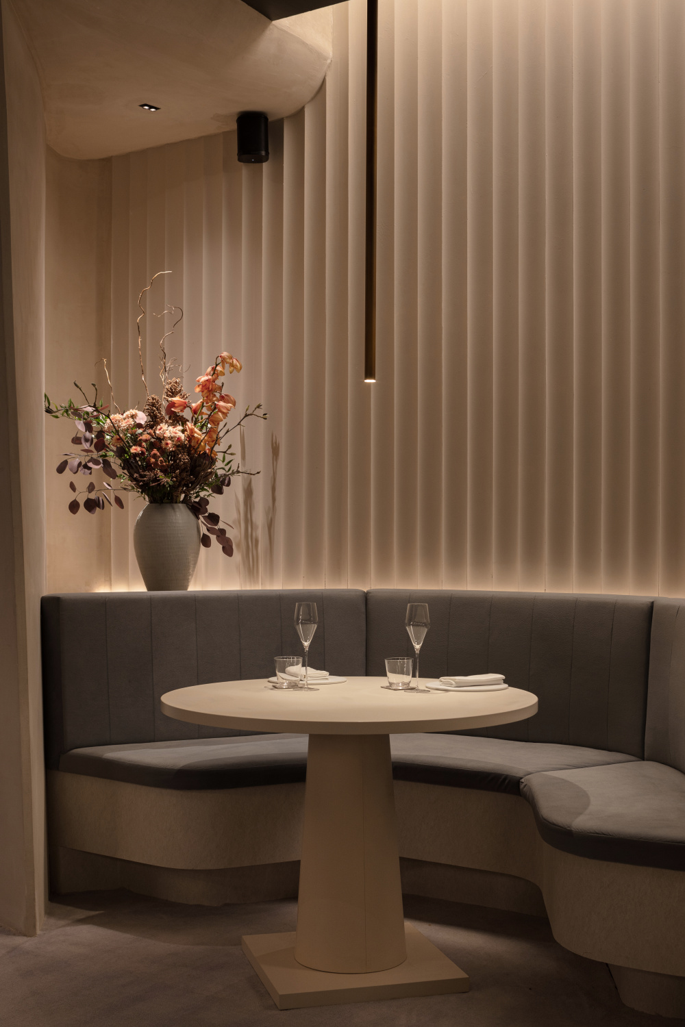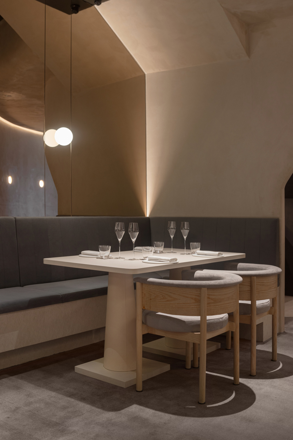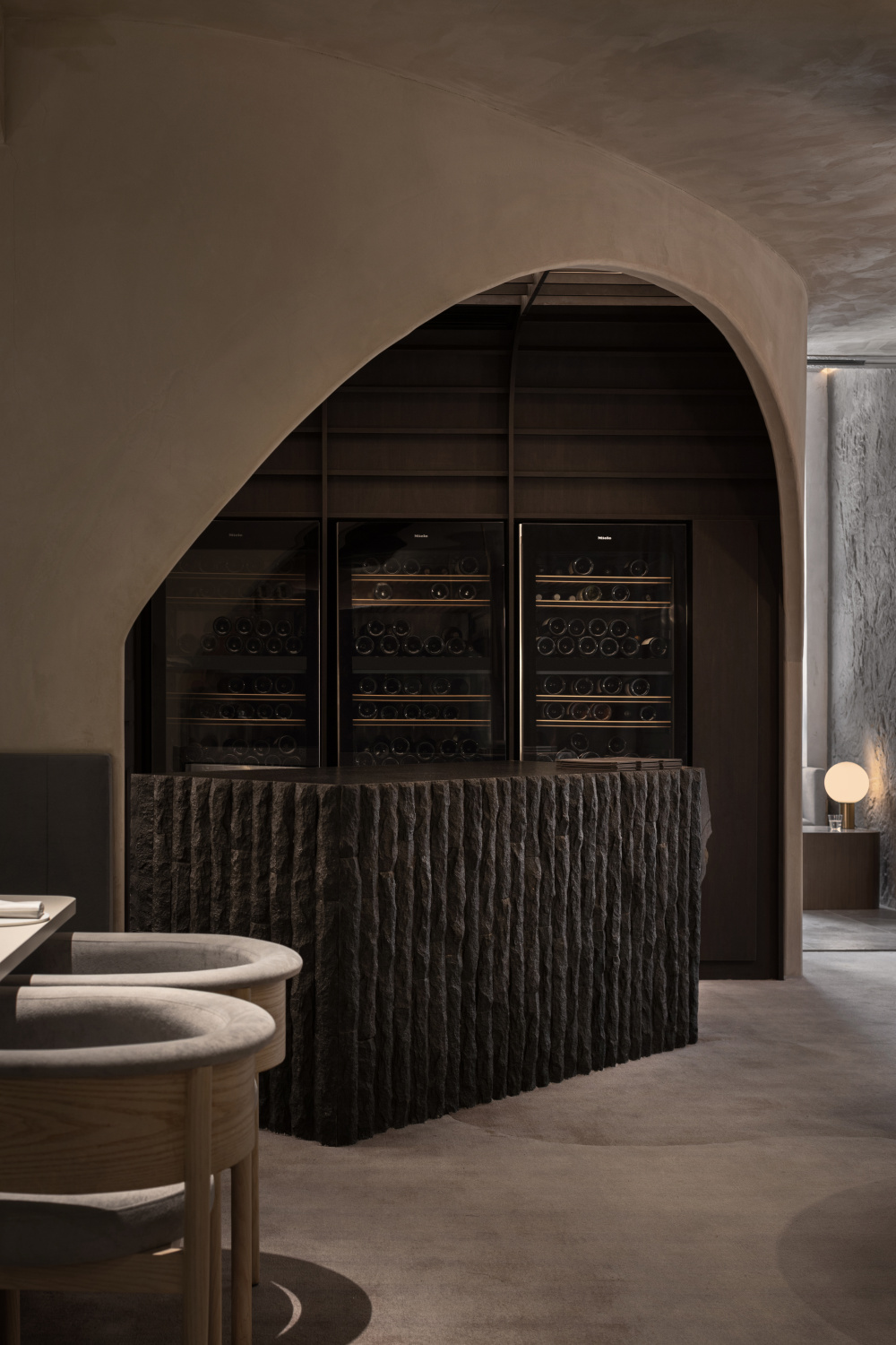 青铜、陶瓷和石材引领着材料的韵律。就连卫生级也遵循着这种基调,镜面走廊和错落有致的灯光交相辉映。每个元素都各司其职,却又不失其独特,无需比食物本身更显突出。