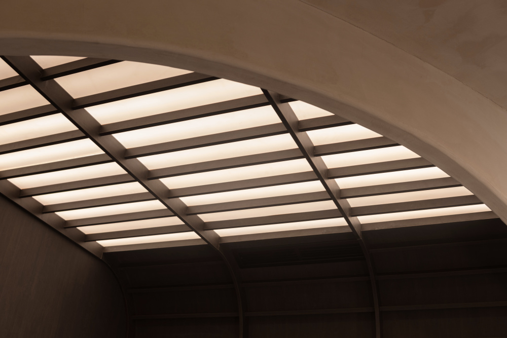 入口处步调自成一派。一道弧形墙通向酒窖,凹槽玻璃和石材的光线柔和地变换着。座位的布置方便舒适,天花板升起时却不引人注目。