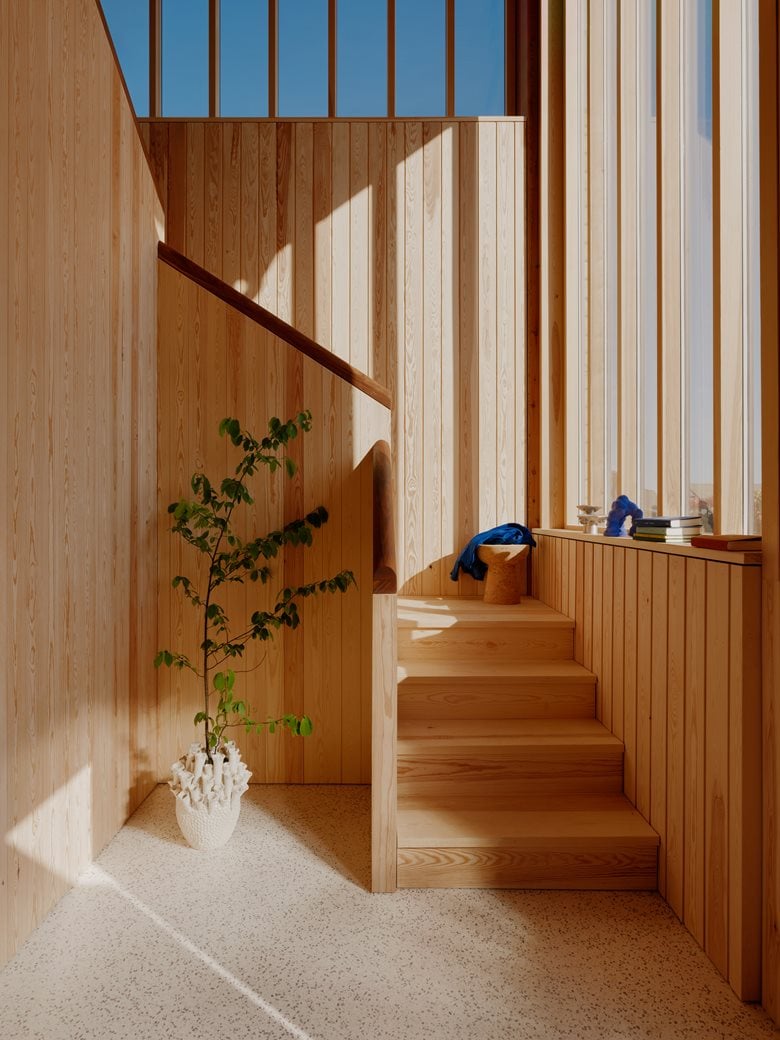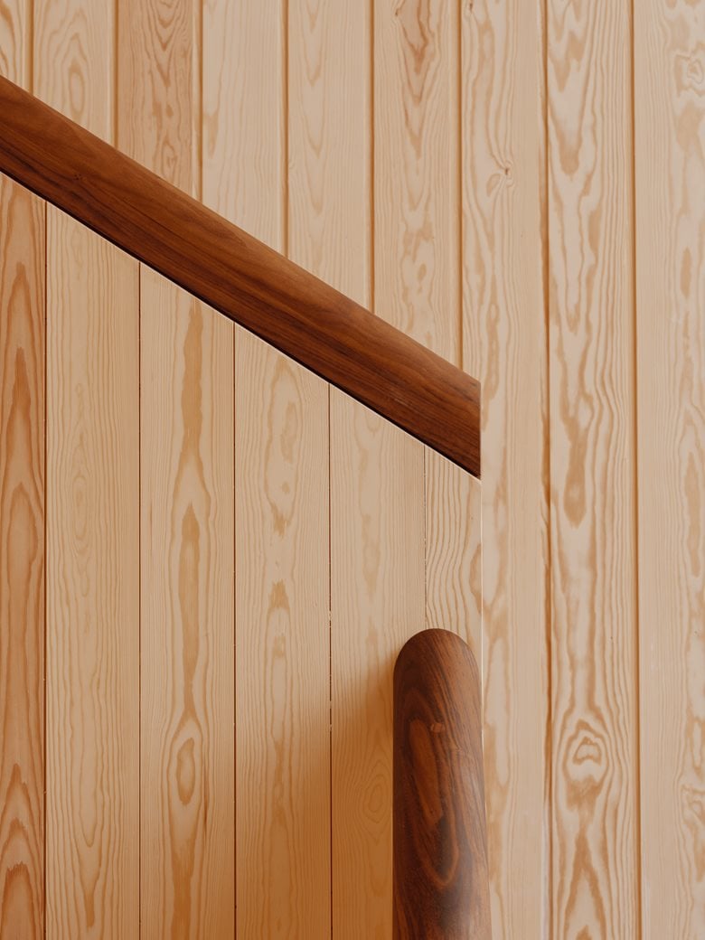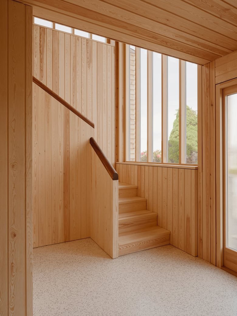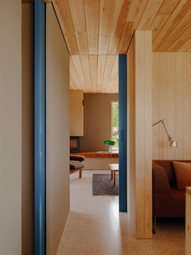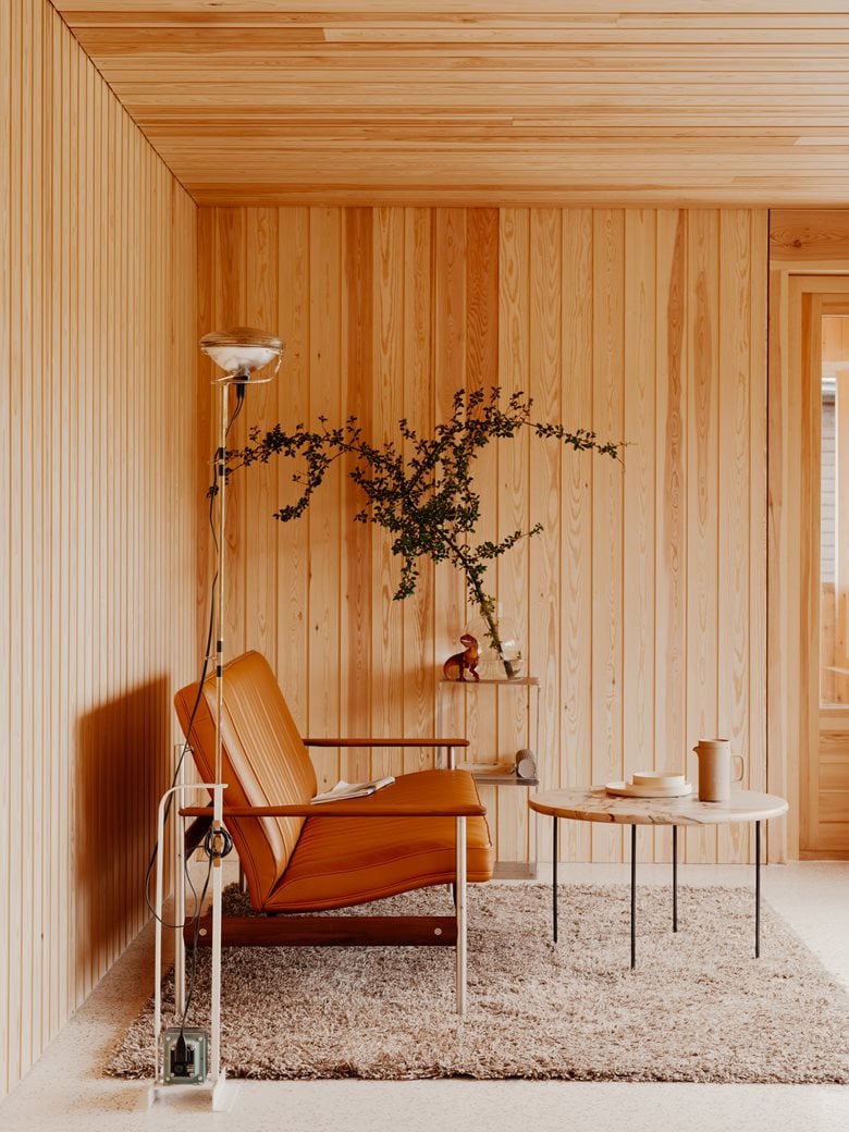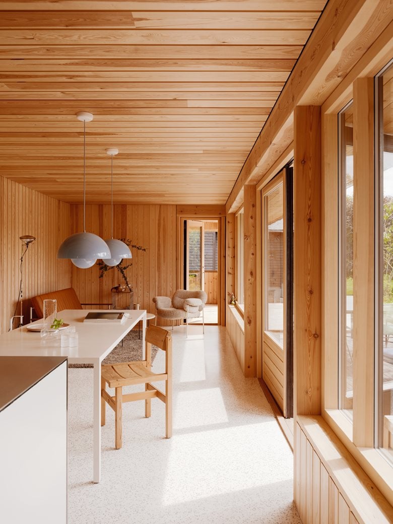 房子内部的材料选择以松木、砖块和水磨石为特色,明显呼应了更南部那些具有 60 年代风格的房屋。