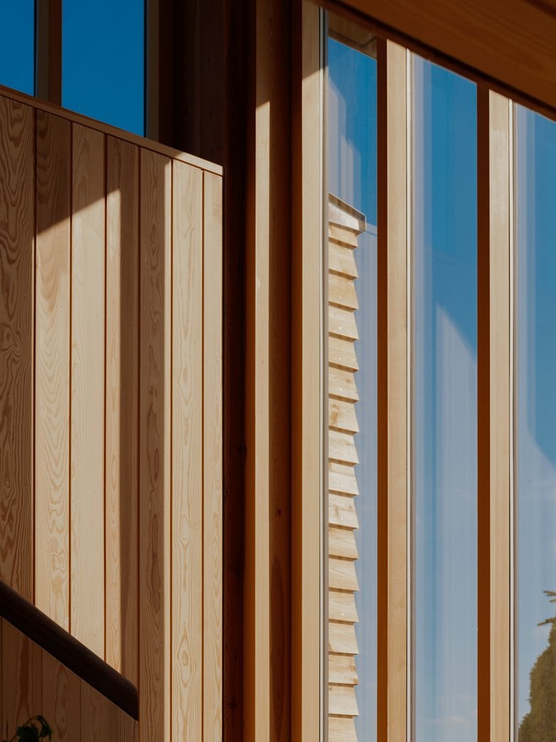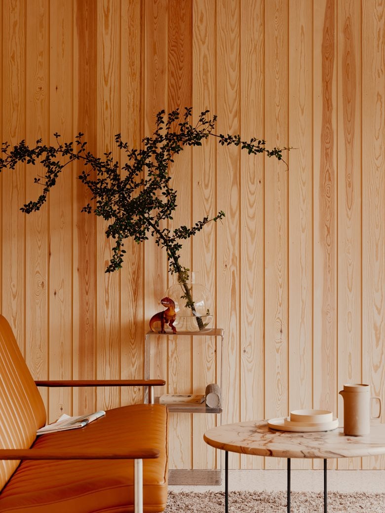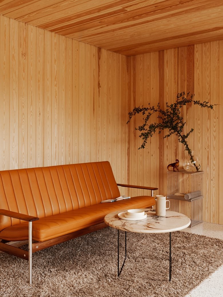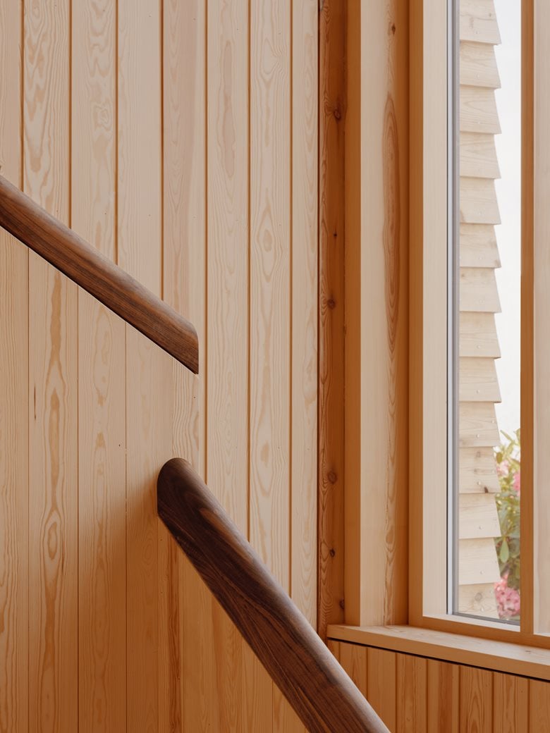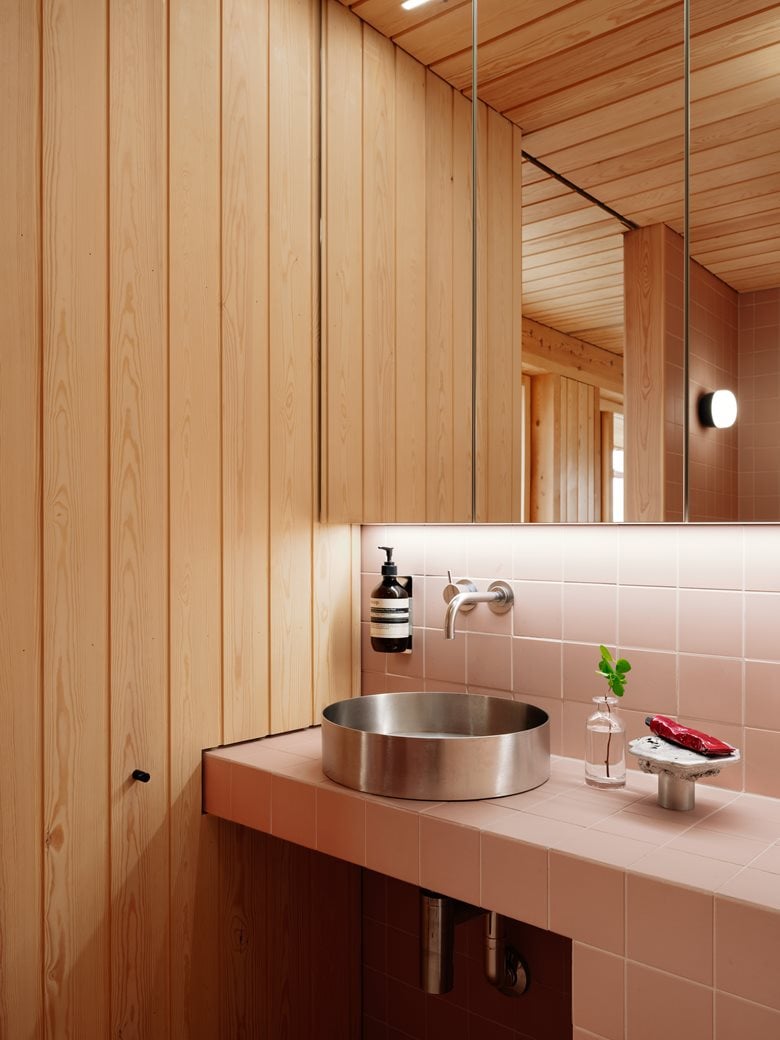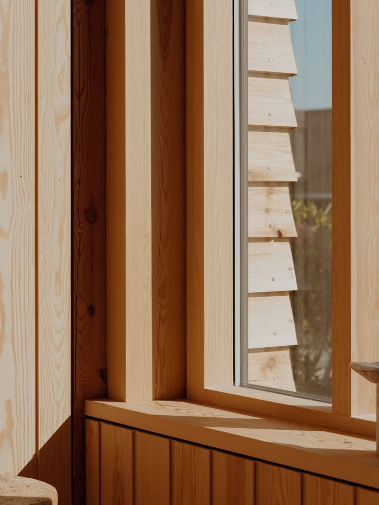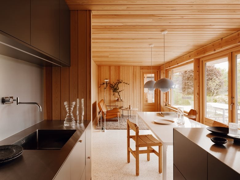 房子内部的材料选择以松木、砖块和水磨石为特色,明显呼应了更南部那些具有 60 年代风格的房屋。