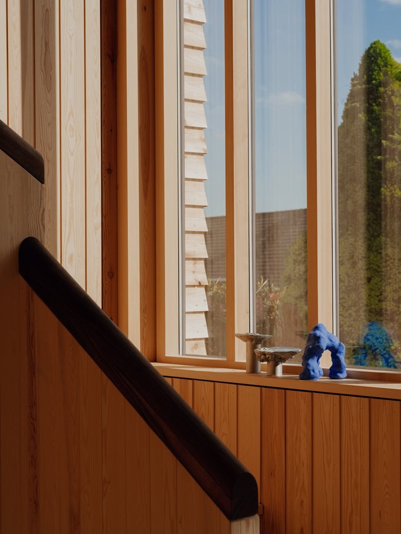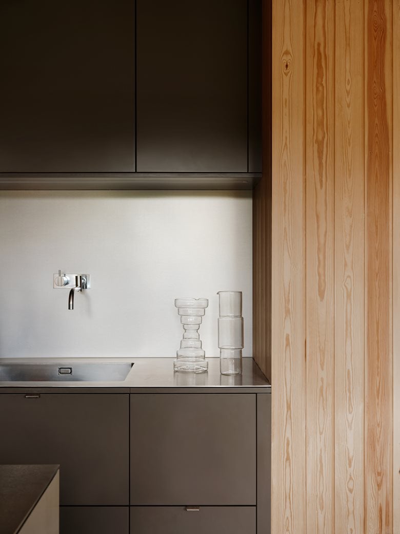 “总体目标是让人们对房子的内部是否一直是这样产生一些疑惑。同时,创新也很重要。业主选择我的部分原因是我也不想把这里打造成一个博物馆。松木和砖块需要一些酷炫且色彩鲜艳的元素来提升整体效果,比如拉丝钢和蓝色的门。事物之间需要相互映衬 —— 光泽与哑光相对,深色与浅色相对。当地面很光滑时,墙面就采用粗糙的抹灰处理。”桑德尔总结道,如果没有技艺精湛的工匠以及热情且懂行的客户,这一切都不可能实现。“我们彼此都充满了好奇心,与他们合作简直是梦寐以求的事情。能参与这个项目,我真是太幸运了!”