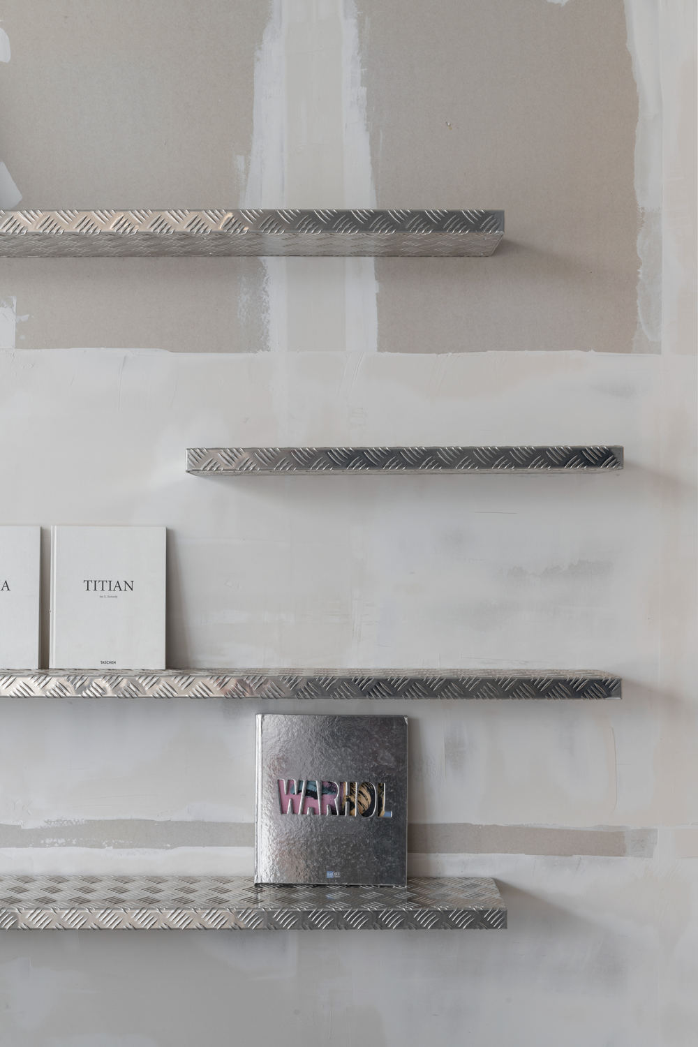 Post Post Scriptum 的设计核心,是对 “时尚与空间关系” 的大胆反思。品牌主张 “re:think(重新思考)”,拒绝时尚行业的 “标准化审美” 与 “过度包装”,于是设计团队将这种理念具象为空间的 “未完成感”—— 墙面保留着石膏板拼接的原始痕迹,没有被精心粉刷掩盖;结构的金属框架直白裸露,而非被包裹隐藏。这种 “未完成” 并非是 “粗糙” 的代名词,而是一种 “刻意的美学选择”:它像一种视觉宣言,传递出品牌 “反教条、重个性、追求流动性与多元性” 的态度。顾客踏入空间的瞬间,便会被这种 “非常规” 的场景吸引,进而思考 “时尚的本质是精致包装,还是自我表达的本真?”,让空间成为品牌理念的 “沉浸式传播场”。