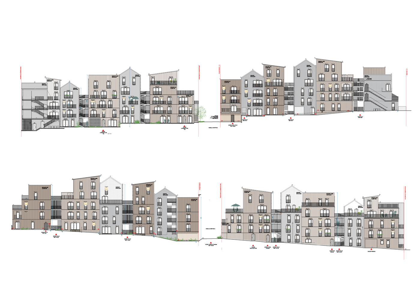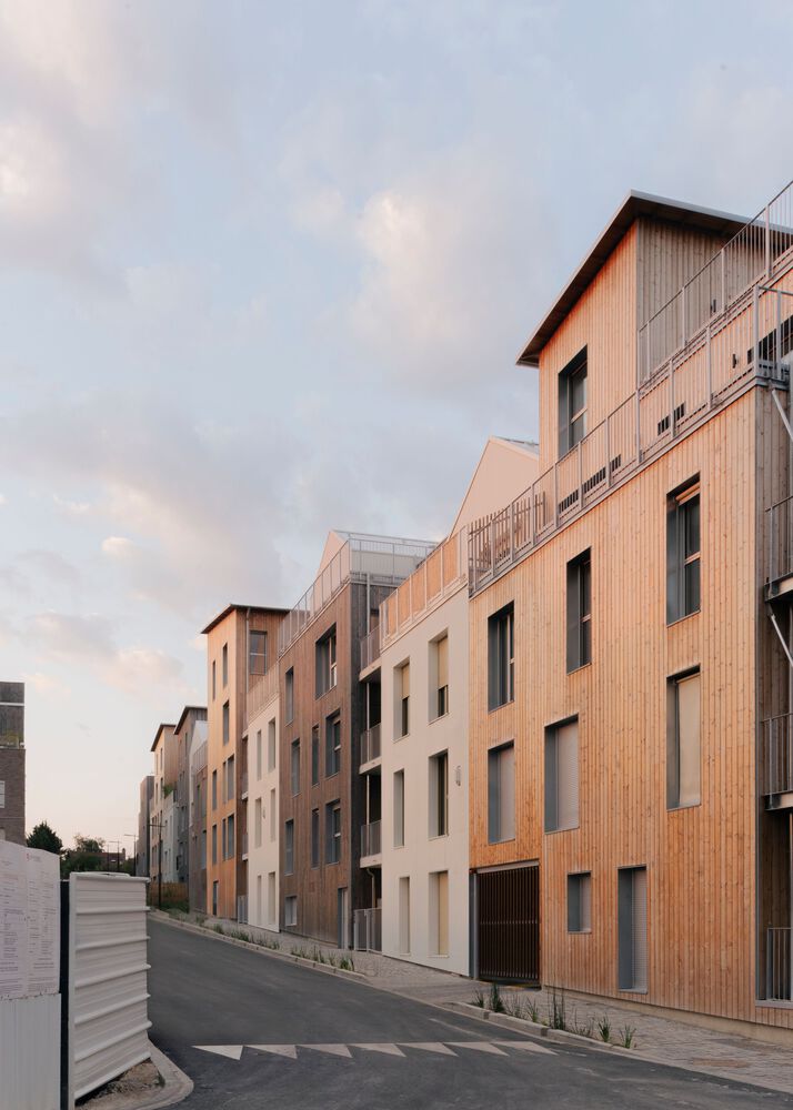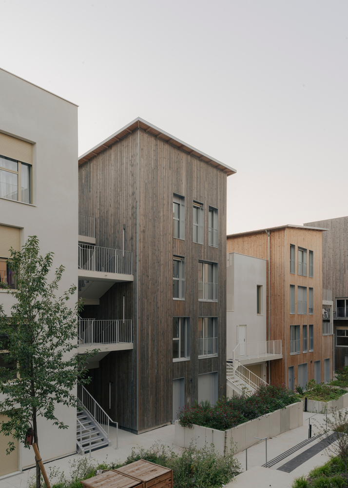 底层的空隙部分和技术用房采用混凝土建造,而其余的上层建筑则使用木材(MOB)。项目使用了不同的外立面材料,包括宽条木板覆层、深密木板覆层、白色金属覆层和涂层。屋顶的形式有单坡屋顶、双坡屋顶或绿色露台。该项目在材料使用、屋顶形状、镶板设计和建筑分割方面呈现出多样性,同时在以建筑框架为核心的基础上,保持了强烈的城市和建筑连贯性。