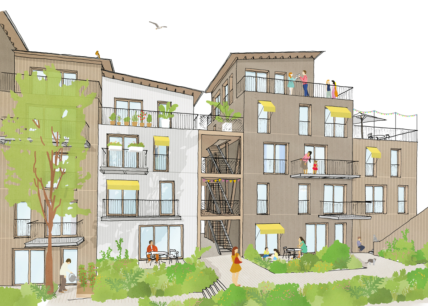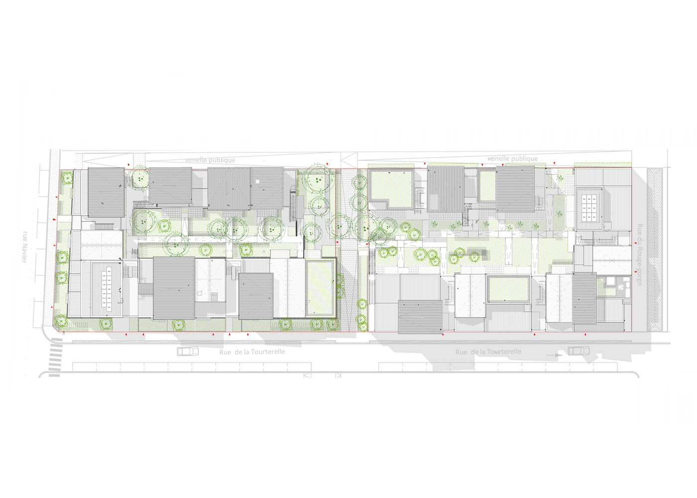 交通流线设置在建筑外部的空隙处,这使得建筑立面能够线性地呈现出序列感和动态感。这些空隙的存在增强了街区中心与公共空间之间的通透性。不同高度平台上的多个出入口以及所有建筑的嵌套布局,有助于降低人们对建筑密度的感知。这种布局原则也使得居民能够更好地使用不同的住宅单元。