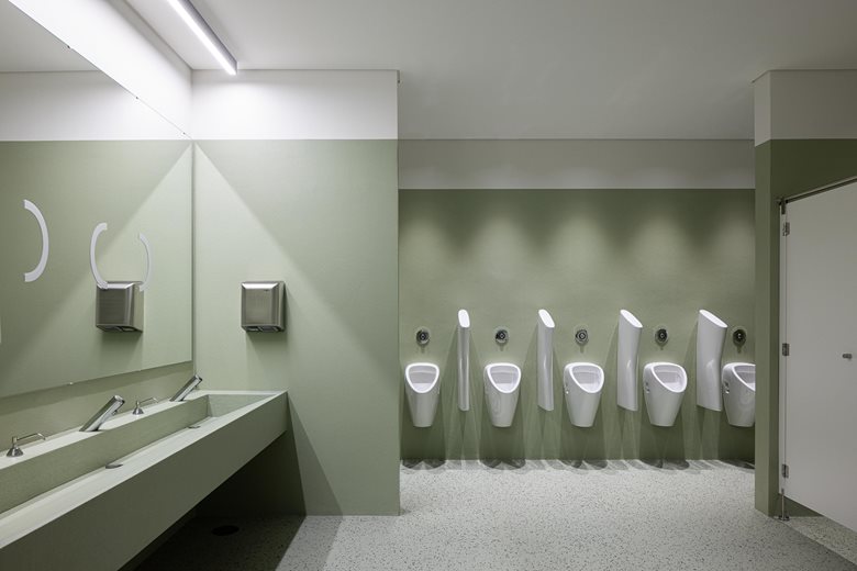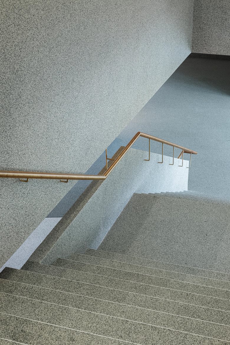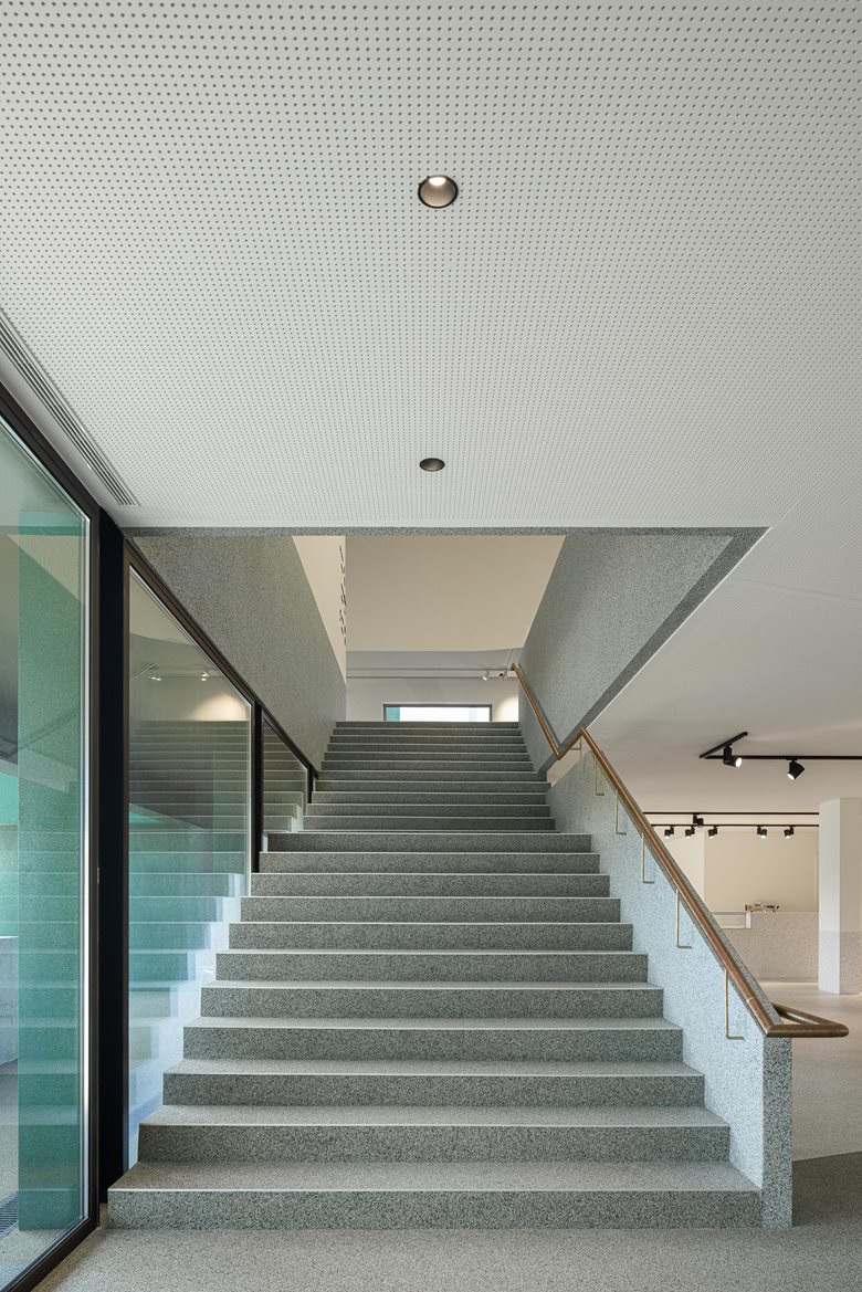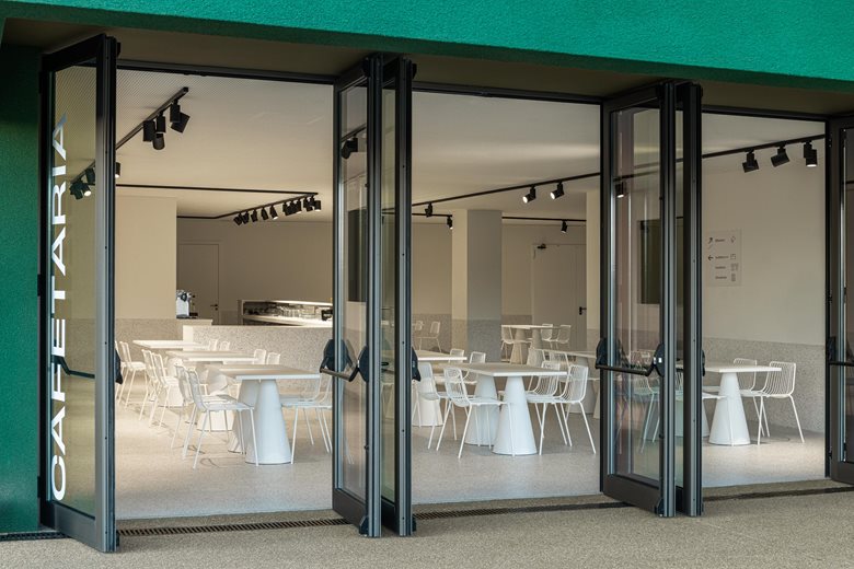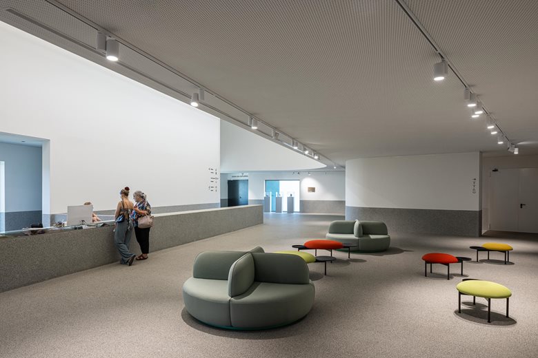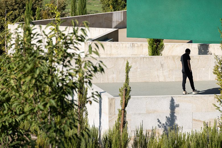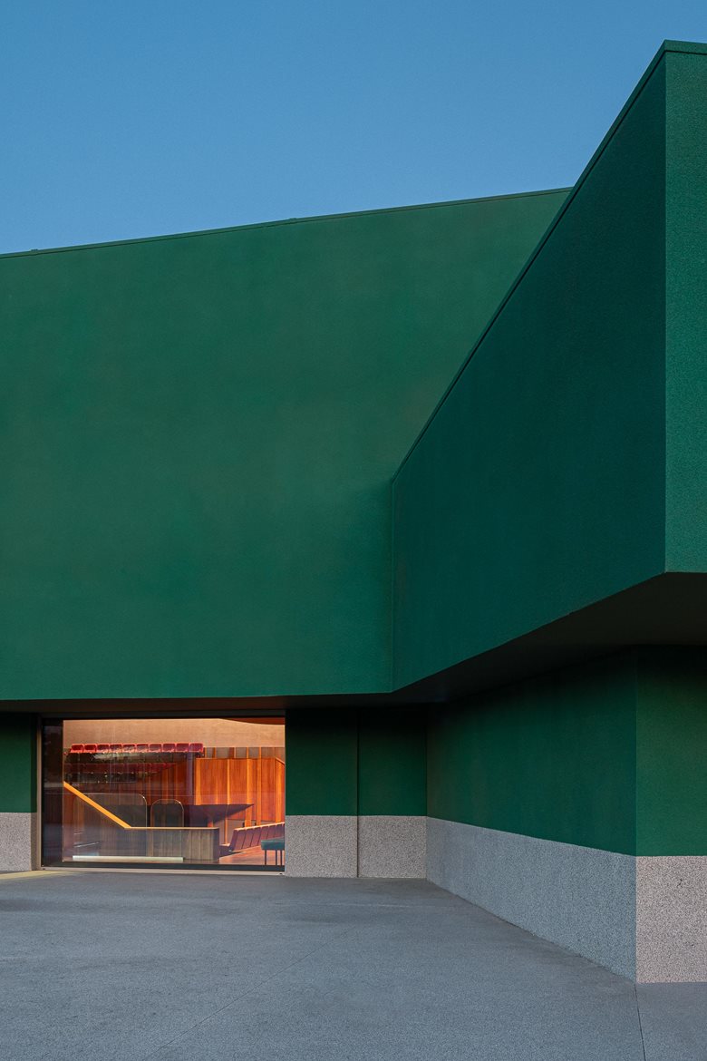 面对建筑较大的体量与场地的地形高差,设计团队采取了“主动隐匿”的智慧策略——将建筑巧妙嵌入绿植与木兰树丛之中,让人工造物与自然景观形成“你中有我”的共生关系。而贯穿建筑设计的“绿色基因”,则成为连接建筑与自然的视觉纽带:建筑外立面采用的大胆绿色调,并非突兀的装饰,而是与周边植被形成呼应的“生长色”,随着时间推移,这抹绿色将逐渐与自然融为一体,让建筑仿佛从土地中自然生长而出。软木材质的运用,为建筑注入了丰富的“视觉弹性”。这种源于自然的材质,会因观察角度的转换与光线的强弱变化,呈现出从温润哑光到细腻光泽的多元质感,使建筑外立面成为一件“可动态解读的公共艺术品”。与此同时,设计团队对原有建筑结构痕迹的保留,让新建筑承载了历史的记忆——旧结构的肌理与新材质的质感相互碰撞,既避免了对城市记忆的割裂,又赋予了建筑全新的时代气质。