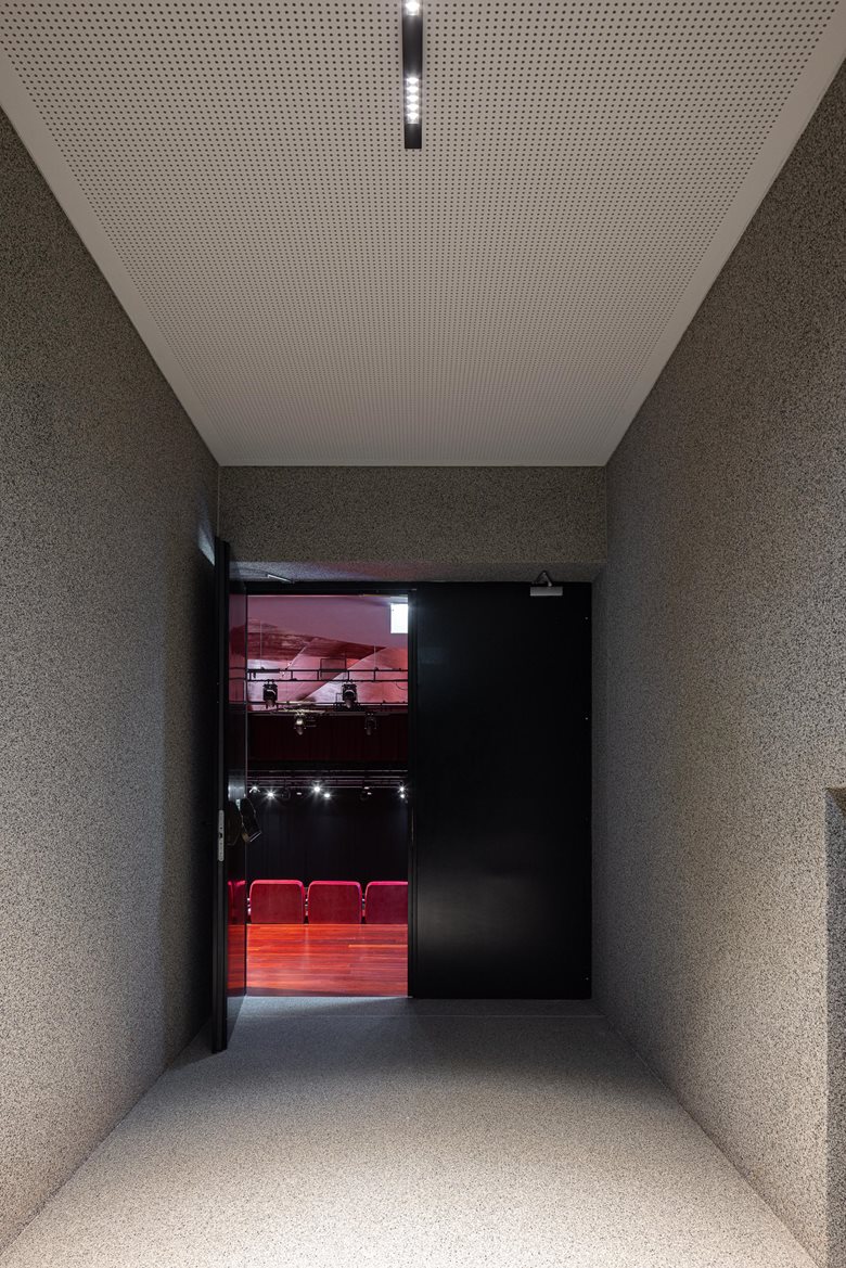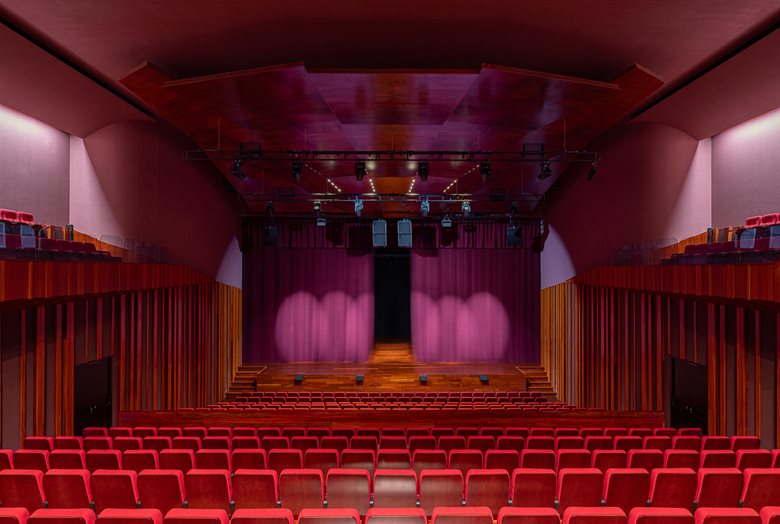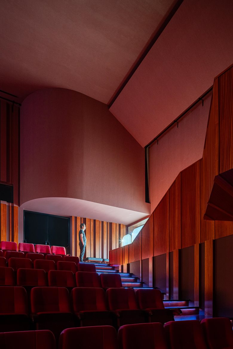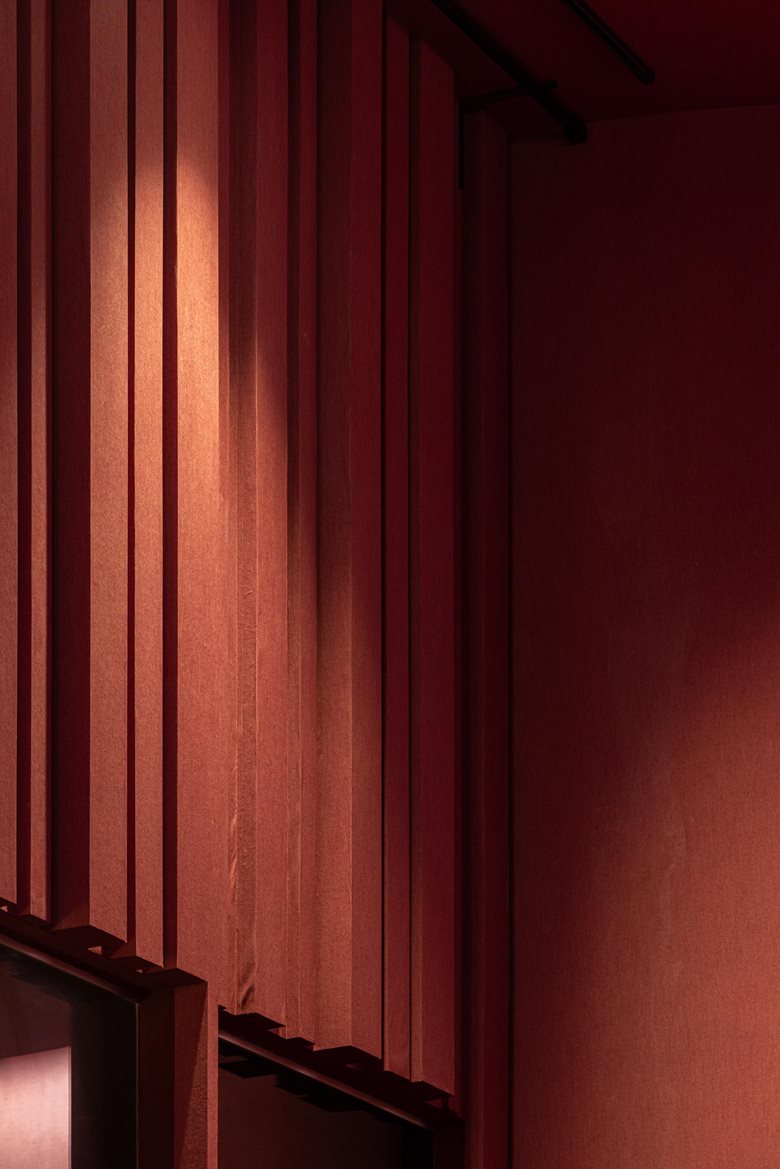 如果说入口广场是温和的“迎宾者”,那么礼堂则以极具仪式感的设计,成为空间体验的高潮。与外部开放亲和的氛围形成鲜明对比,礼堂以深邃的红色调为主色,温暖的色彩包裹着等候的观众,消解了大型公共空间的冰冷感;正式的空间形态与柔和的色调相互平衡,既满足了文化活动的庄重需求,又为访客营造出舒适的体验氛围,让每一次文化参与都成为充满温度的记忆。