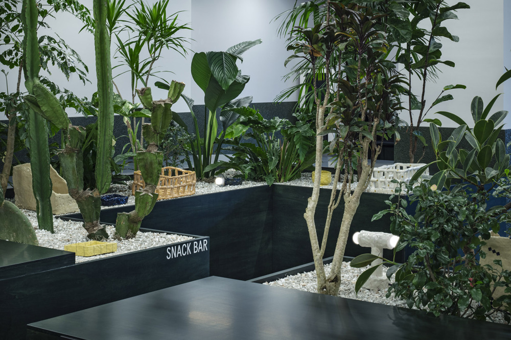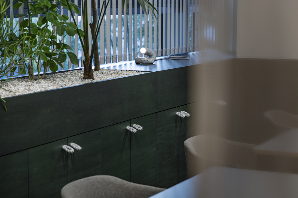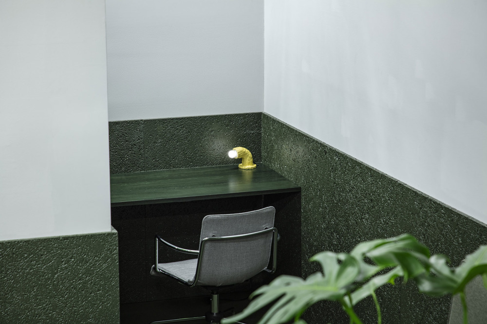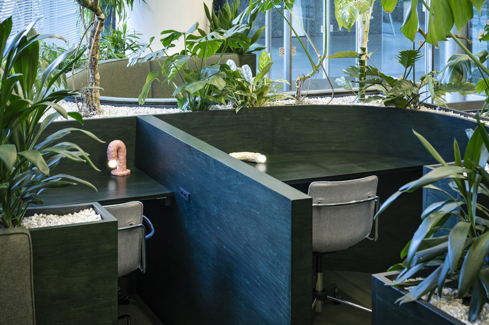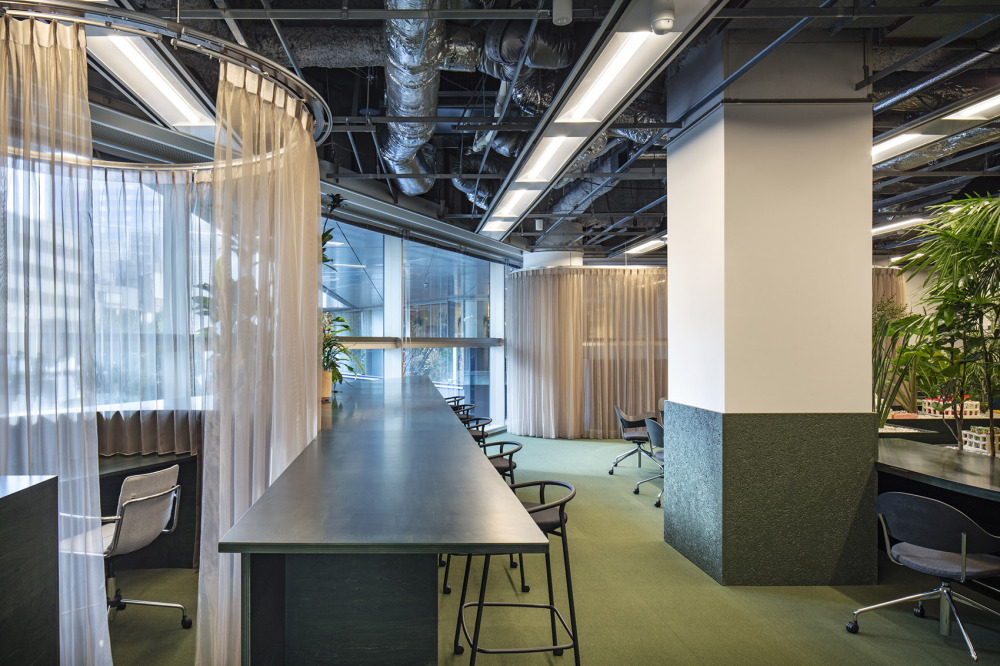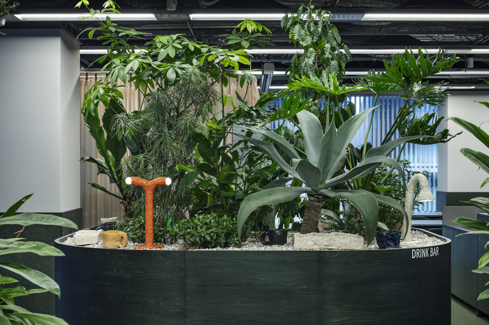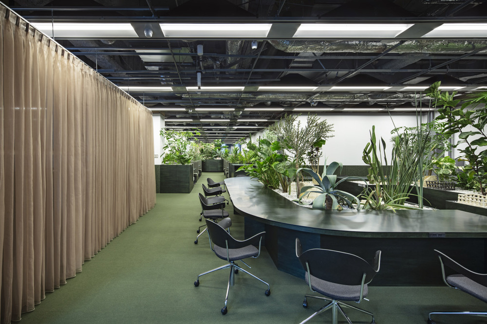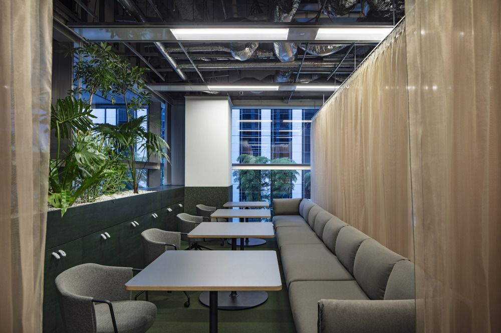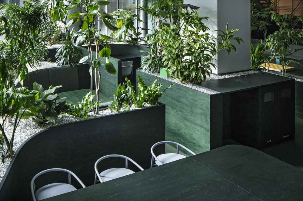 为了让 “专注” 与 “分享” 互不干扰,空间采用 “上下分层” 的视觉与功能划分:通过精确控制家具高度,搭配大量绿植作为 “柔性隔断”,既阻挡邻座视线,又不割裂空间的自然感。绿色家具与地面、植物相融合,营造出 “包裹式的私密感”,员工坐下时能快速进入专注状态,不受周围走动的干扰;视线保持通透,站起时能清晰看到他人的活动,便于发现 “可分享的机会”—— 比如瞥见邻座讨论的主题、看到轻食吧有人分享资料,自然触发交流欲望。这种 “坐下专注、站起共享” 的设计,让两种状态的切换无需刻意移动,更符合自发学习的随意性。
