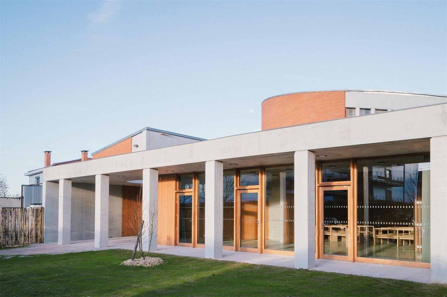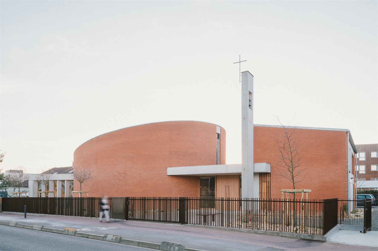 这座砖石单体建筑教堂设计直接借鉴了图卢兹地区标志性的宗教建筑,特别是 “borde rouge”(红边建筑)或 “红色房屋” 这一建筑类型。其独特的造型清晰地彰显了自身的教堂身份 —— 钟楼、十字架和半圆形后殿结构使其在城市肌理中易于识别。它并非一座孤立的纪念碑,而是与周边郊区环境完全融合的一部分,反映了其所服务的教区社区的本质。建筑和景观的设计选择直接受到其城市环境、各种限制条件及邻近建筑的影响。