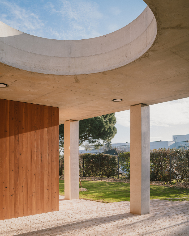 该建筑设计的指导原则是将永恒维度(通过对光线、空间和原材料的精心处理来体现)与时代维度(基于当代礼拜仪式与教区居民体验之间的动态关系)相结合。这座建筑不回避与周围环境的亲近,相反,它拥抱周边环境,将自身定位为向城市及其居民开放的空间。全步行的庭院充当了世俗领域与神圣领域之间的开放过渡地带。车辆入口巧妙地设置在一旁,主入口由一扇大型滑动门和精心设计的景观建筑环绕。围墙融入绿化区域,以减轻其视觉冲击,进一步强化教堂对社区的开放性。
