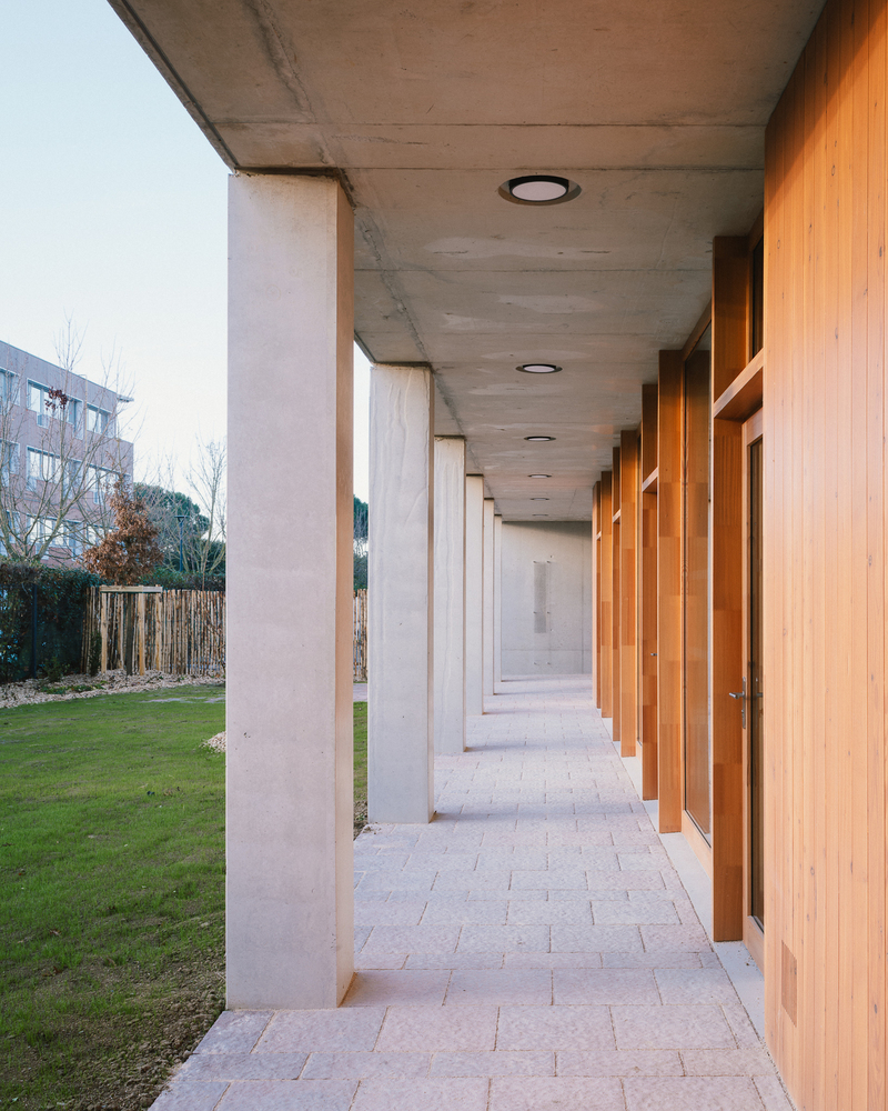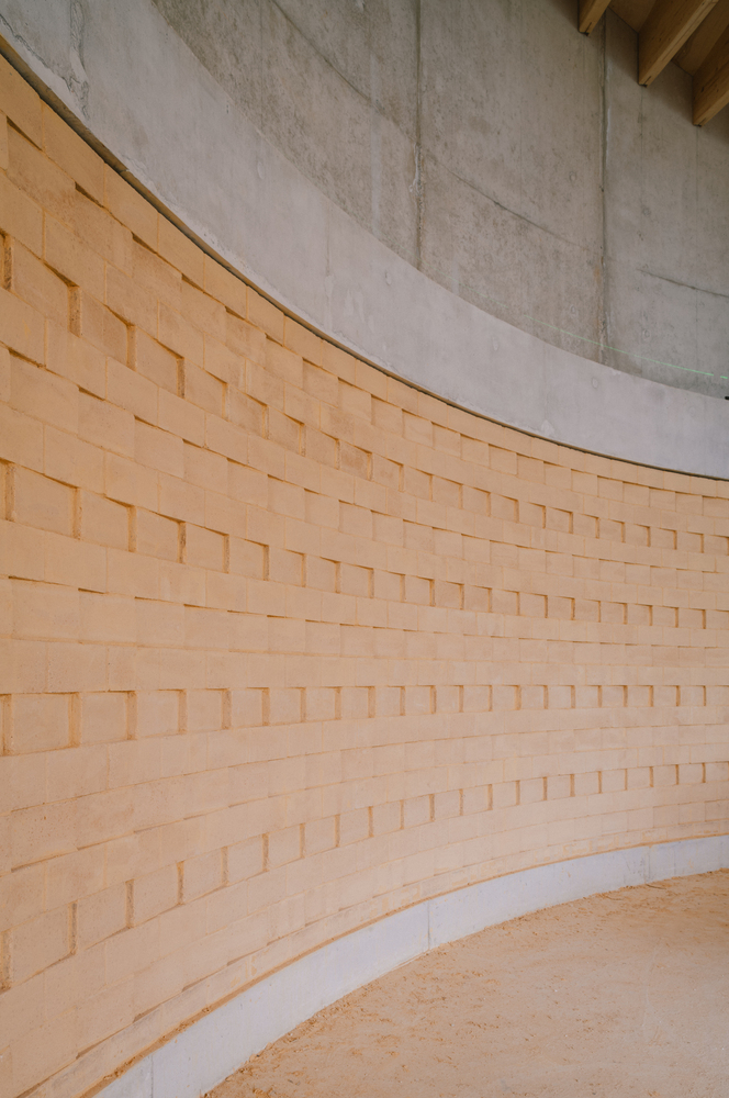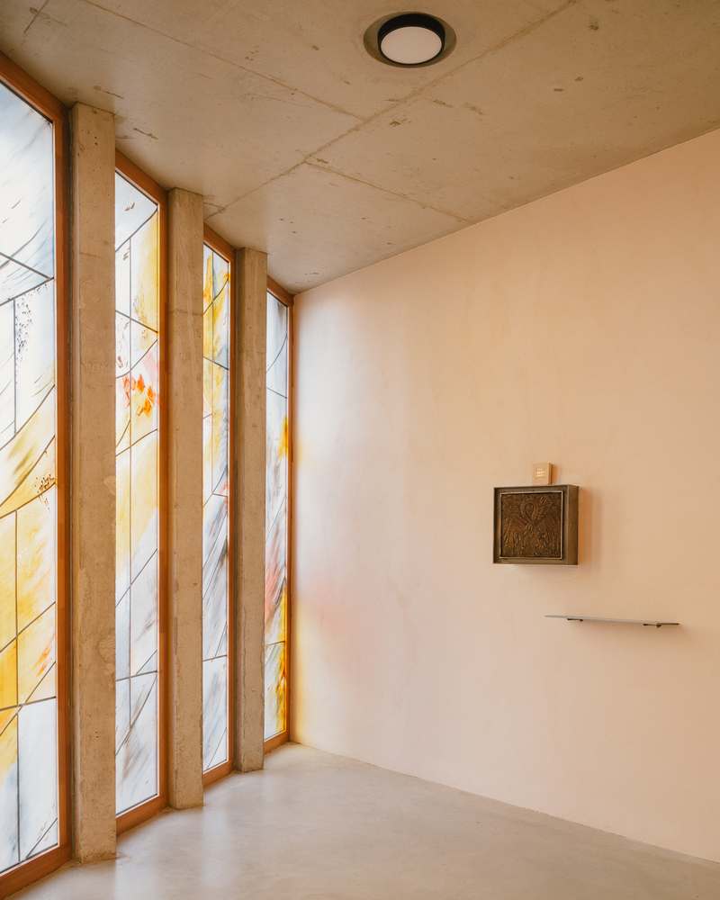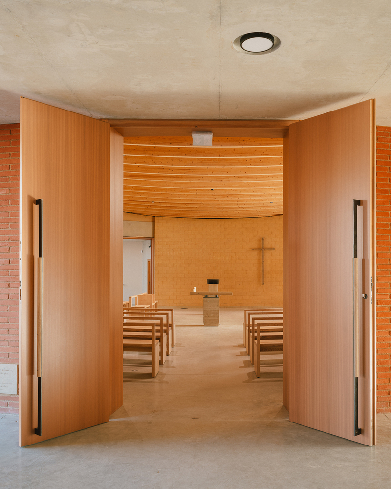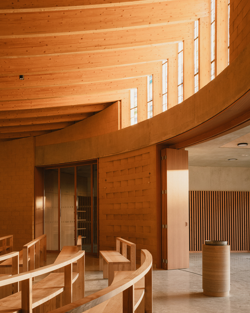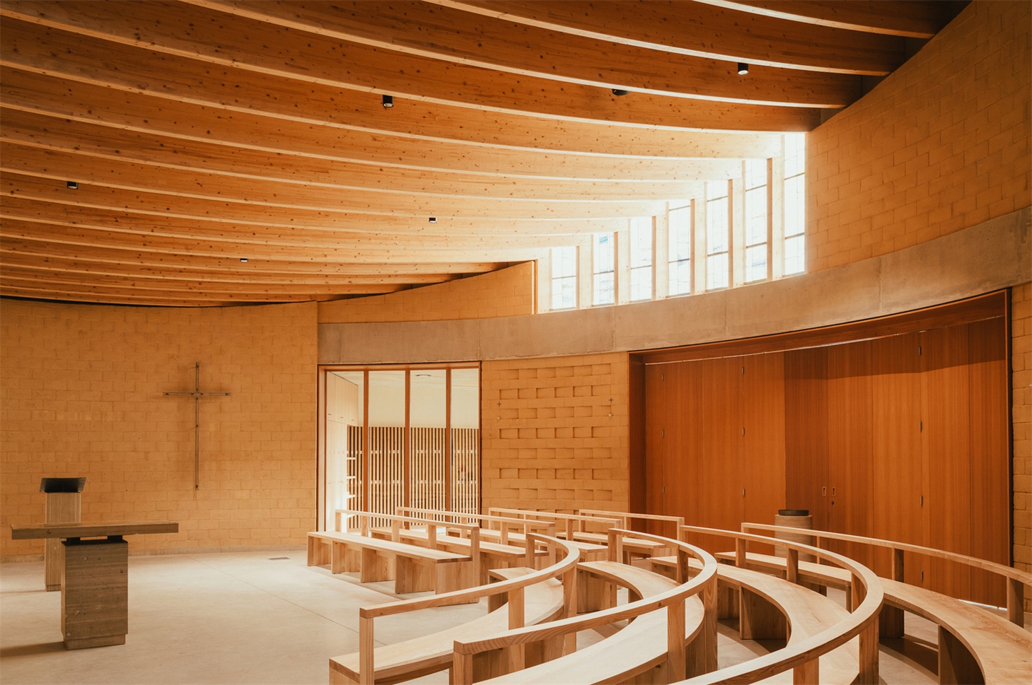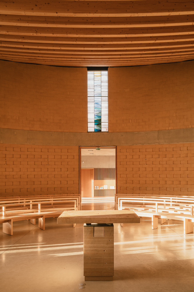 连同接待室、儿童活动空间、辅助用房和花园,一系列横向连通的空间可适应不同的使用需求和聚会形式。建筑的核心 —— 礼拜空间由黏土砖建造,透过彩色玻璃窗的漫射自然光洒满其中。屋顶的木梁让人联想到天与地的经典交汇。室内简约的设计、柔和的光线以及未经修饰的材料色调,营造出一种平和、宁静的精神反思氛围。最后,花园在整体布局中占据特殊地位。它被带顶的长廊环绕,是一个宁静的自然休憩空间。从街道到中庭,再经过大厅和花园,一条清晰的南北轴线引导人们平缓而逐步地进入这个私密而神圣的世界。