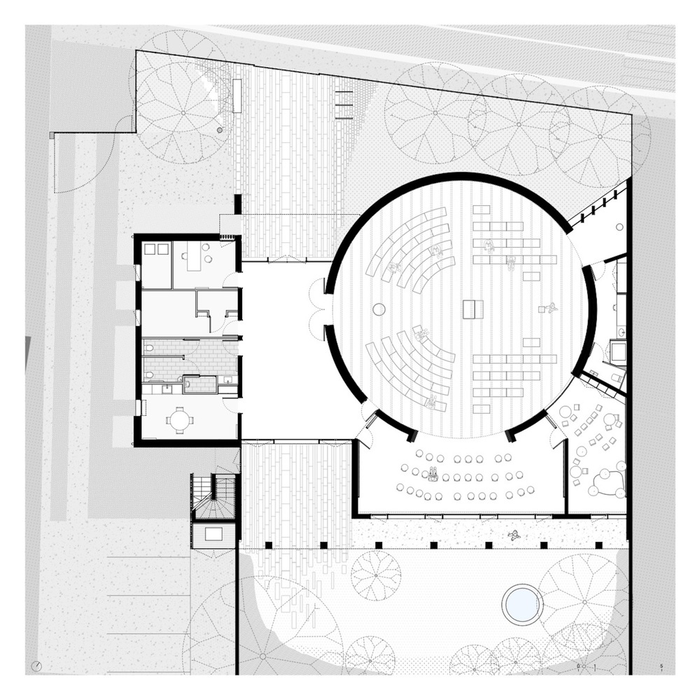 进入教堂后,大厅(或称门廊)成为城市与神圣内部空间之间的宽敞过渡区域。它左侧连接礼拜空间,右侧连接服务和社交用房。这个大厅为非正式聚会和接待活动提供了便利,两侧的屋顶结构拓展了空间的使用范围。大厅尽头的大面积开口通向花园,花园在建筑的多个位置都能被看到,带来空间的延续感与宁静氛围。内部布局有利于互动与体验共享。一道固定隔墙使会议室能够向礼拜空间开放,充当灵活的耳堂。
