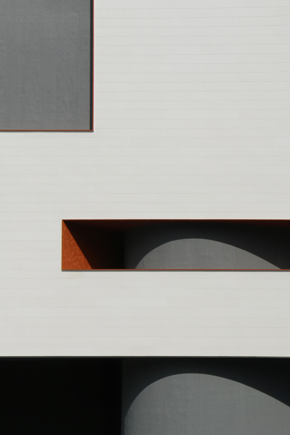 建筑主体以简洁的白色长方体为基底,通过 “挖洞式” 的几何切割,在立面形成大小不一、形态各异的矩形开口。这些开口并非随意的装饰,而是根据内部功能与外部视觉节奏精心布局 —— 大开口对应公共展示区域,小开口服务于私密功能空间,让建筑的 “形式” 与 “功能” 达成了深度统一。几何开口的 “嵌套感” 是设计的另一亮点。锈色金属框作为 “第二层表皮”,嵌套在白色基底的开口边缘,内部又嵌套着灰色的肌理墙面或功能性构件,这种 “框中框、层中层” 的设计,让建筑立面在极简中呈现出丰富的层次,如同立体主义绘画般充满视觉张力。