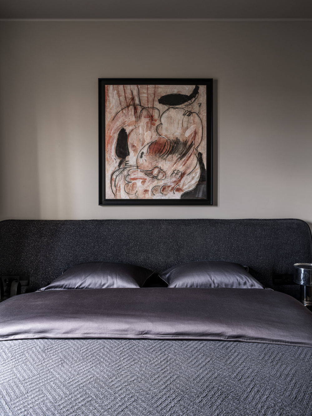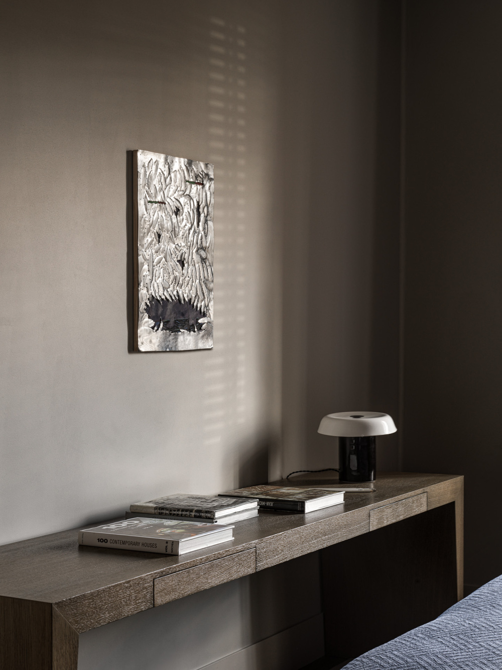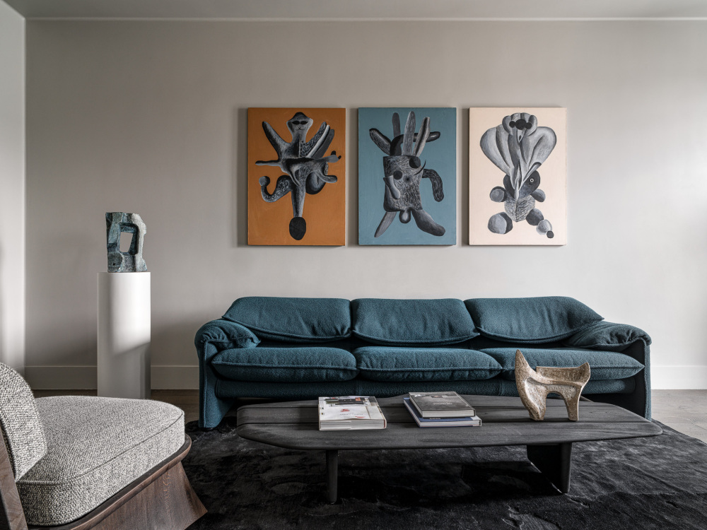 所有家具都以简洁的几何形态呈现,摒弃了多余的装饰。如客厅的异形咖啡桌,其不规则的轮廓与粗糙的木质表面,是功能与艺术的统一,更是 “本真设计” 的直观体现 —— 形式服务于材质的表达,而非空洞的视觉符号。空间中的艺术作品(如抽象画、雕塑)风格简约,却以强烈的形式感与空间形成对话。这些艺术作品并非 “装饰”,而是与天然材料一样,以 “本真的创作”(抽象的表达、手工的质感)呼应着安德烈的设计理念。陈设品(如陶瓷花瓶、石材摆件)同样选择天然材质,数量的克制让每一件都成为空间的 “质感标点”。厨房的不锈钢橱柜与大理石台面,将工业质感与天然纹理融合,既满足了烹饪的功能需求,又以 “材质的纯粹性” 成为空间美学的一部分。这种 “功能即美学” 的设计逻辑,贯穿了整个公寓,让每一处细节都在 “实用” 与 “本真” 之间找到平衡。