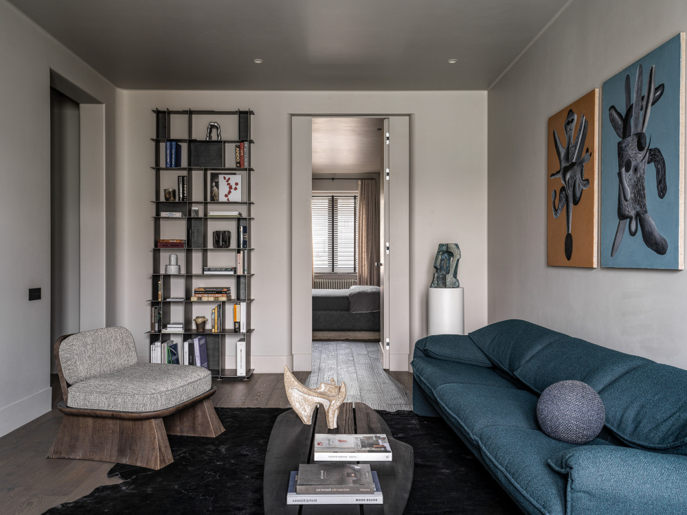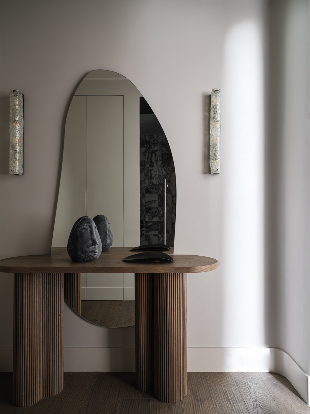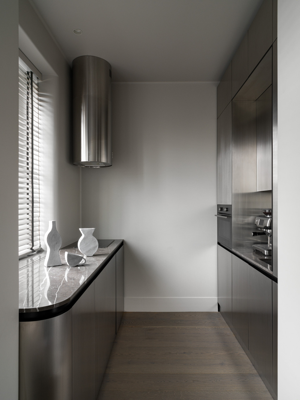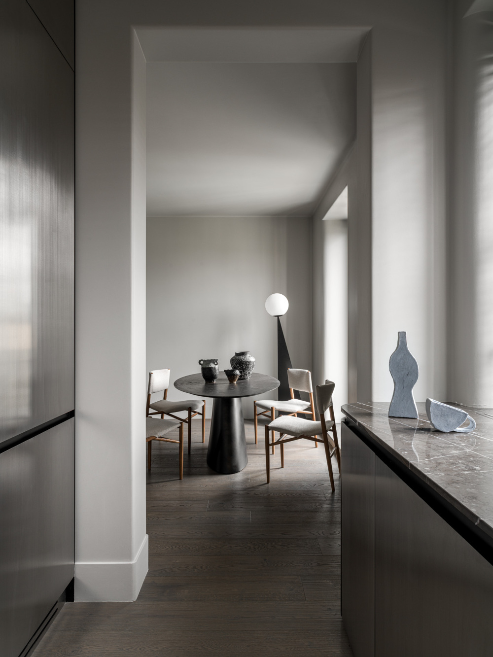 所有家具都以简洁的几何形态呈现,摒弃了多余的装饰。如客厅的异形咖啡桌,其不规则的轮廓与粗糙的木质表面,是功能与艺术的统一,更是 “本真设计” 的直观体现 —— 形式服务于材质的表达,而非空洞的视觉符号。空间中的艺术作品(如抽象画、雕塑)风格简约,却以强烈的形式感与空间形成对话。这些艺术作品并非 “装饰”,而是与天然材料一样,以 “本真的创作”(抽象的表达、手工的质感)呼应着安德烈的设计理念。陈设品(如陶瓷花瓶、石材摆件)同样选择天然材质,数量的克制让每一件都成为空间的 “质感标点”。厨房的不锈钢橱柜与大理石台面,将工业质感与天然纹理融合,既满足了烹饪的功能需求,又以 “材质的纯粹性” 成为空间美学的一部分。这种 “功能即美学” 的设计逻辑,贯穿了整个公寓,让每一处细节都在 “实用” 与 “本真” 之间找到平衡。