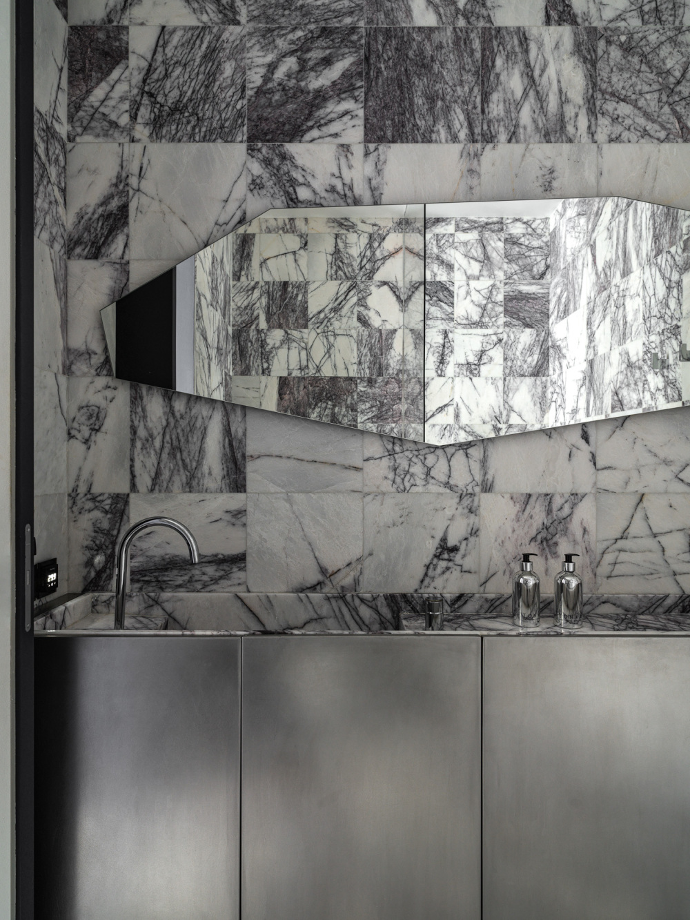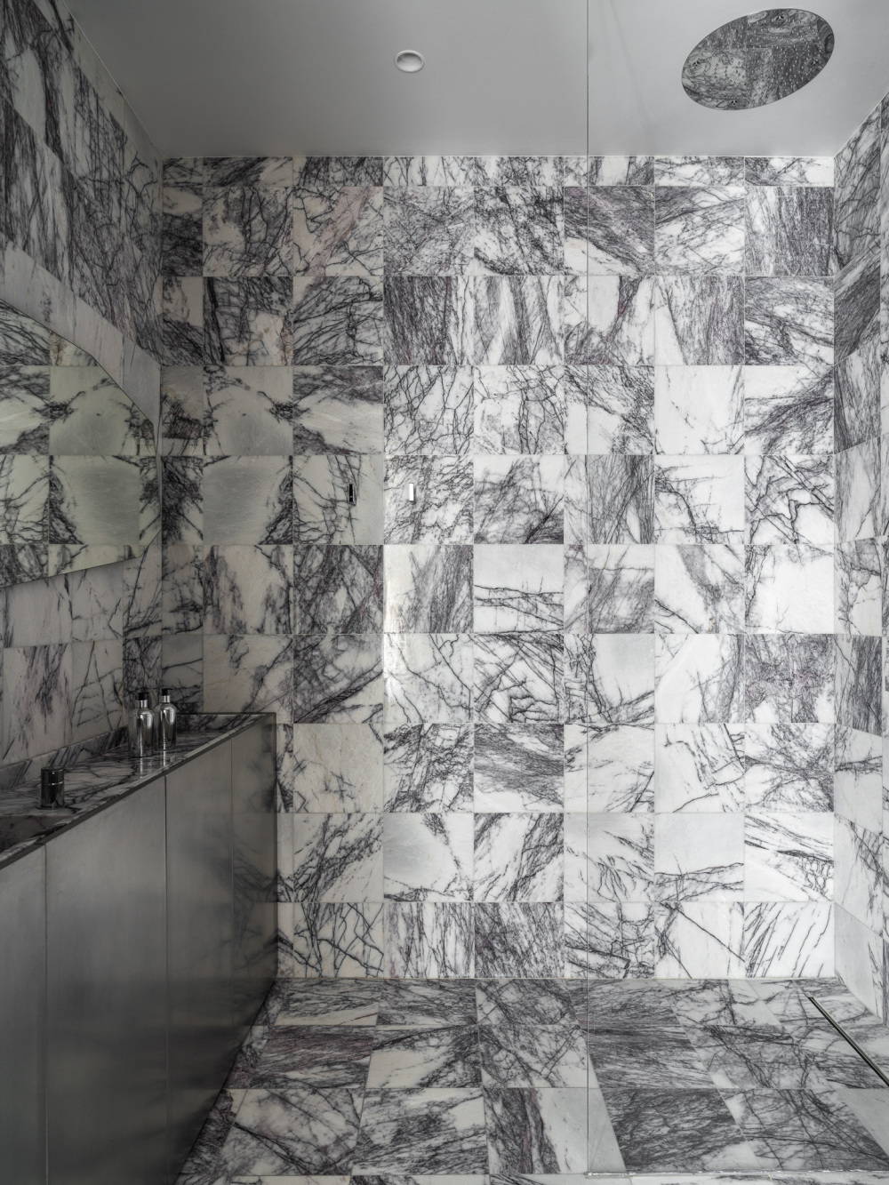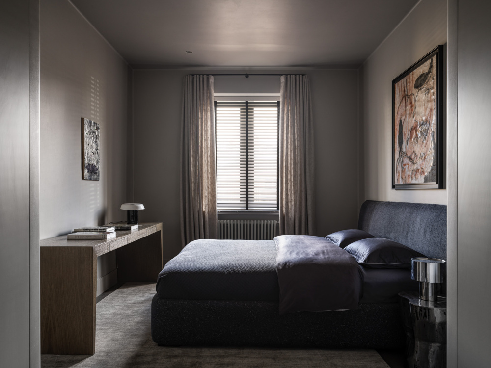 烟熏橡木木地板的深棕色调与天然纹理,为空间奠定了温暖的基底。其表面的做旧处理,不仅增强了 “可触摸” 的粗糙质感,更呼应了建筑的历史属性,让每一步踩踏都成为与自然的对话。定制的木质家具(如玄关桌、卧室书桌)延续了木材的天然纹理,工艺的简洁性让材料本身的美感成为焦点。浴室的大理石墙面与地面,以其黑白交织的天然纹理形成强烈的视觉冲击。这种 “野性” 的石材质感,与金属卫浴设施的冷硬形成对比,却又在 “天然本真” 的维度上达成统一 —— 大理石的纹理是自然的鬼斧神工,金属的冷冽是工业的纯粹表达,二者的碰撞让浴室成为空间中极具戏剧性的 “质感实验场”。客厅的深蓝色布艺沙发、卧室的亚麻床品,以柔软的触感中和了木材与石材的硬挺。这些织物的选择摒弃了花哨的图案,以纯色与天然纤维的质感,践行着 “纯粹本真” 的设计理念,让空间在视觉的极简中,保留了触觉的丰富层次。