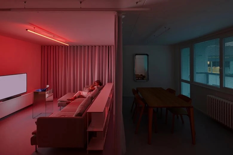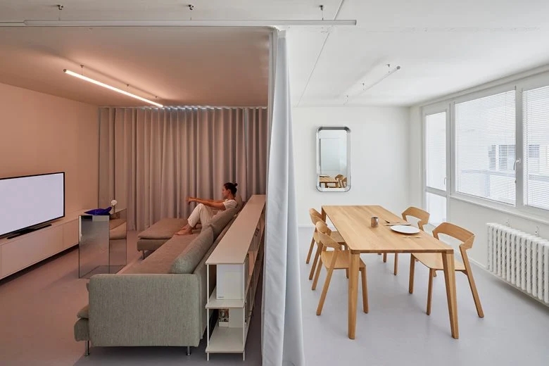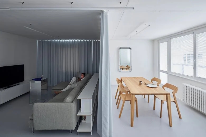 窗帘后面出现了一个自己的世界。这不仅仅是一个使用遮光窗帘几乎完美遮挡阳光的卧室。它还可以是一个电影院。如果你戴着耳机看电影,周围走动的人可能都不知道有一场喧闹的动作戏正在上演。电影仍在室内放映,不会打扰那些不想看也不想听的人。他们可以准备午餐或晚餐,然后安安静静地吃,或者像在墙后面一样相互交谈。相互结合的情况和场景有很多。薄薄一层膜后面的两个世界是相连的,但是,只要相互尊重,它们也可以很好地独立运行。当窗帘拉开时,这里是一个经典的客厅,有厨房和餐厅,一家人团聚在一起。这时,窗帘不仅是一种体面的装饰,还能改善大房间的隔音效果。