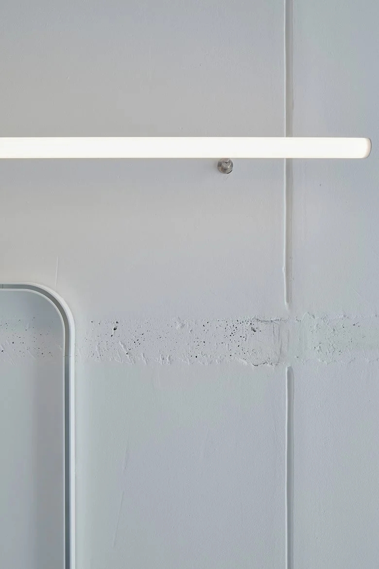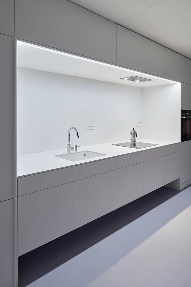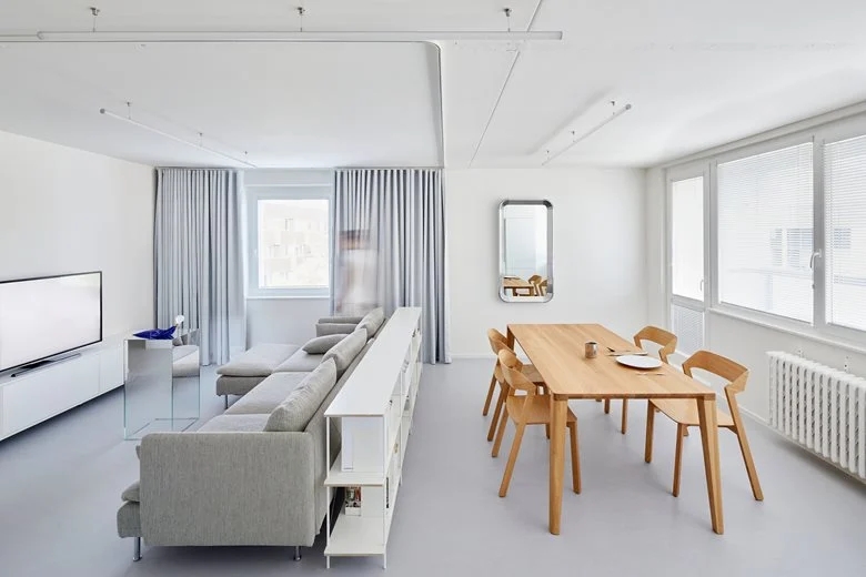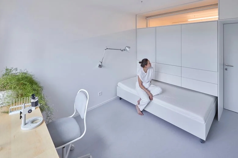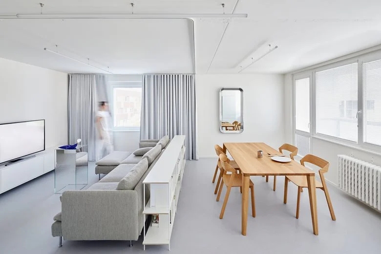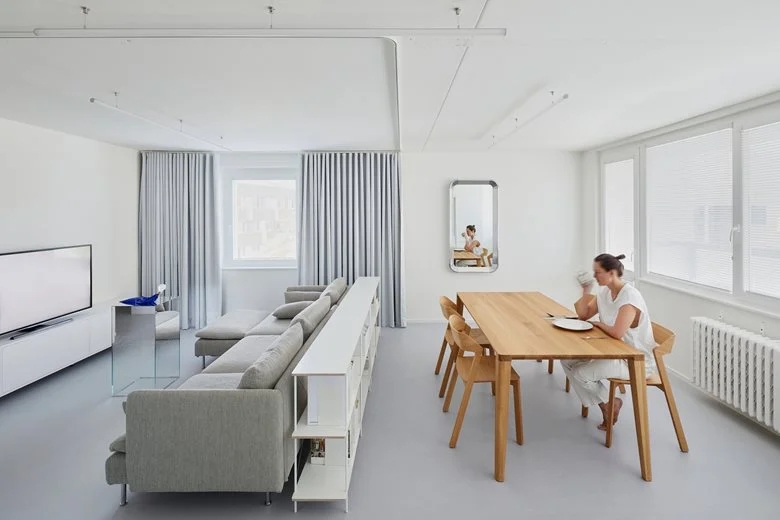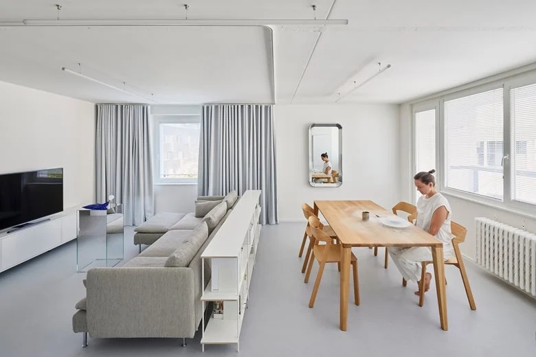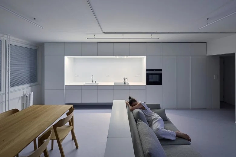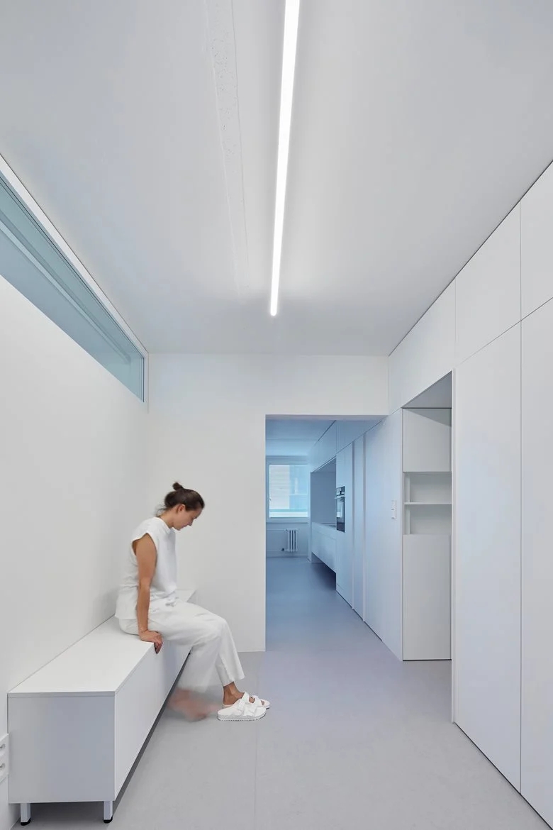 如果暂时需要更大的空间,例如锻炼身体,整个床都可以移到桌子下面,桌子没有腿,固定在墙上的钢支架上。通过衣柜上方的天窗,阳光可以照射到入口大厅和浴室。在老式混凝土预制公寓中,这些空间很少有阳光。不过,房间的主人可以在必要时通过天窗上方的遮光百叶窗来控制反方向的光流。从地板到天花板,整套公寓由统一的线性白色实用家具组成。它整合了厨房、大量储藏空间、洗衣机和烘干机空间以及独立卫生间。