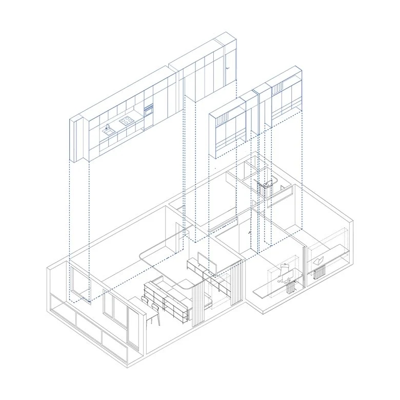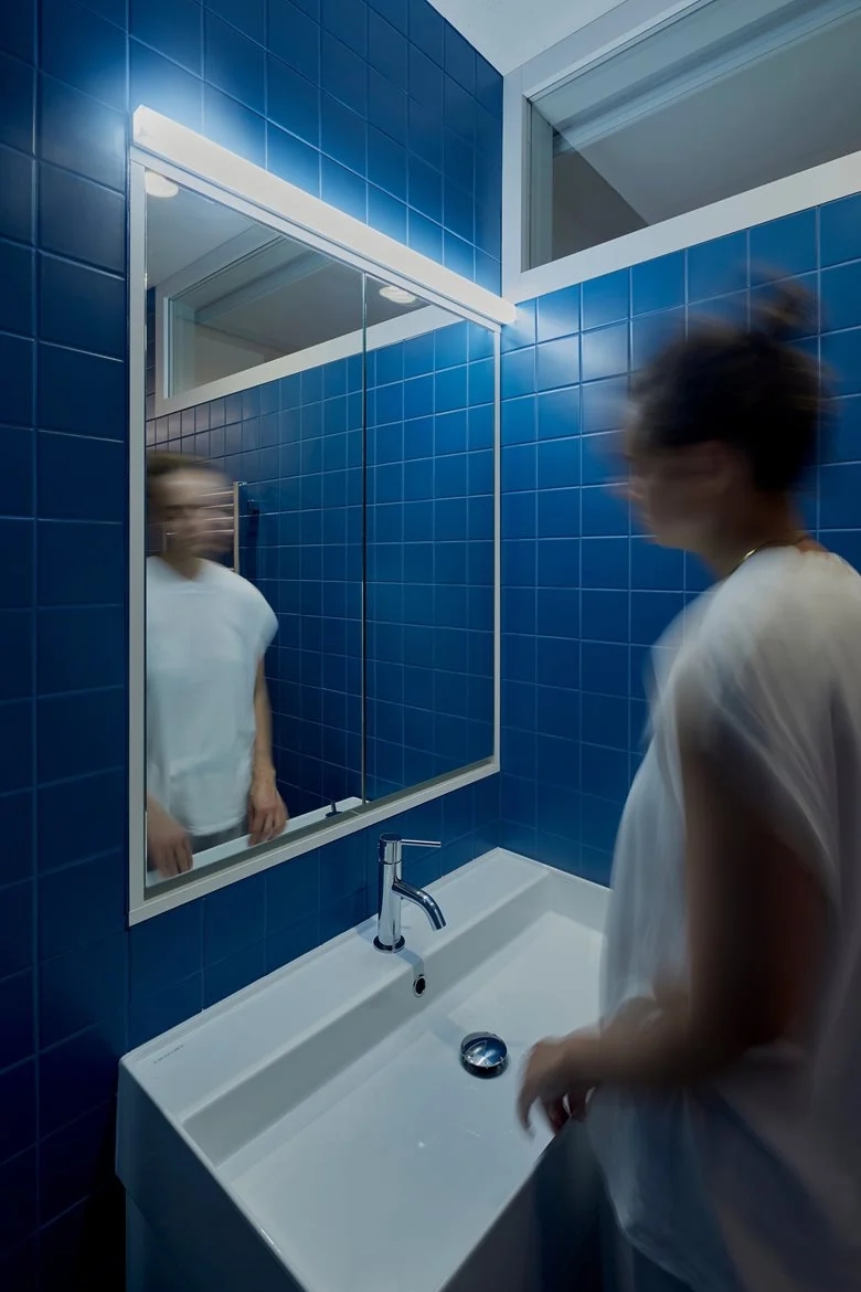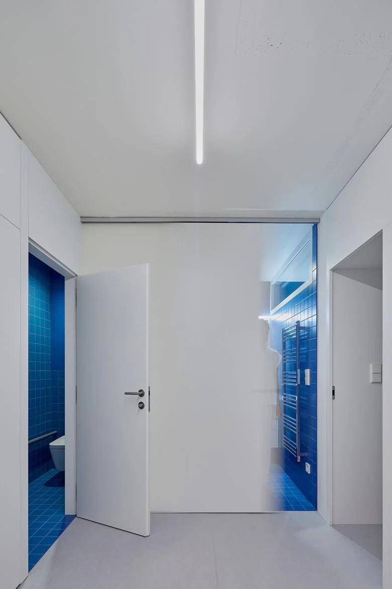 它就在每个壁橱、厨柜、厕所或浴室里。蓝色是一种装饰品,它随着家庭家具中存放的各种设备而展开。第二层装饰不那么显眼,但也能找到。它是混凝土结构板的接缝和拆除隔板后经过处理的 “伤疤”。它们与原有的仍在正常运行的散热器或供暖系统管道类似,共同代表了原有预制混凝土板公寓的记忆和特征。我们的目的不是要隐藏它们,也不是要把它们当作丑陋的东西。预制混凝土板式公寓没有什么可羞愧的。它们是其本质的一部分。